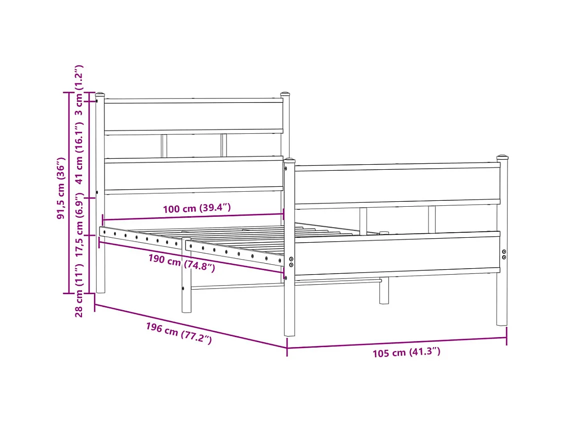 Lit simple | Lit adulte, enfant | Cadre de lit avec tête de lit et pied de lit 100x190 cm