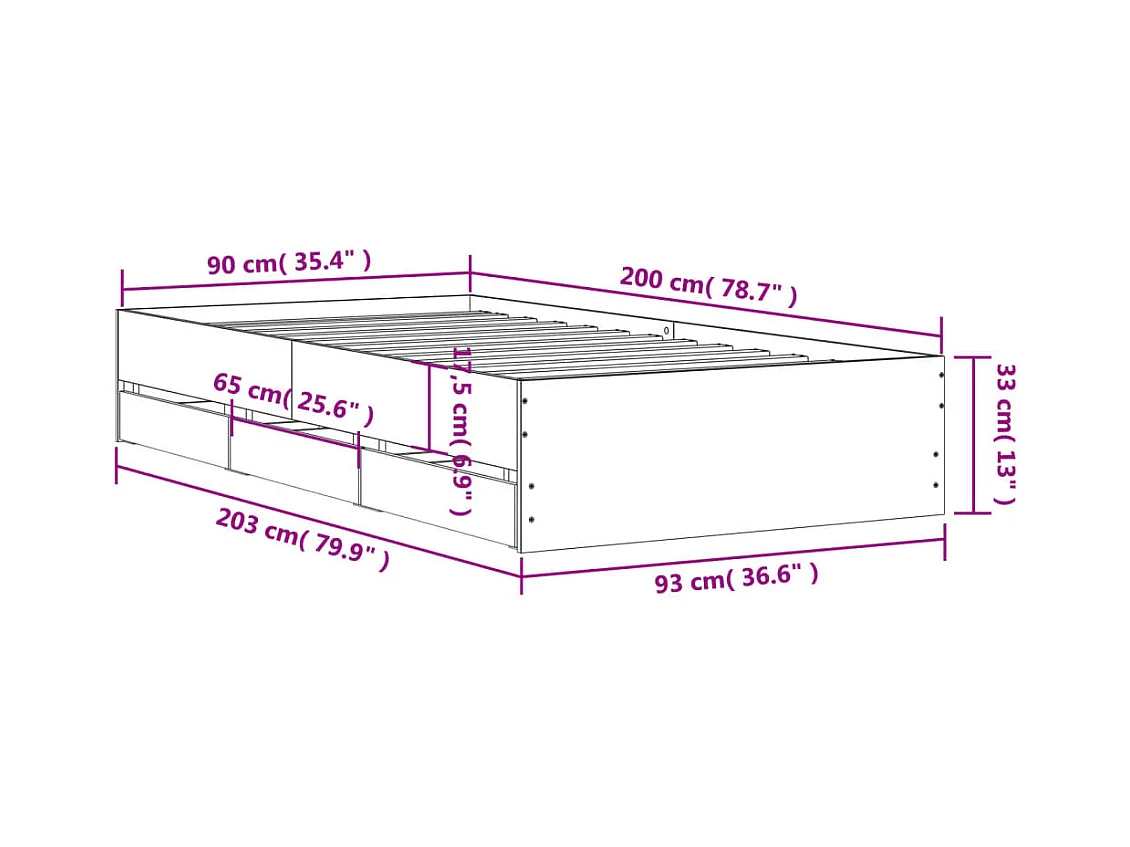 Lit simple | Lit adulte, enfant | Cadre de lit avec tiroirs chêne fumé 90x200 cm