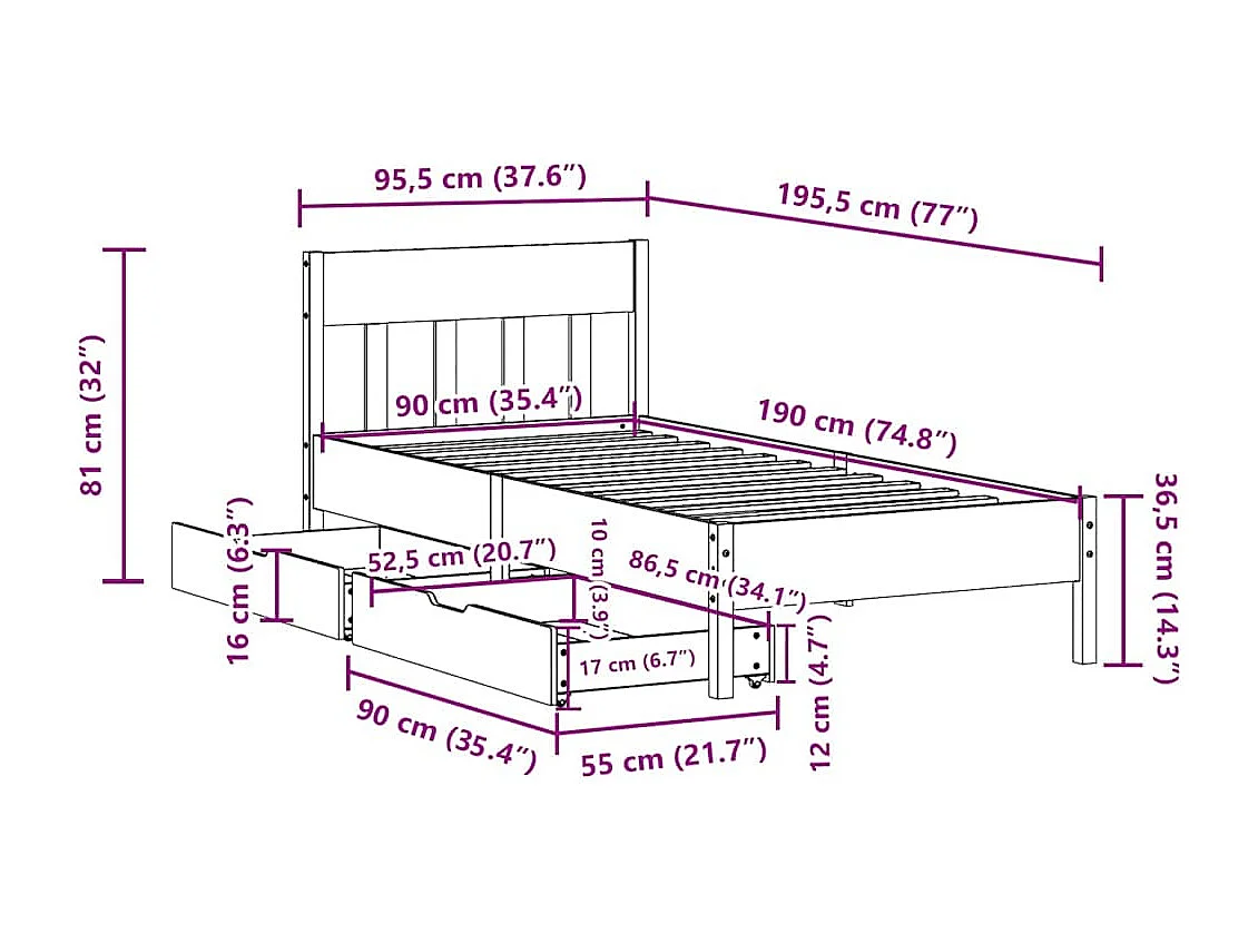 Lit simple | Lit adulte, enfant | Cadre de lit blanc 90x190 cm bois de pin massif