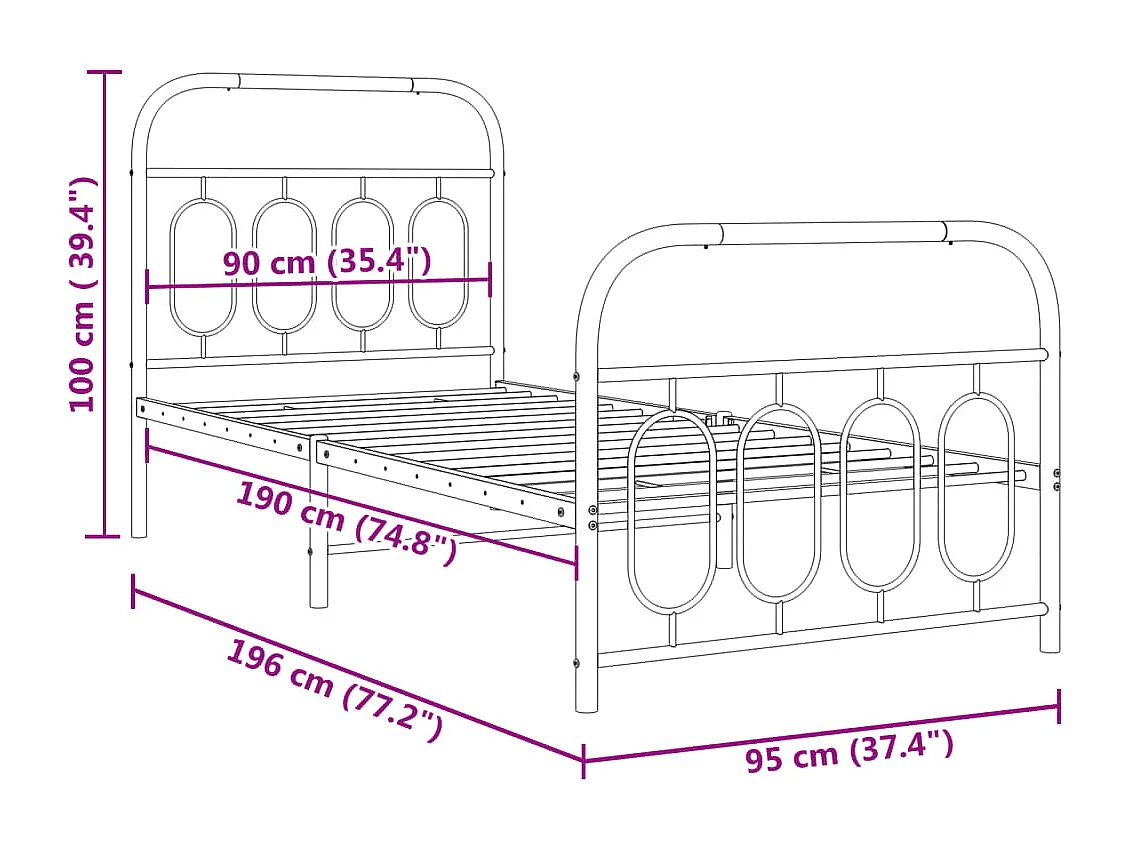 Cadre de lit métal sans matelas avec pied de lit noir 90x190 cm
