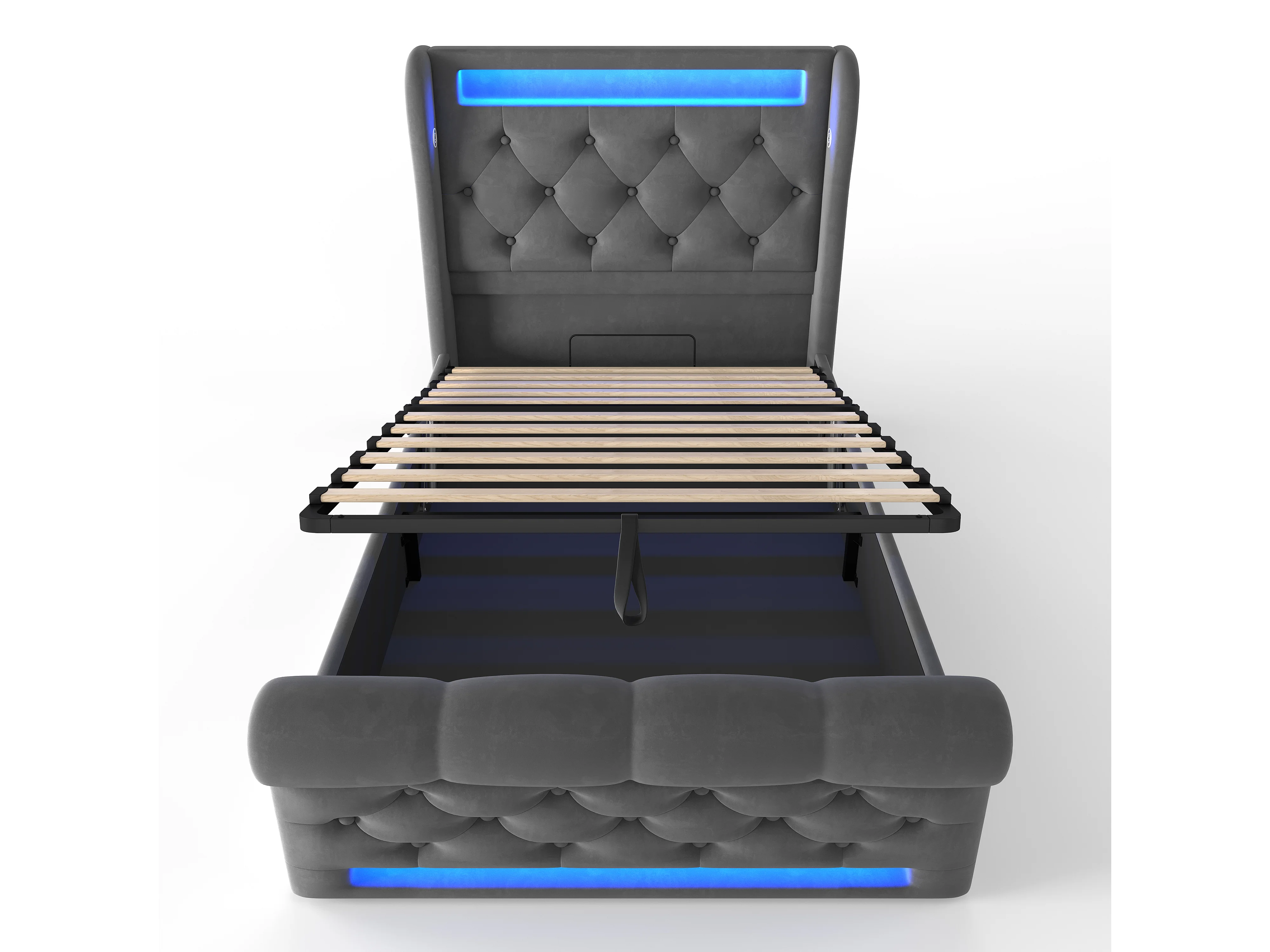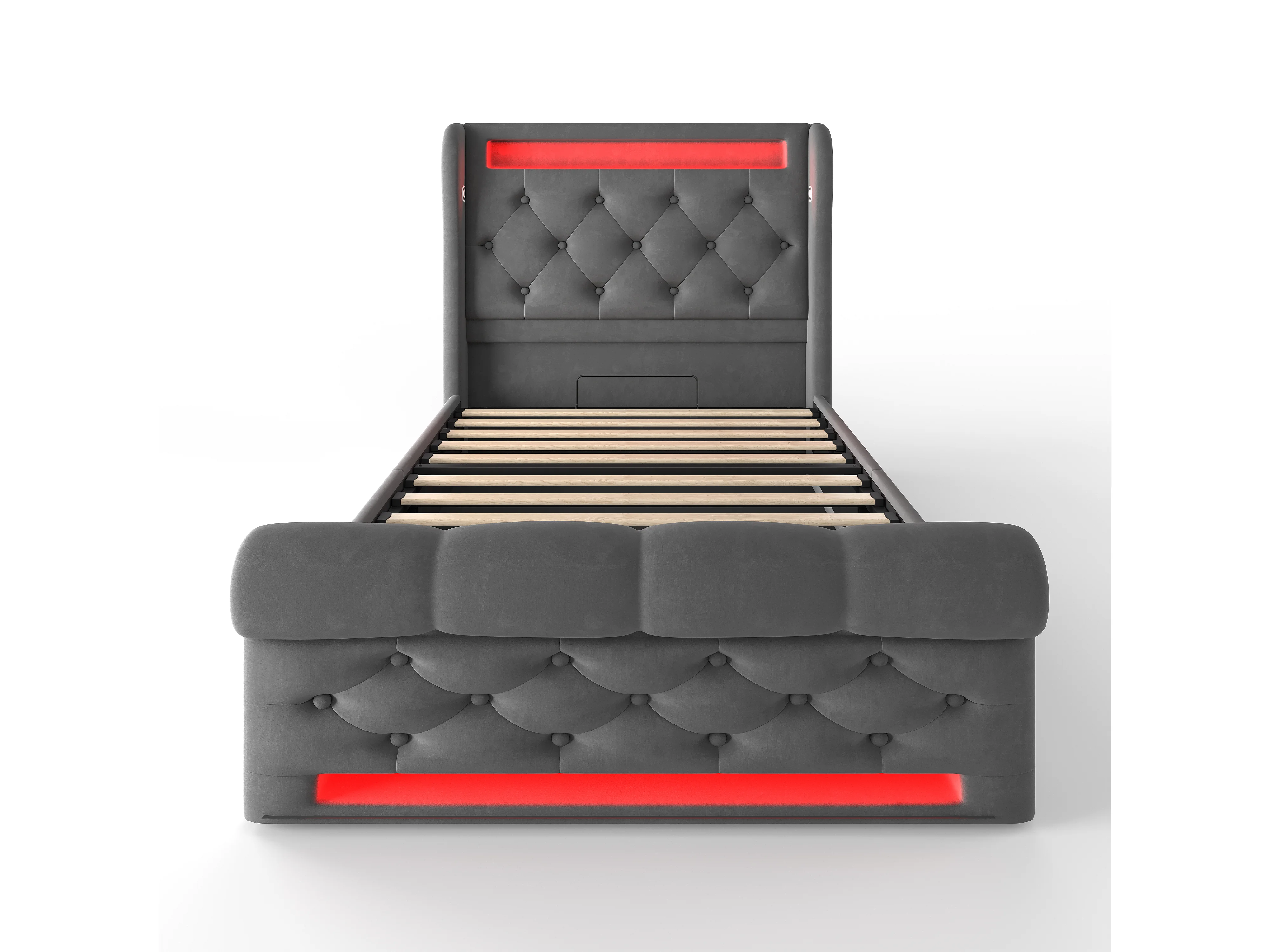 Lit simple pour adulte 90 x 200 cm, avec éclairage LED, ports USB et Type-C, système hydraulique,gris, velours