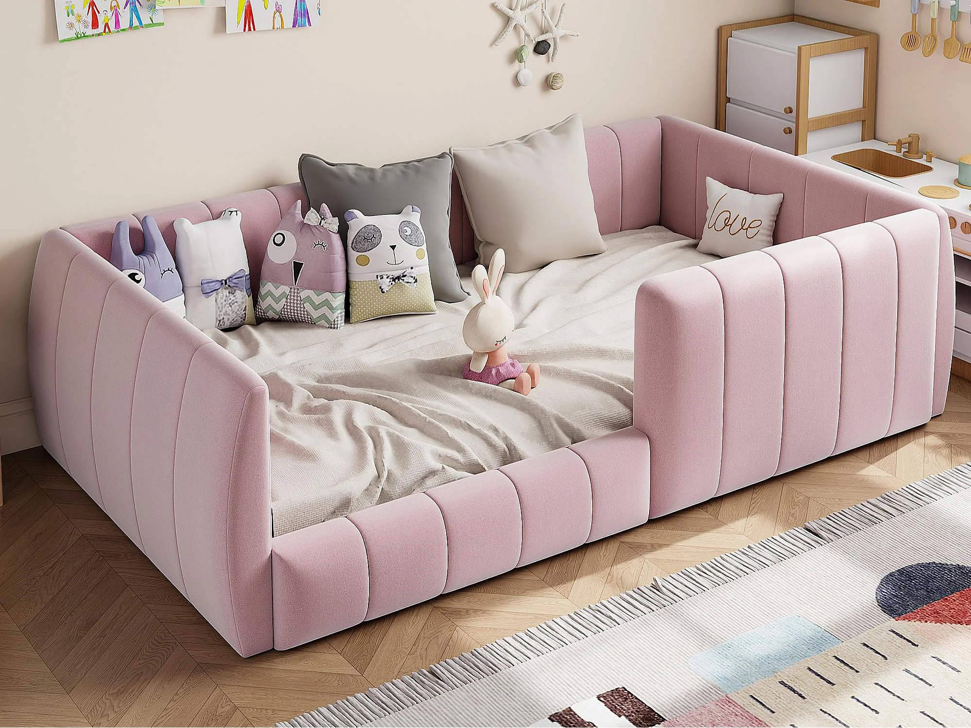 Lit simple rembourré 90x200 cm - avec barrières de sécurité - avec sommier à lattes - MDF + Lin - Rose(sans matelas)
