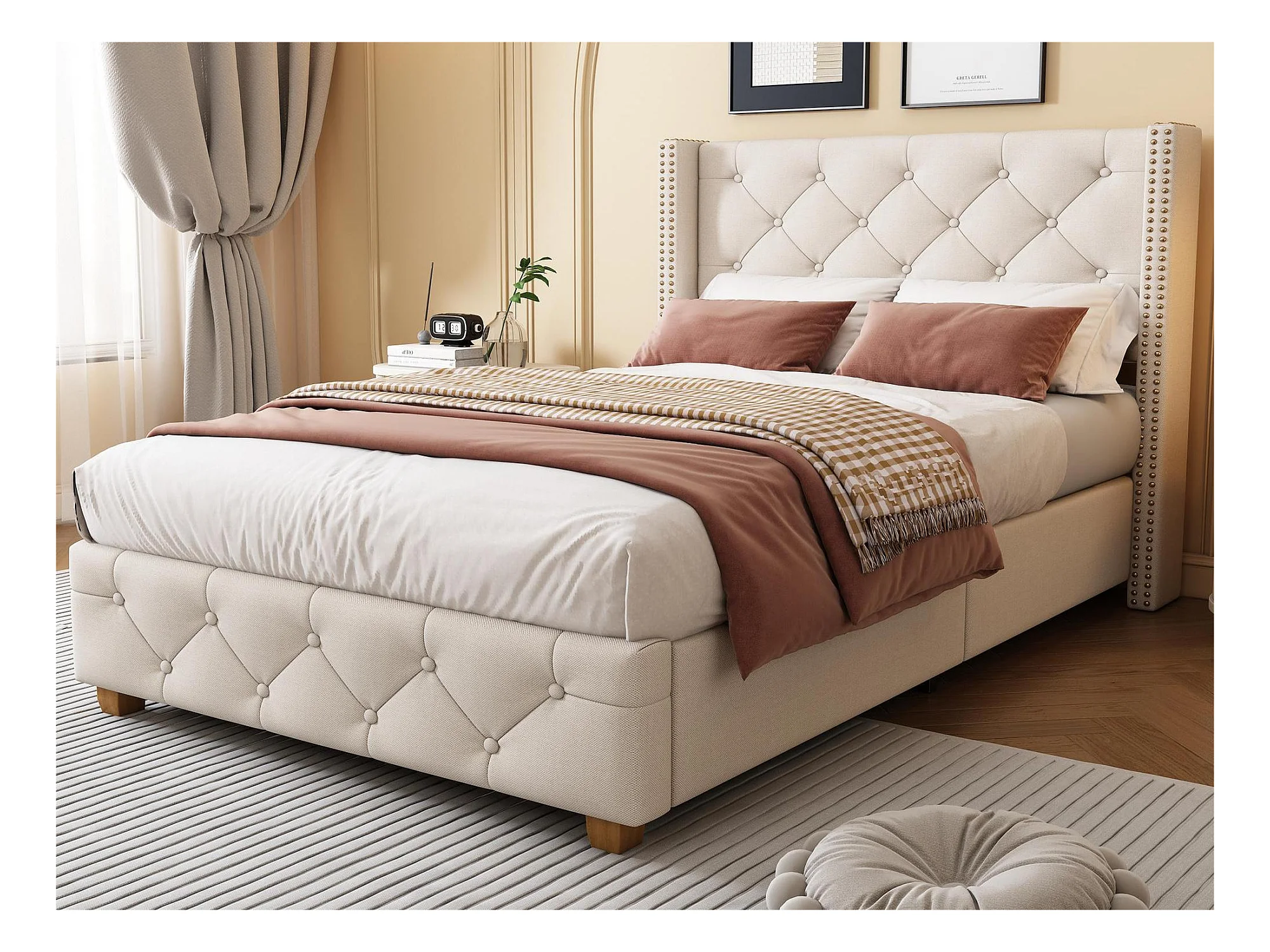 Lit simple rembourré en lin - 90x200 cm - avec sommier à lattes - Beige