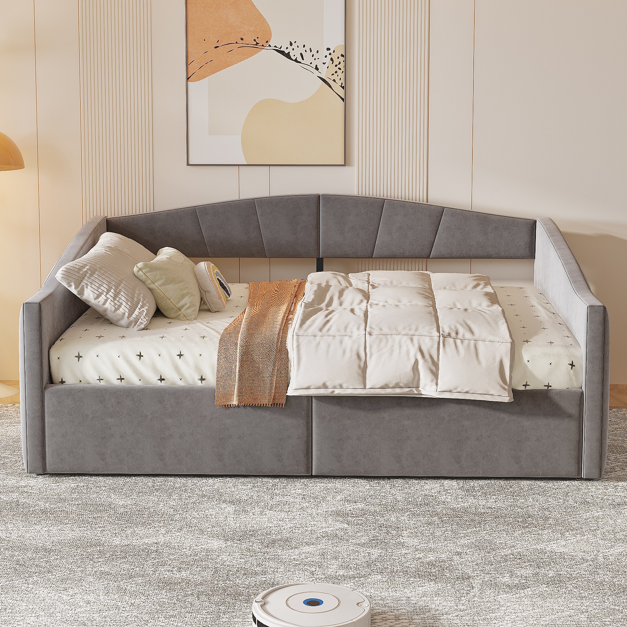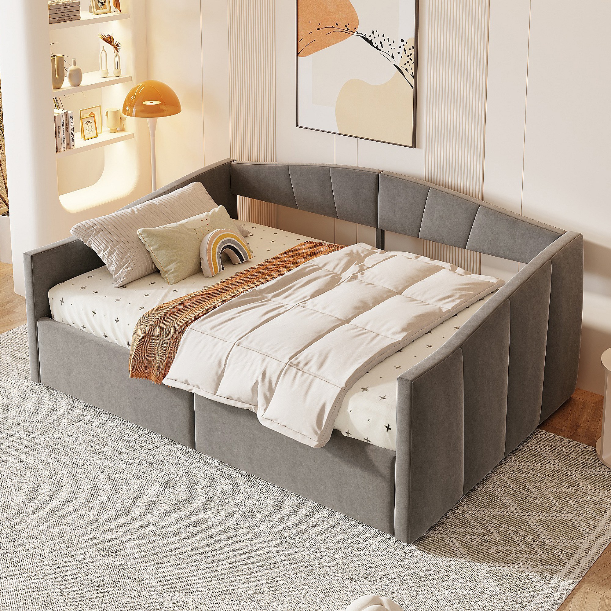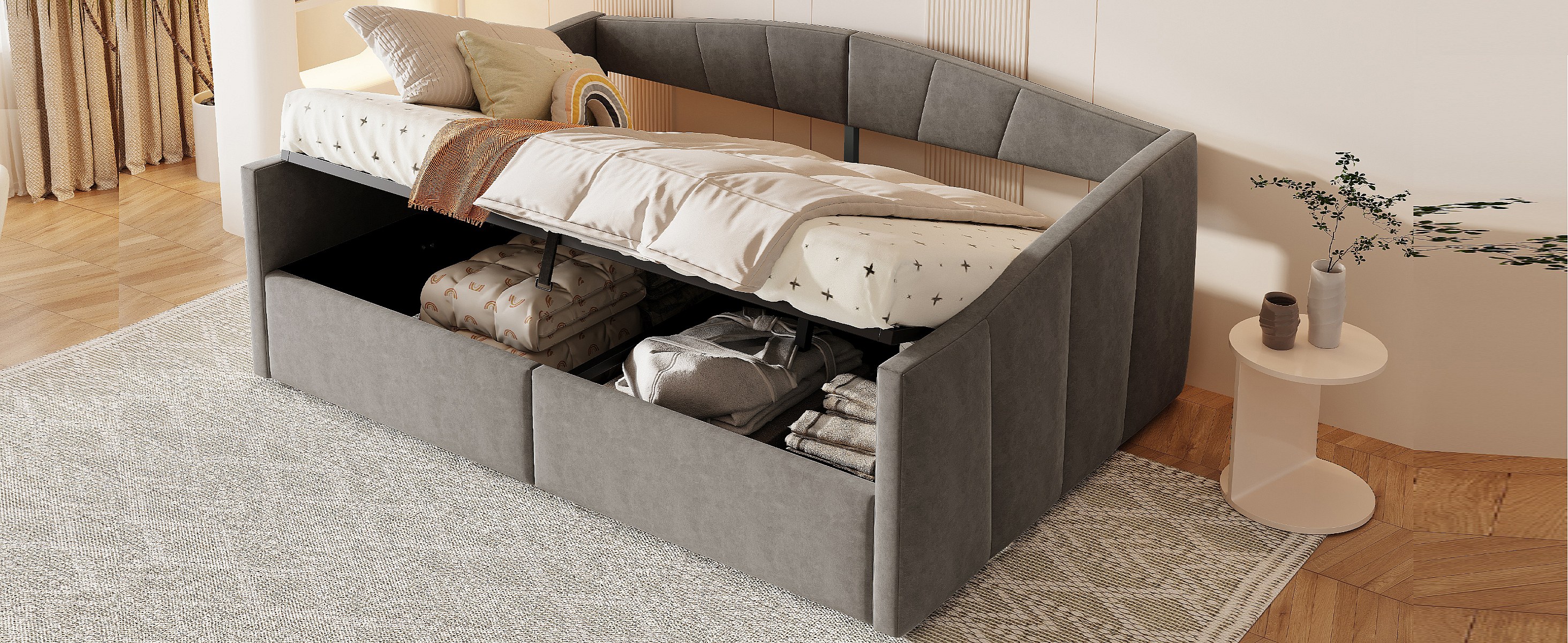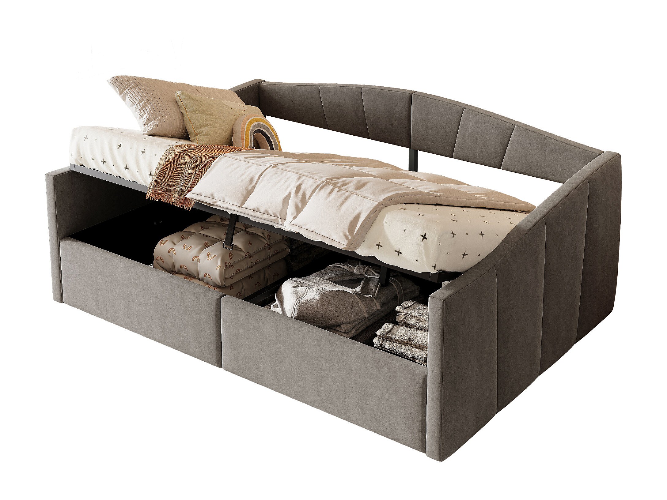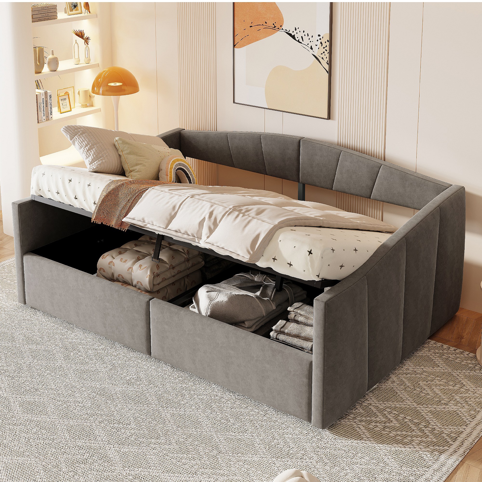 Lit/Sofabett 140×200 cm, avec rangement hydraulique, tissu en velours gris, barrière de sécurité et accoudoirs