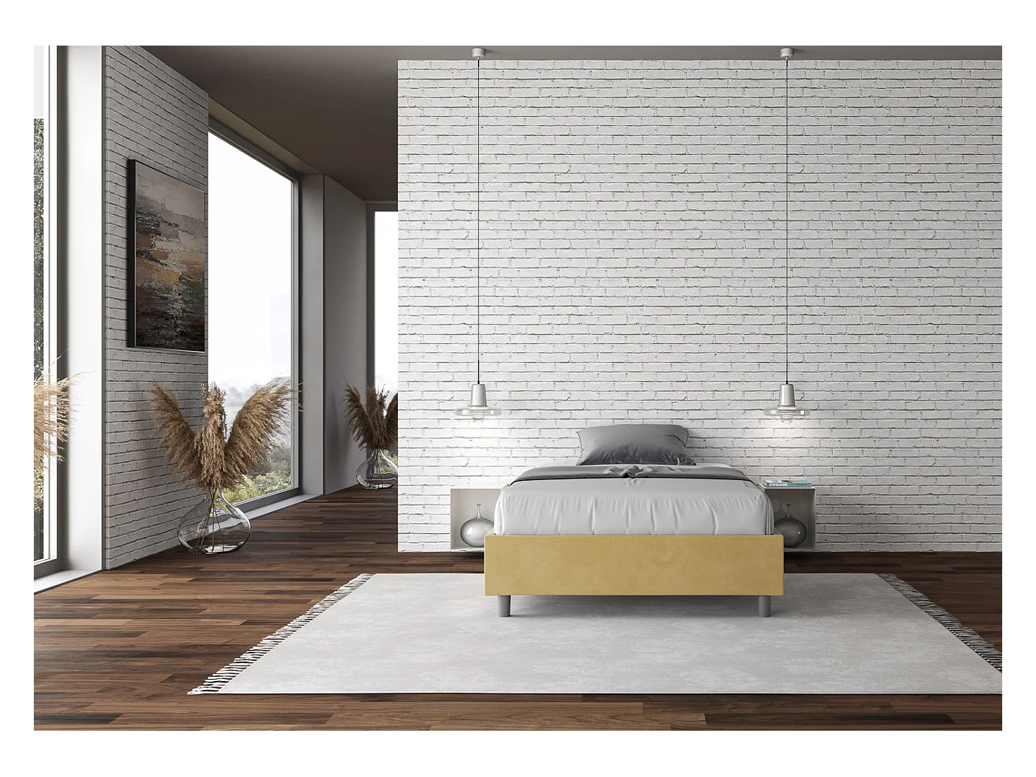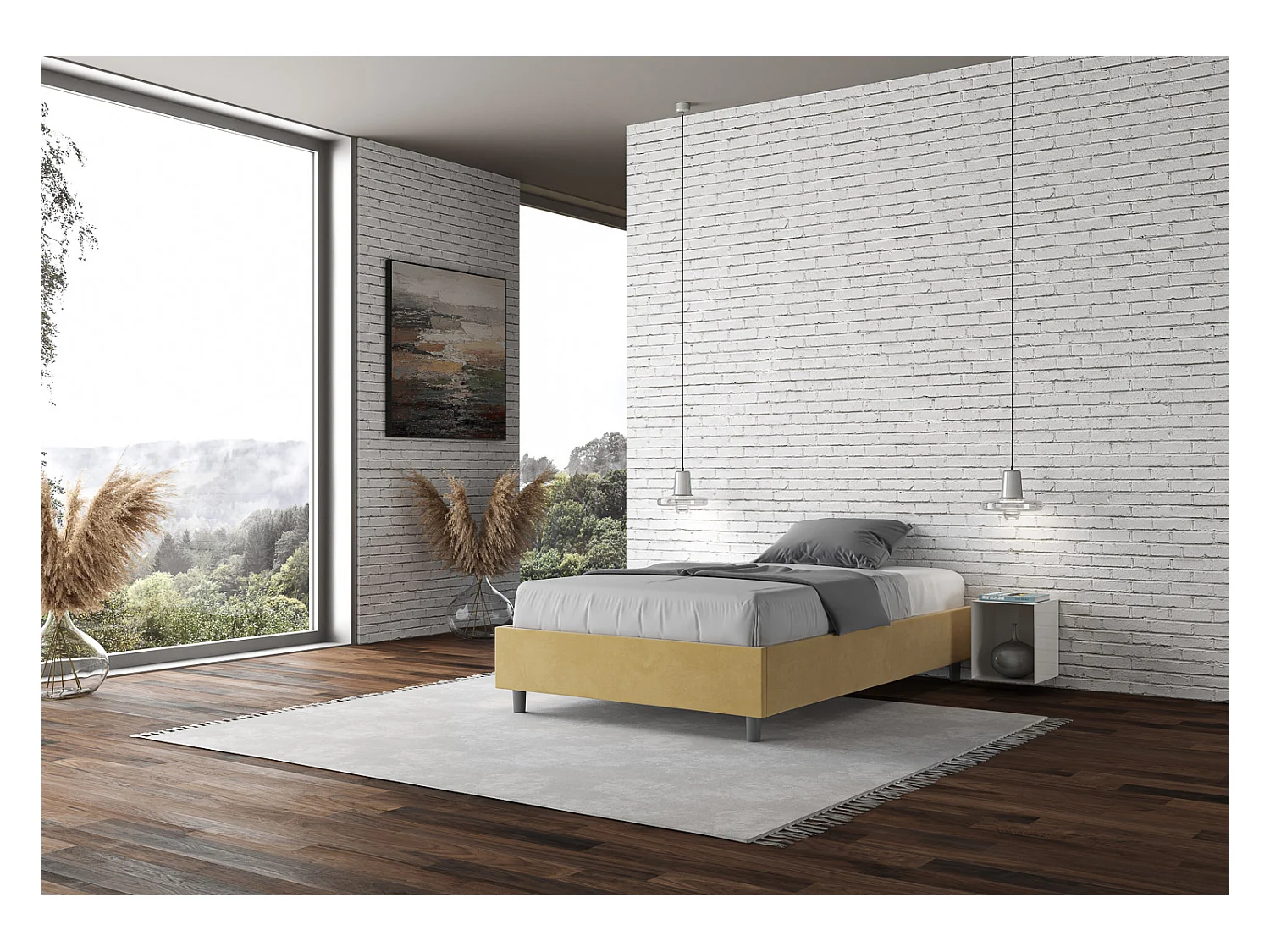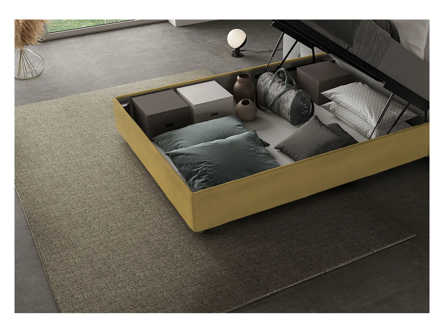 Cadre de lit double coffre rembourré 140x210 microfibre ocre Azelia