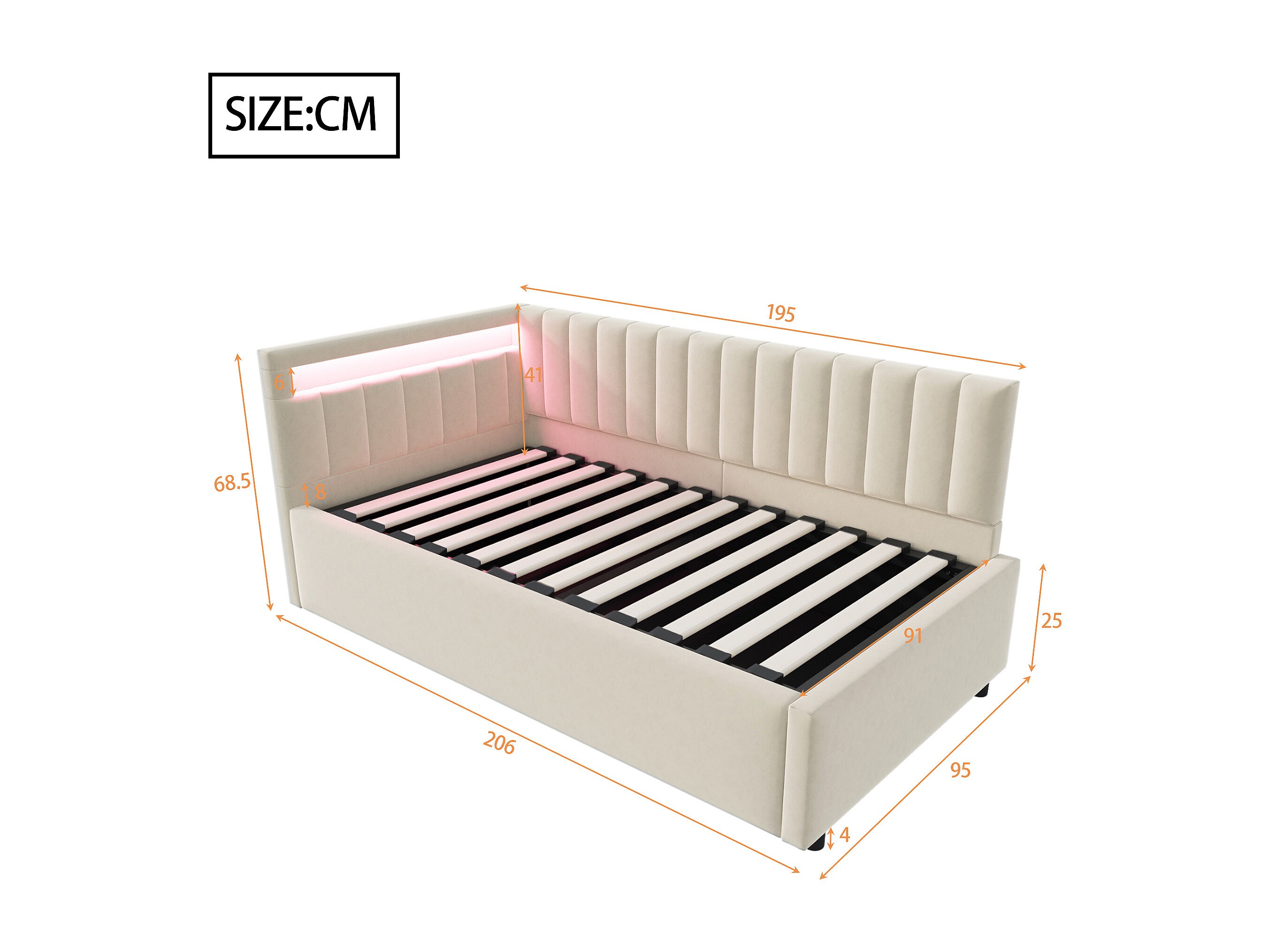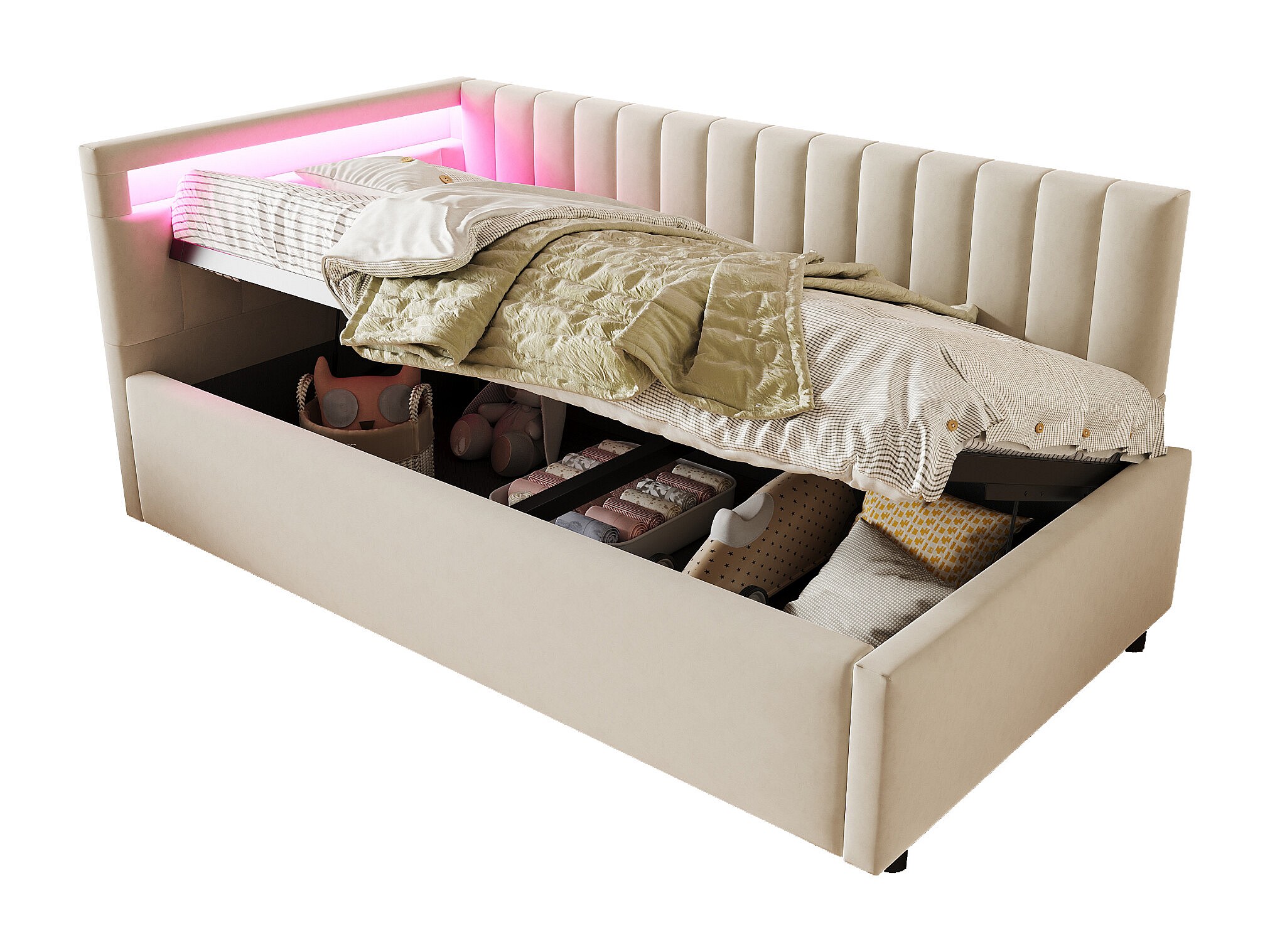 Lit/sommiers 90x200 cm en velours beige avec éclairage LED et rangement hydraulique