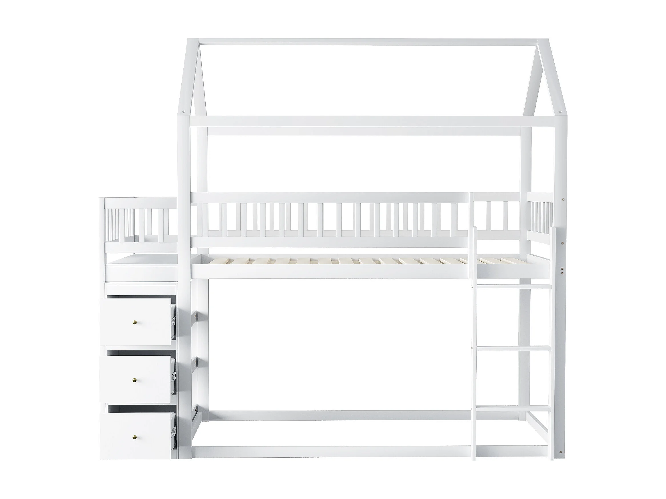 Lit superposé 140x200 cm avec rangement, lit cabane, 1 sommier, pin, contreplaqué, MDF, blanc, sans matelas