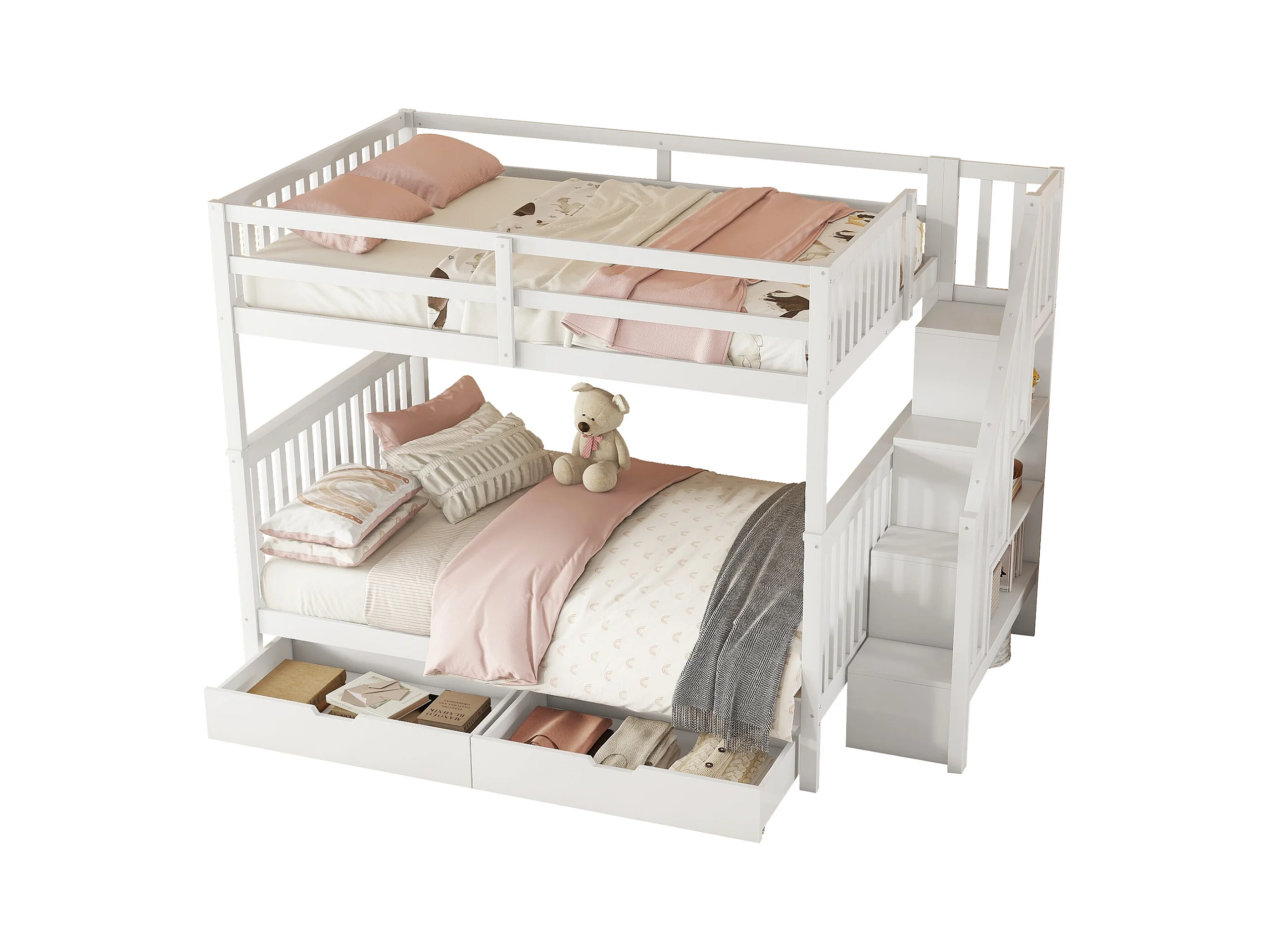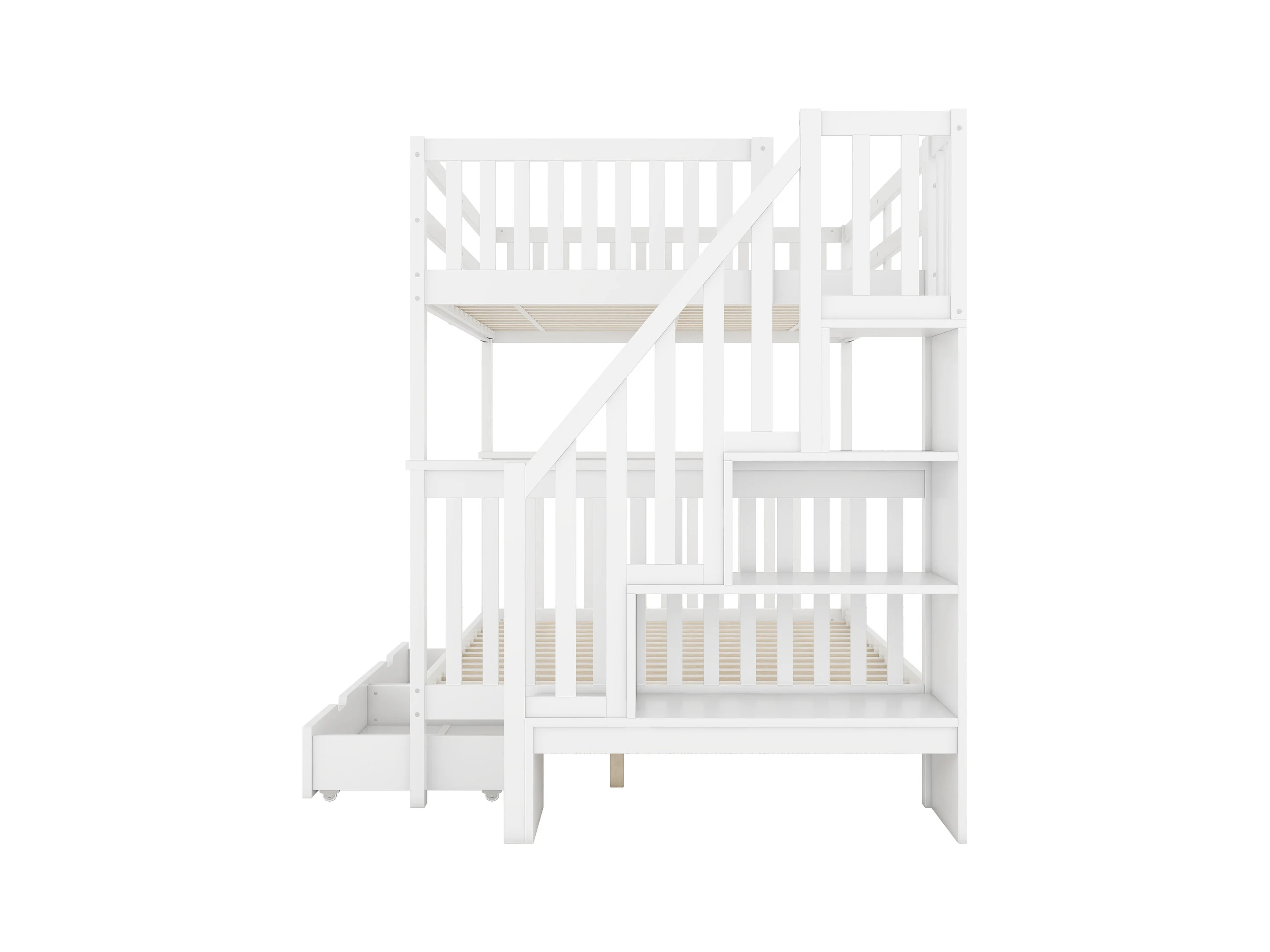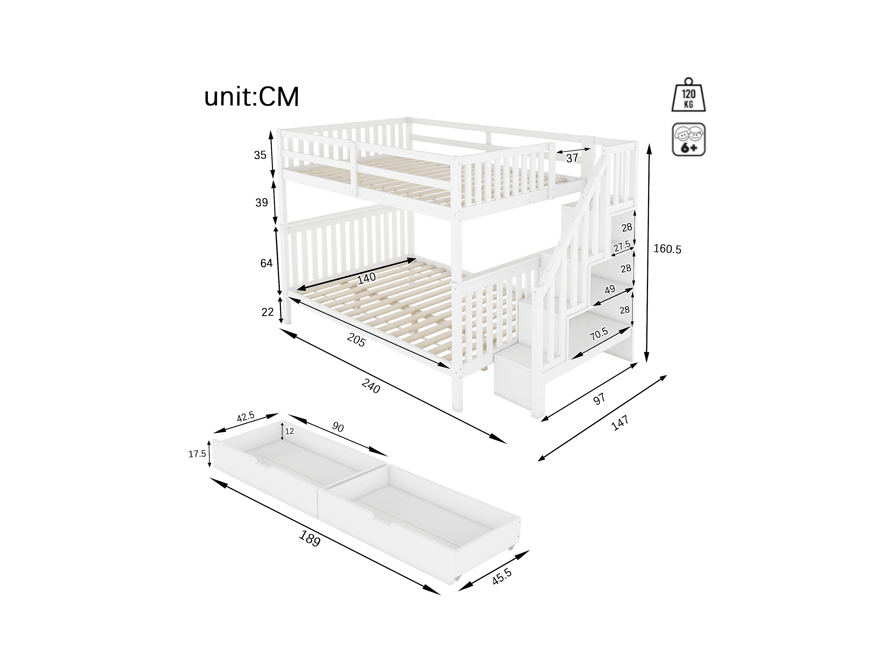 Lit superposé 140x200 cm blanc avec escalier à rangement, deux tiroirs, garde-corps sécurisé, conforme EN747-1