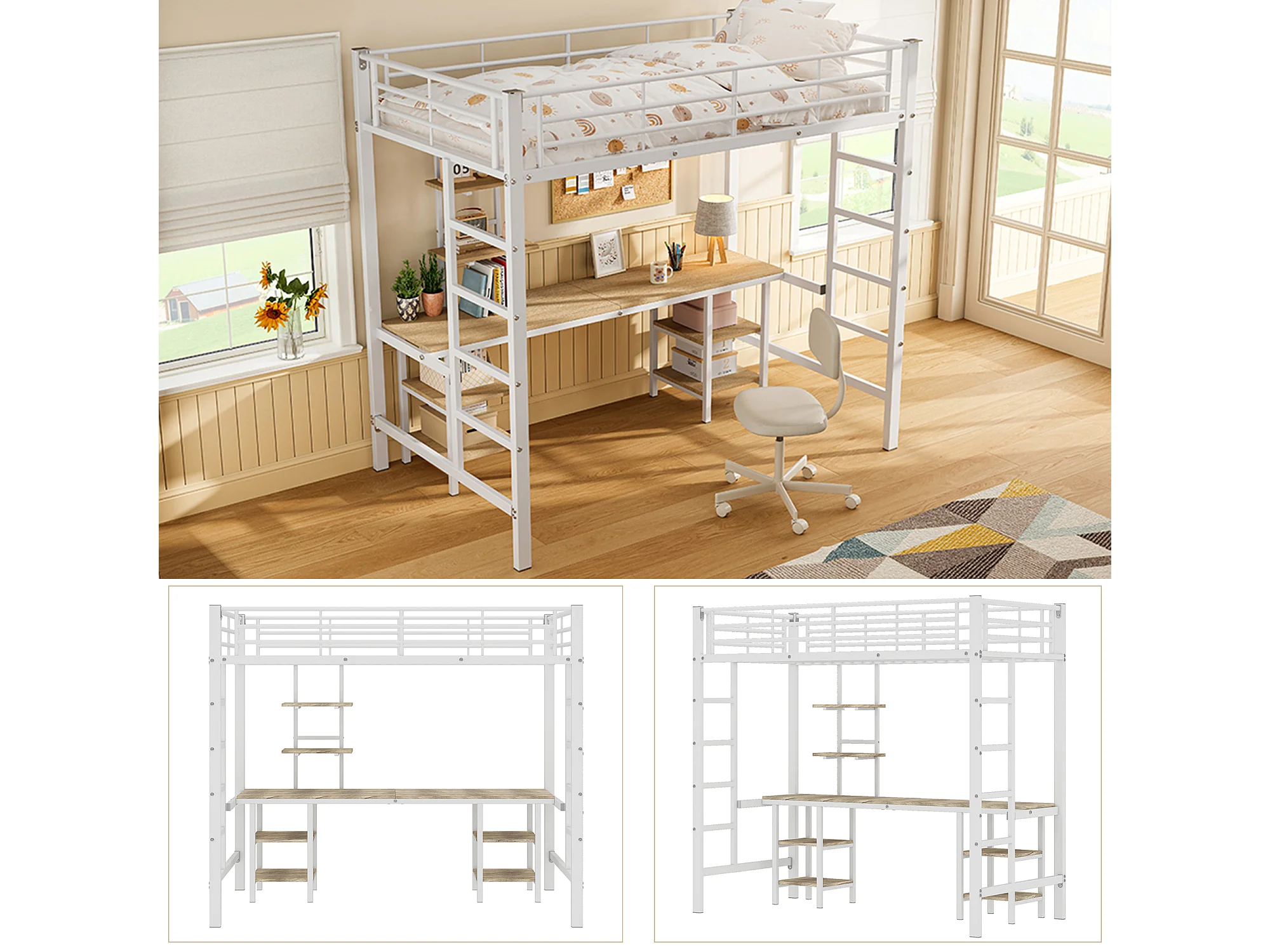 Lit superposé 204.5x95.5x180.5 cm avec table et étagères et garde-corps et échelle Couleur naturelle pour enfants et adolescents