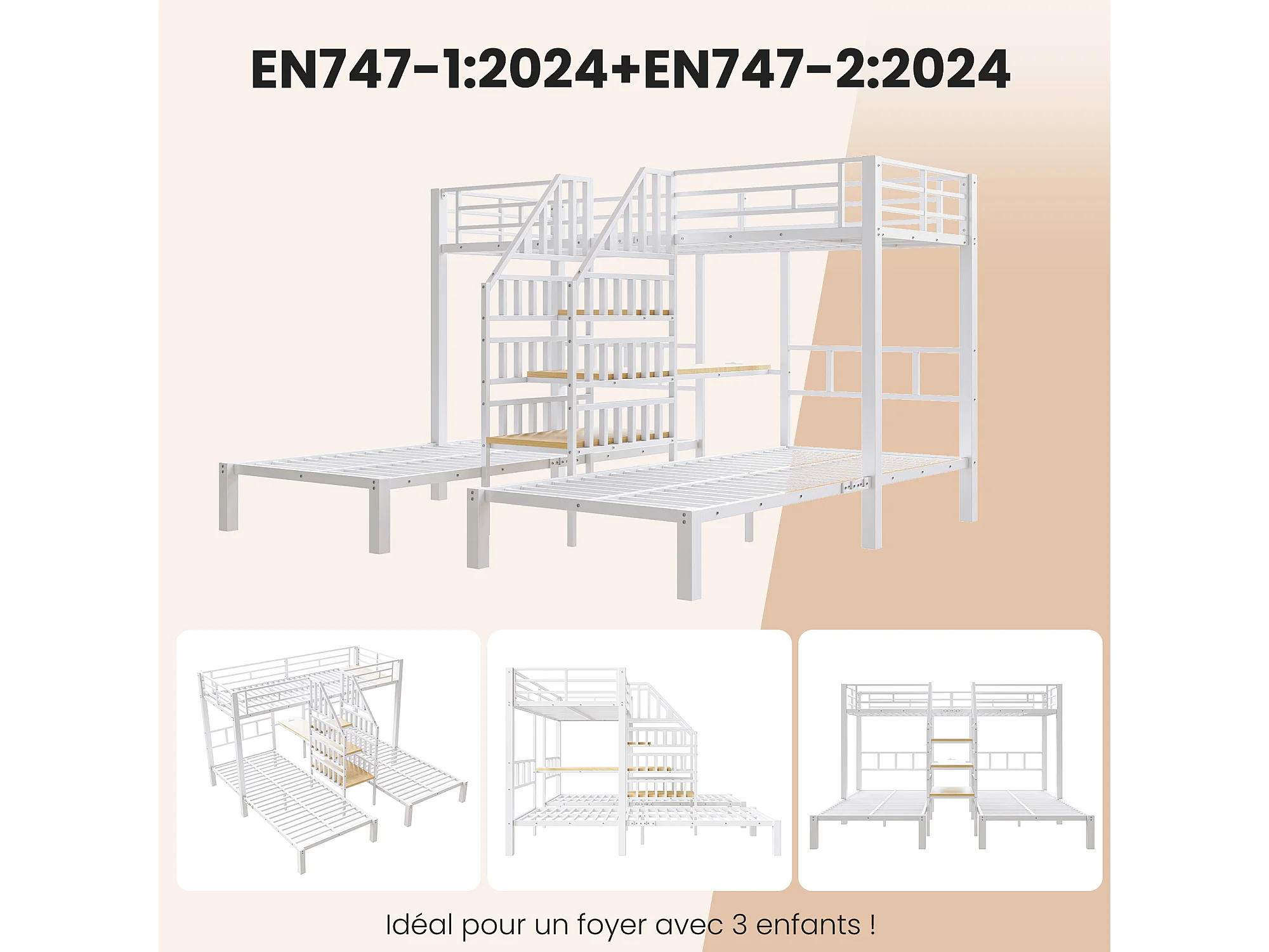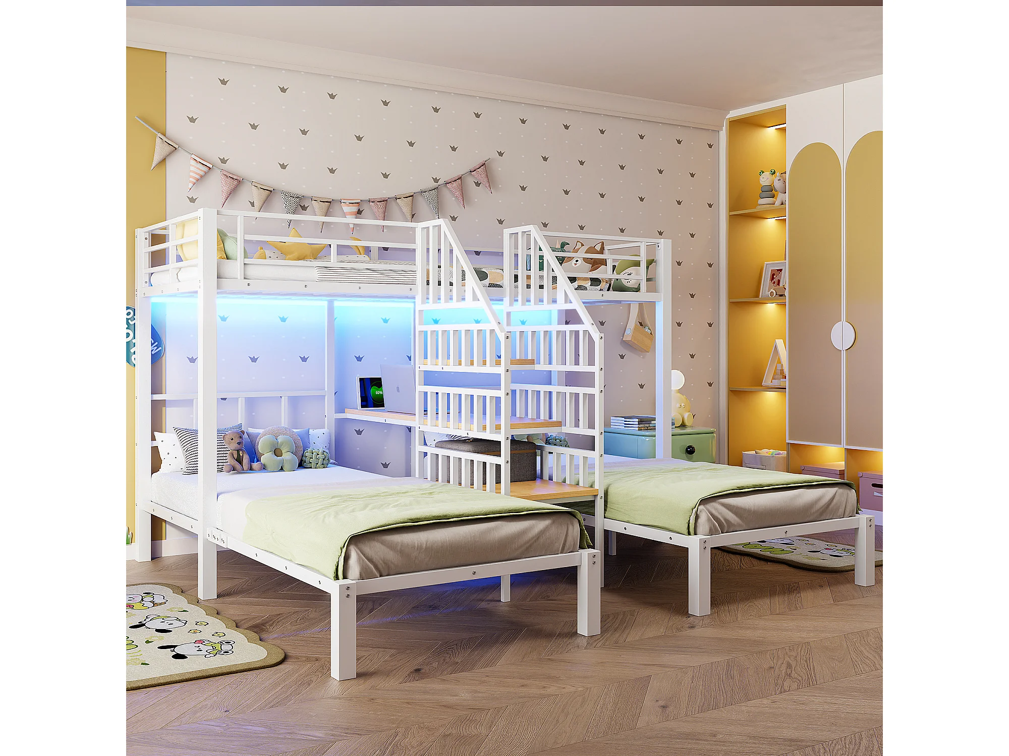 Lit superposé 3 couchages - 3 x 90 x 200 cm - avec Leds + 2 USB + prise + bureau + escalier de rangement - métal - blanc