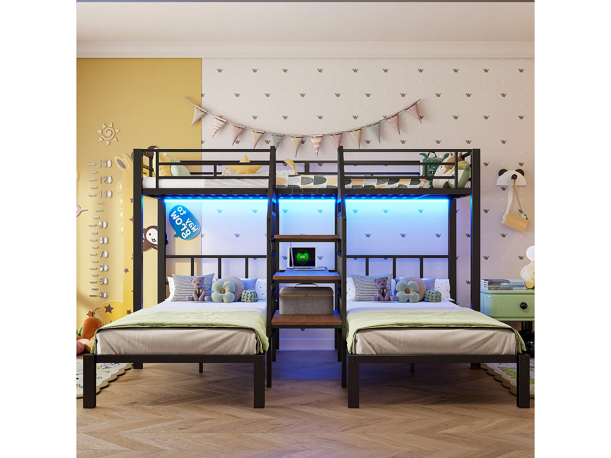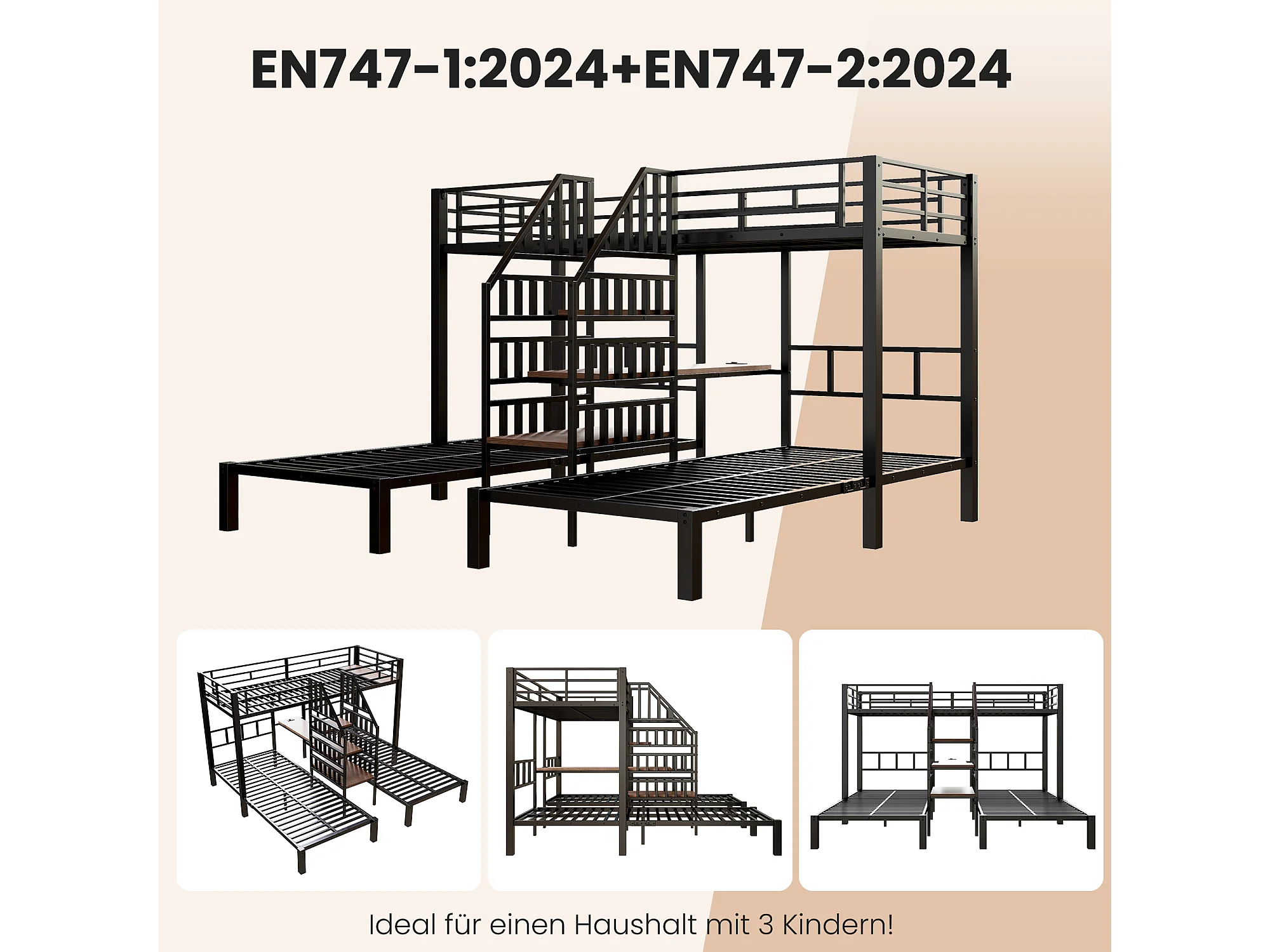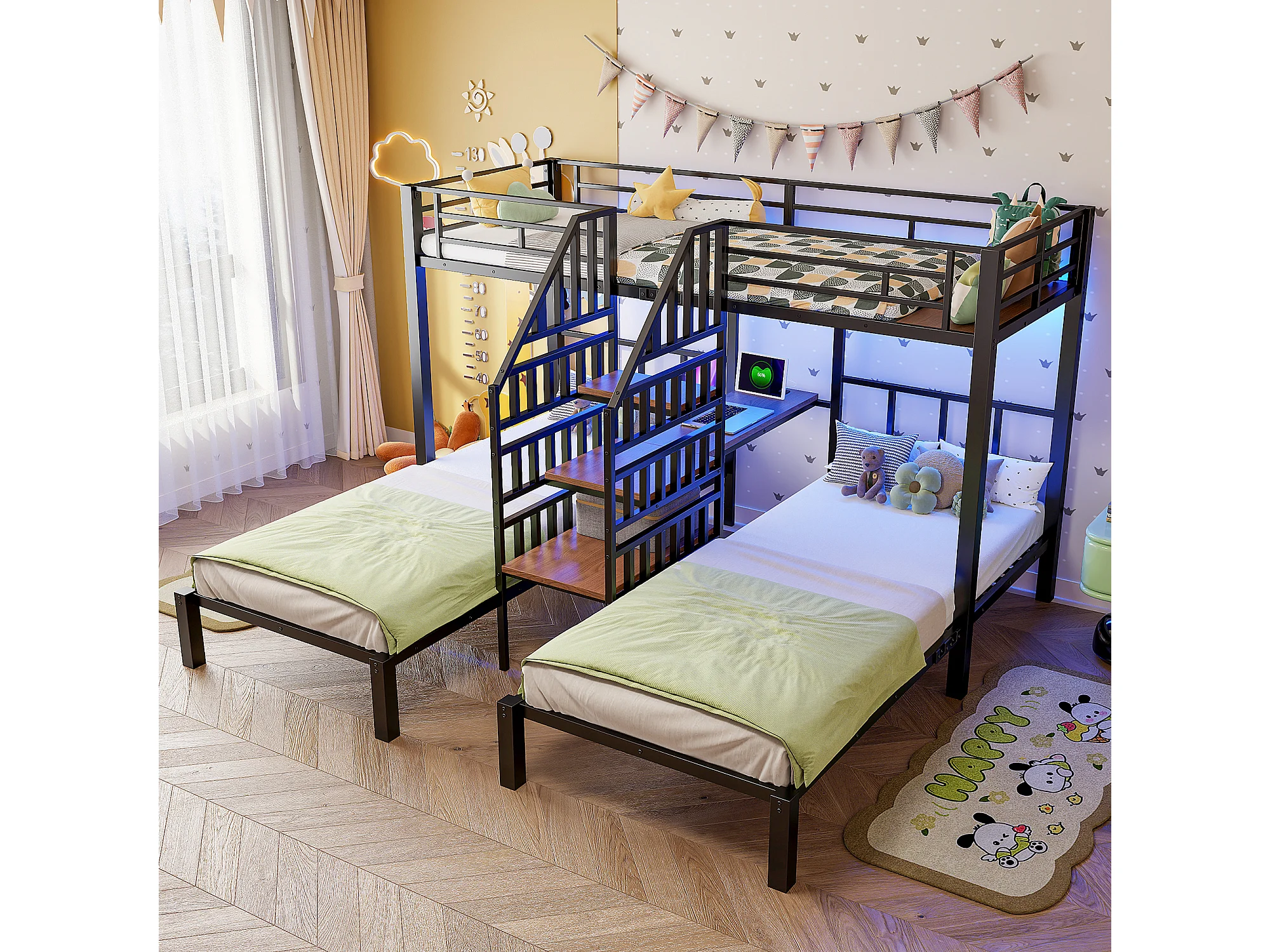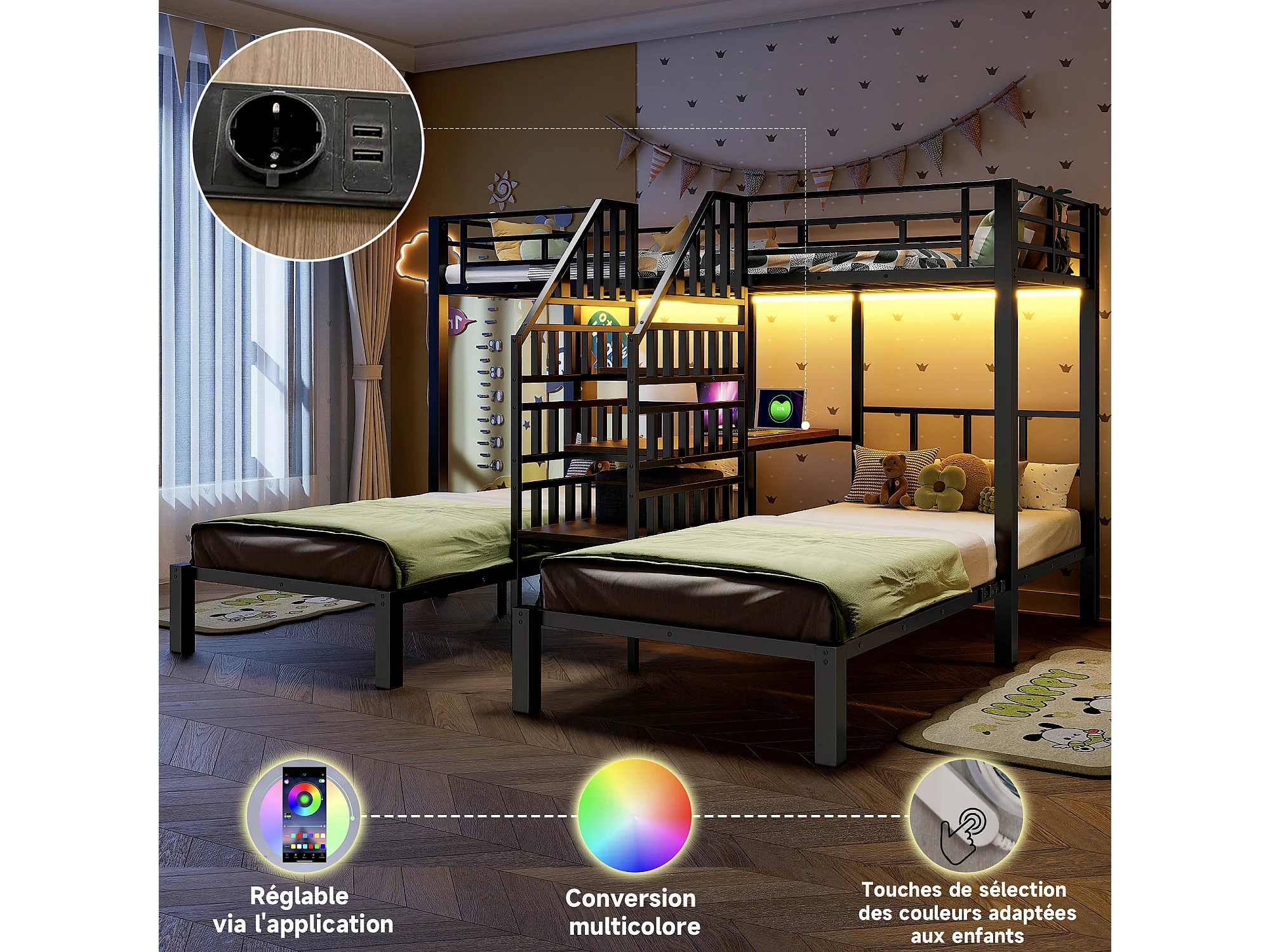 Lit superposé 3 couchages - 3 x 90 x 200 cm - avec Leds + 2 USB + prise + bureau + escalier de rangement - métal - noir