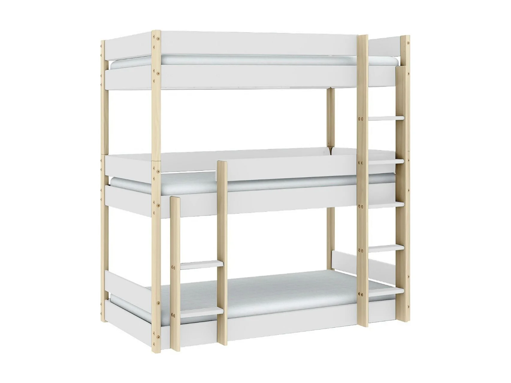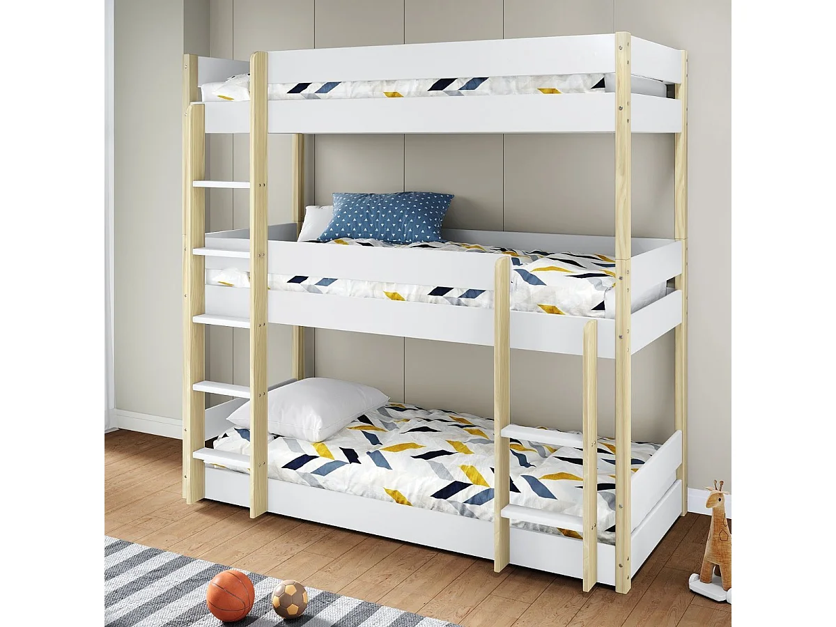 Lit superposé 3 couchages 90x190 en MDF laqué blanc et pin naturel - SOMIS