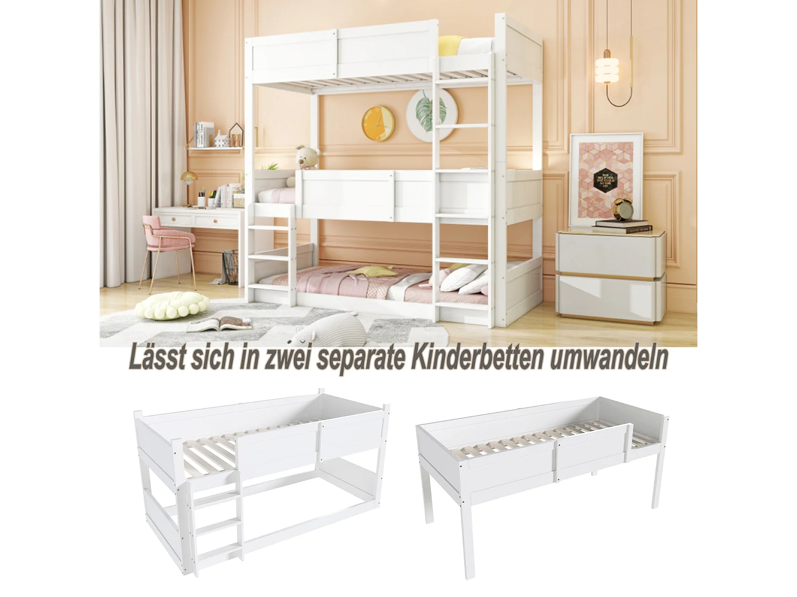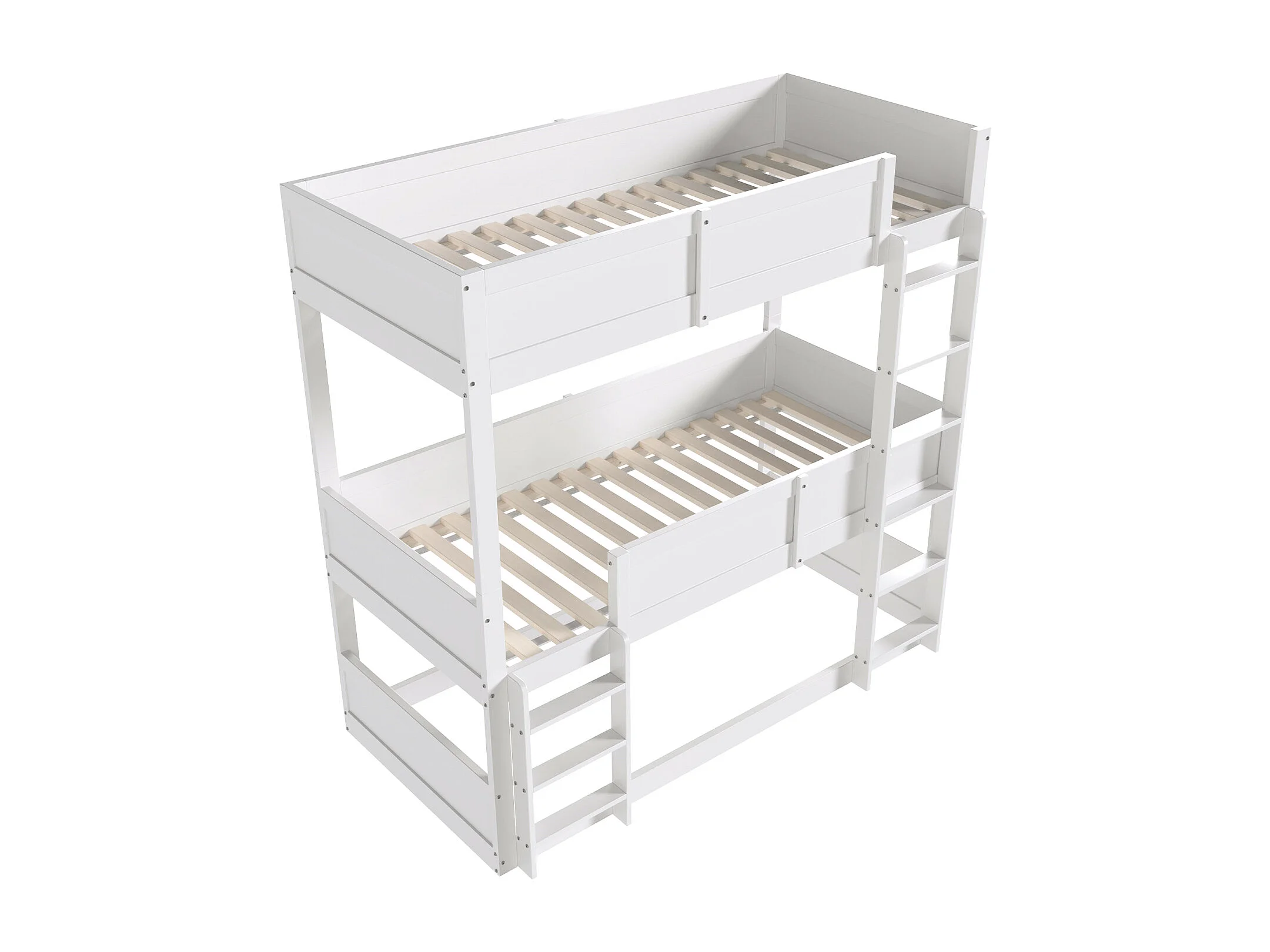 Lit superposé 3 places enfant 90x200 cm – Blanc, barrière sécurité, échelle, sommier à lattes