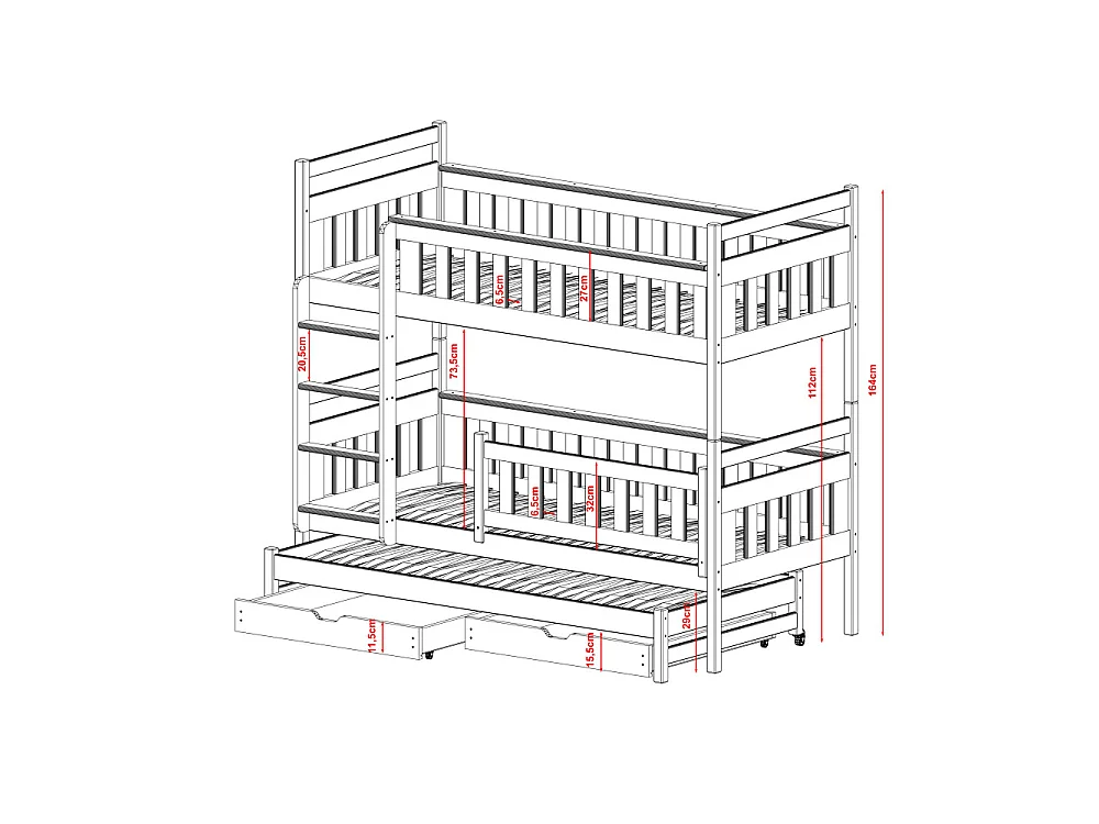 Lit superposé 3 places Korza 90x200 avec lit gigogne et 2 Tiroirs Blanc Livré avec sommiers Livré avec sommiers, tiroir et matelas en mousse de 7cm