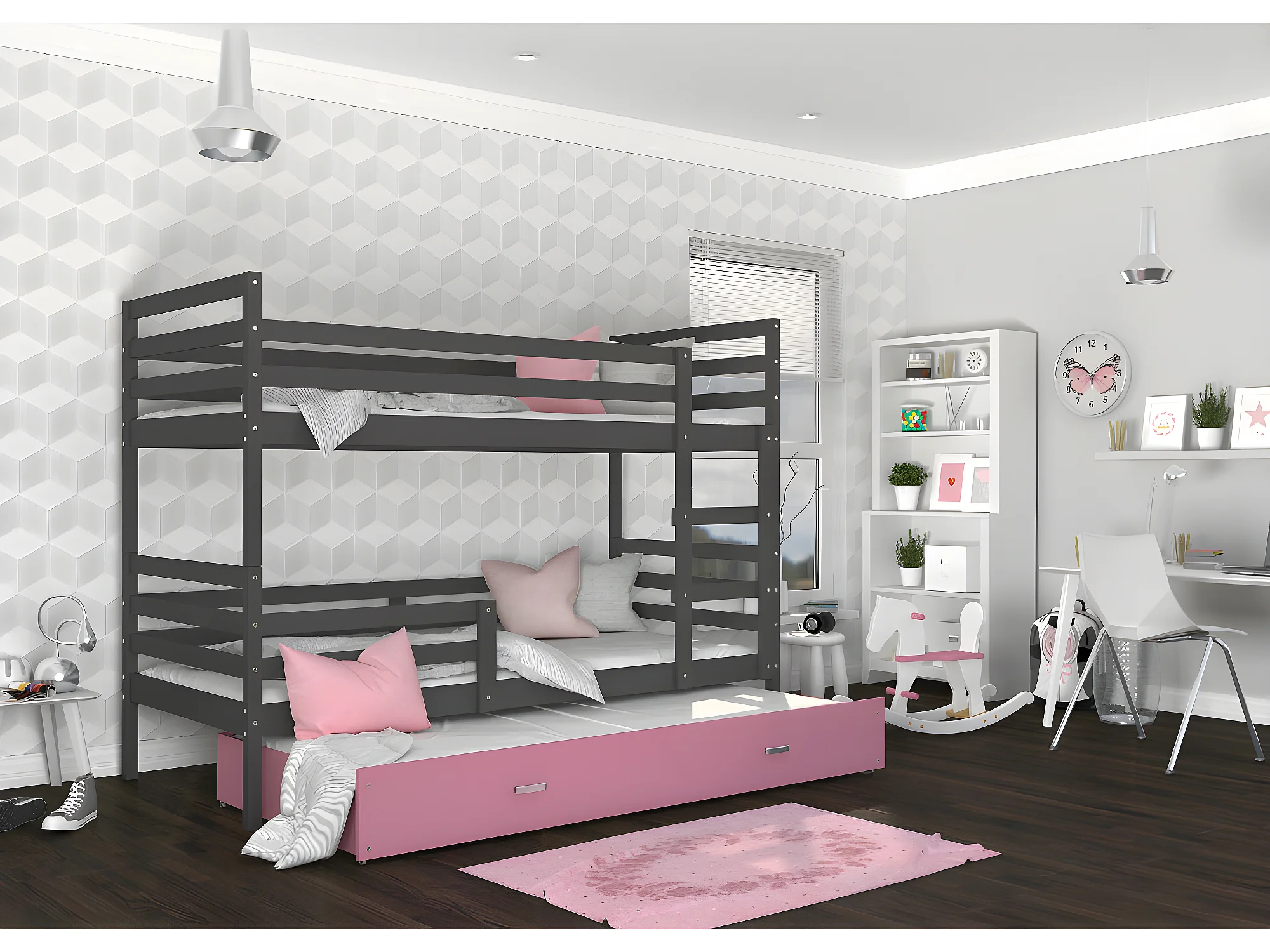 Lit Superposé 3 Places Milo 90x190 Gris - rose Livré avec sommiers, tiroir et matelas en mousse de 7cm