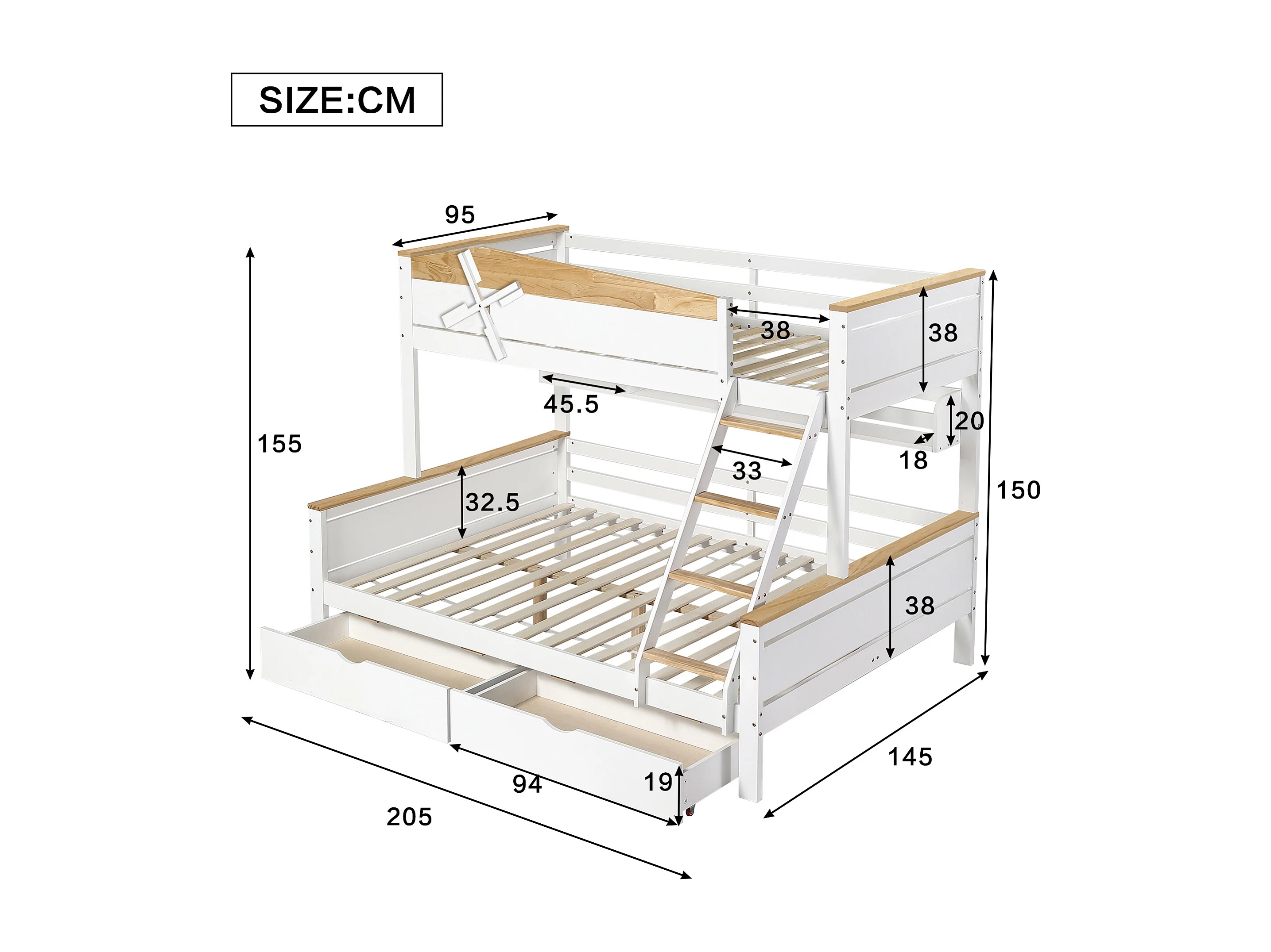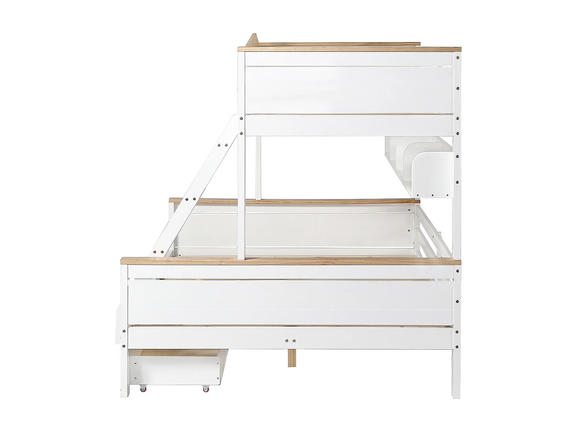 Lit superposé 90/140x200 cm, barrière de sécurité, rangement, pin et MDF, blanc et naturel, sans matelas