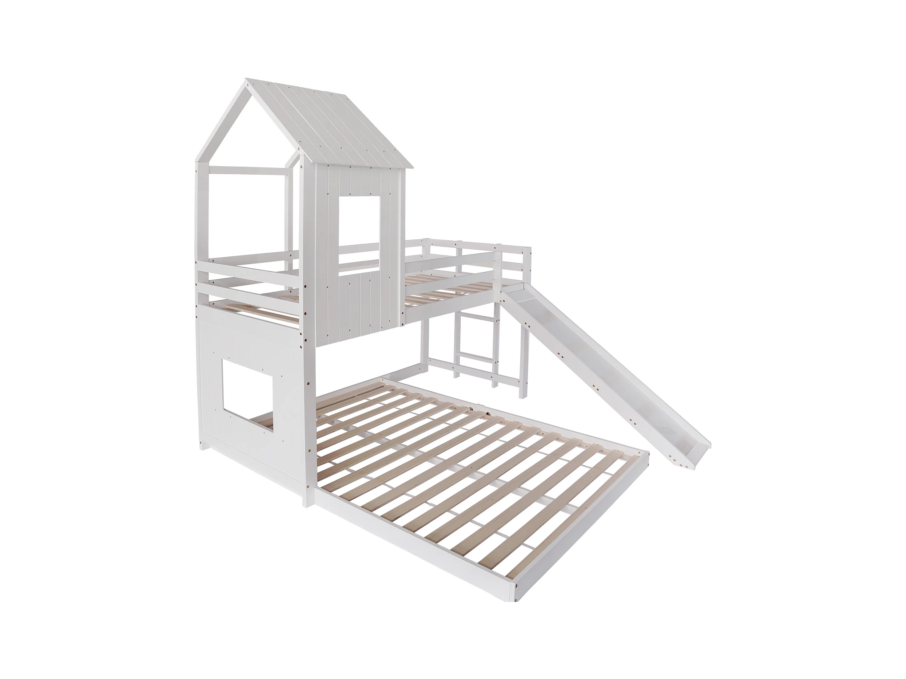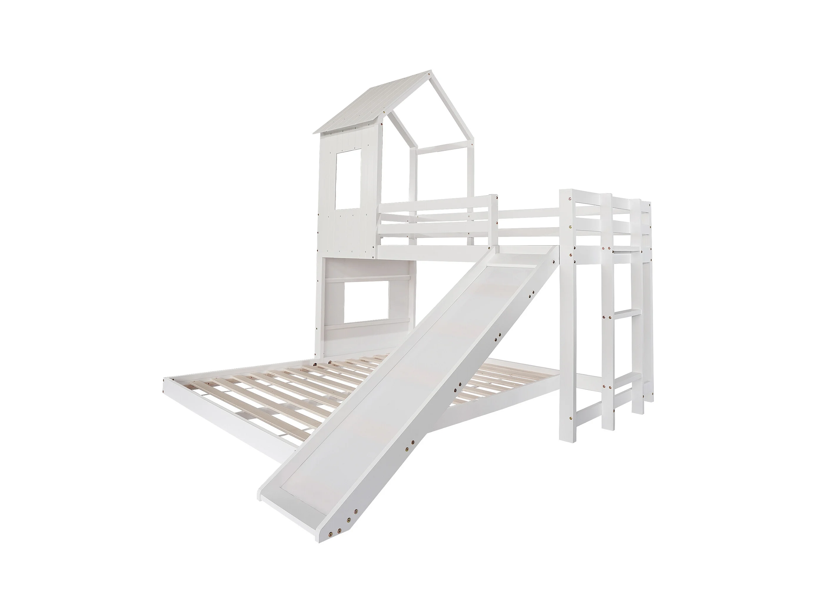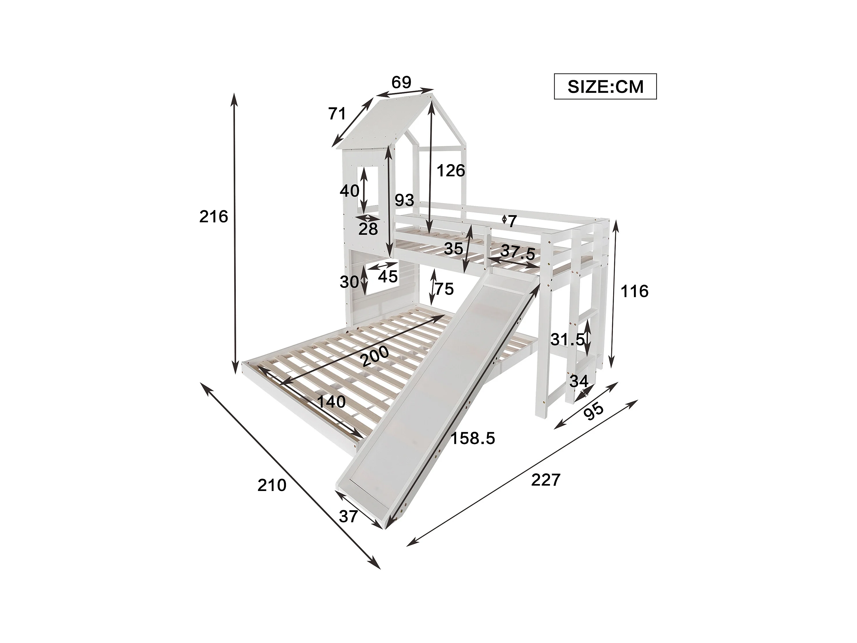 lit superposé 90/140x200cm en forme de maison avec tobaggan, cadre en pin+MDF, 2 sommier inclus,blanc , sans matelas
