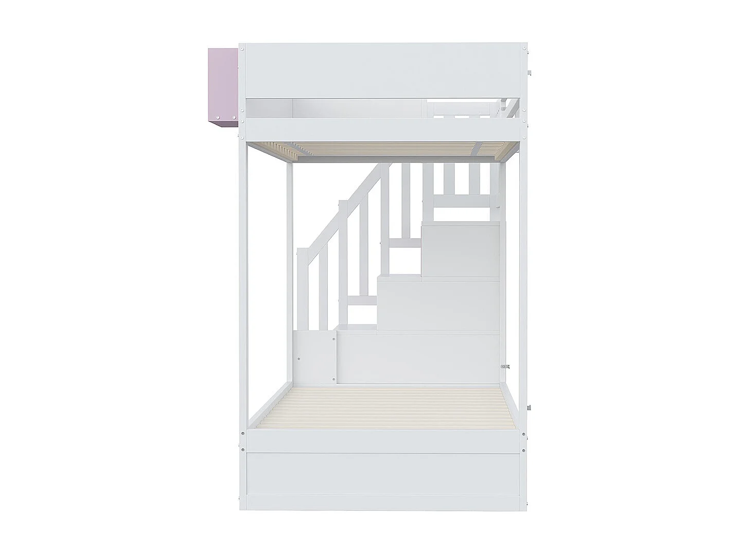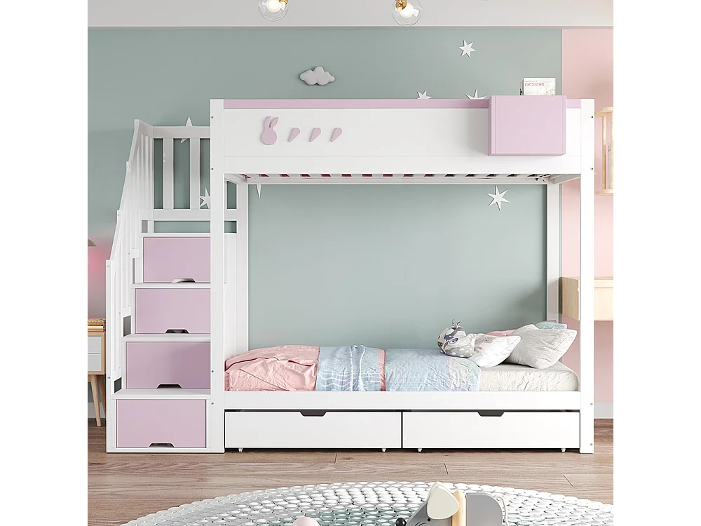 Lit superposé 90 × 200 cm, avec coffre de rangement amovible, échelle de sécurité, tiroirs, blanc + rose