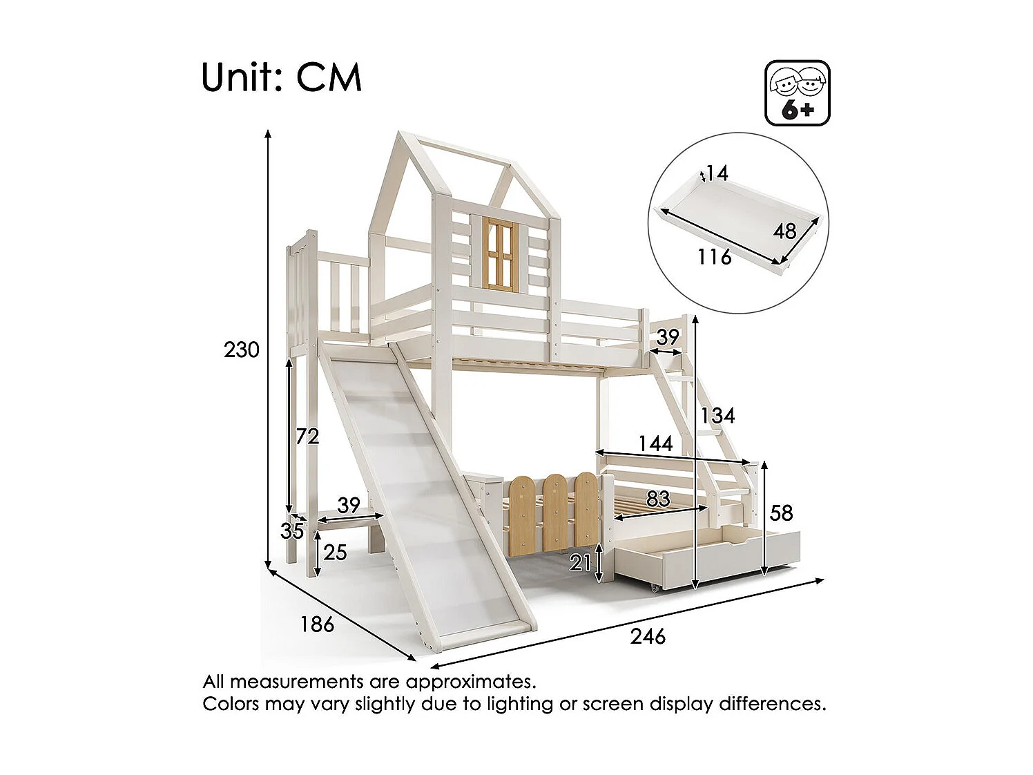 Lit superposé 90x200 140x200 cm maison tiroir toboggan échelle mezzanine enfant sommier lattes design cabane blanc