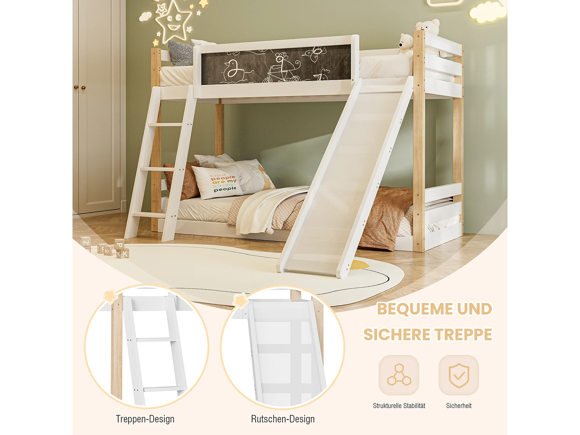 Lit superposé 90x200 / 90x190 cm avec échelle et toboggan convertibles - tableau noir à dessiner - blanc - idéal pour chambre d'enfant ou petit appartement