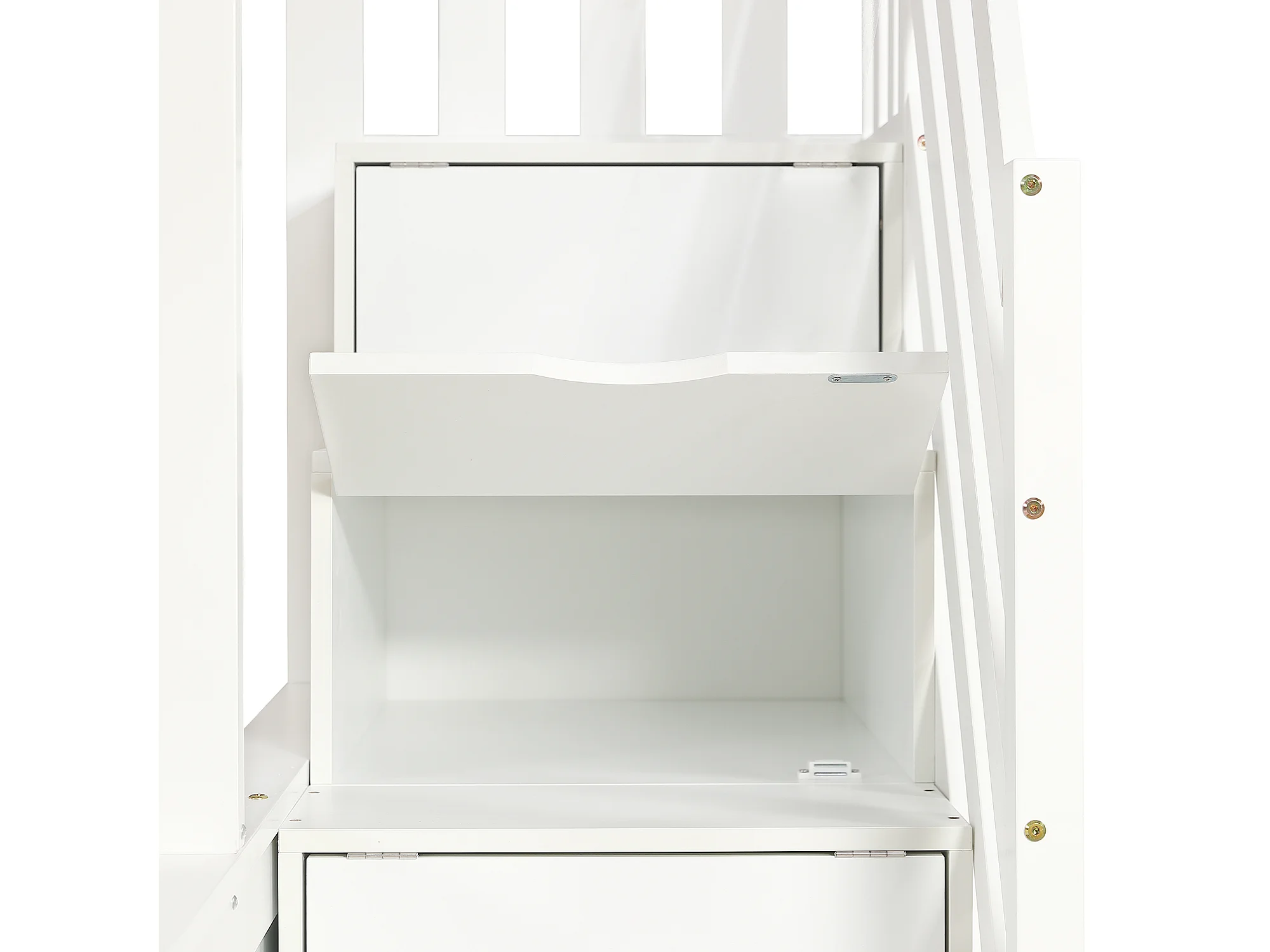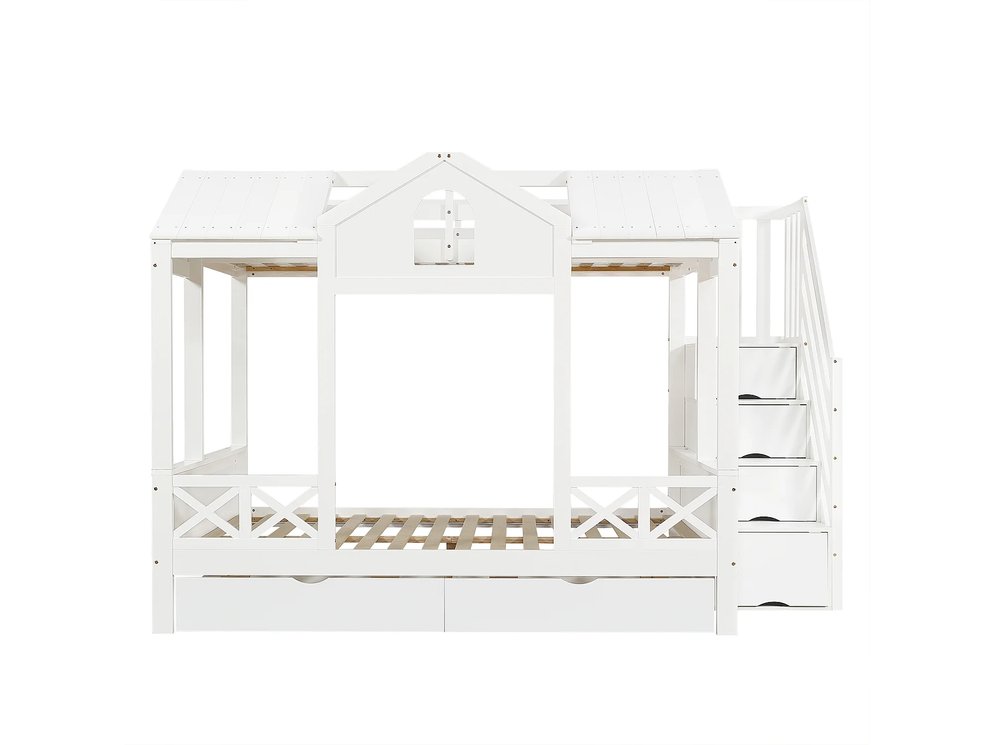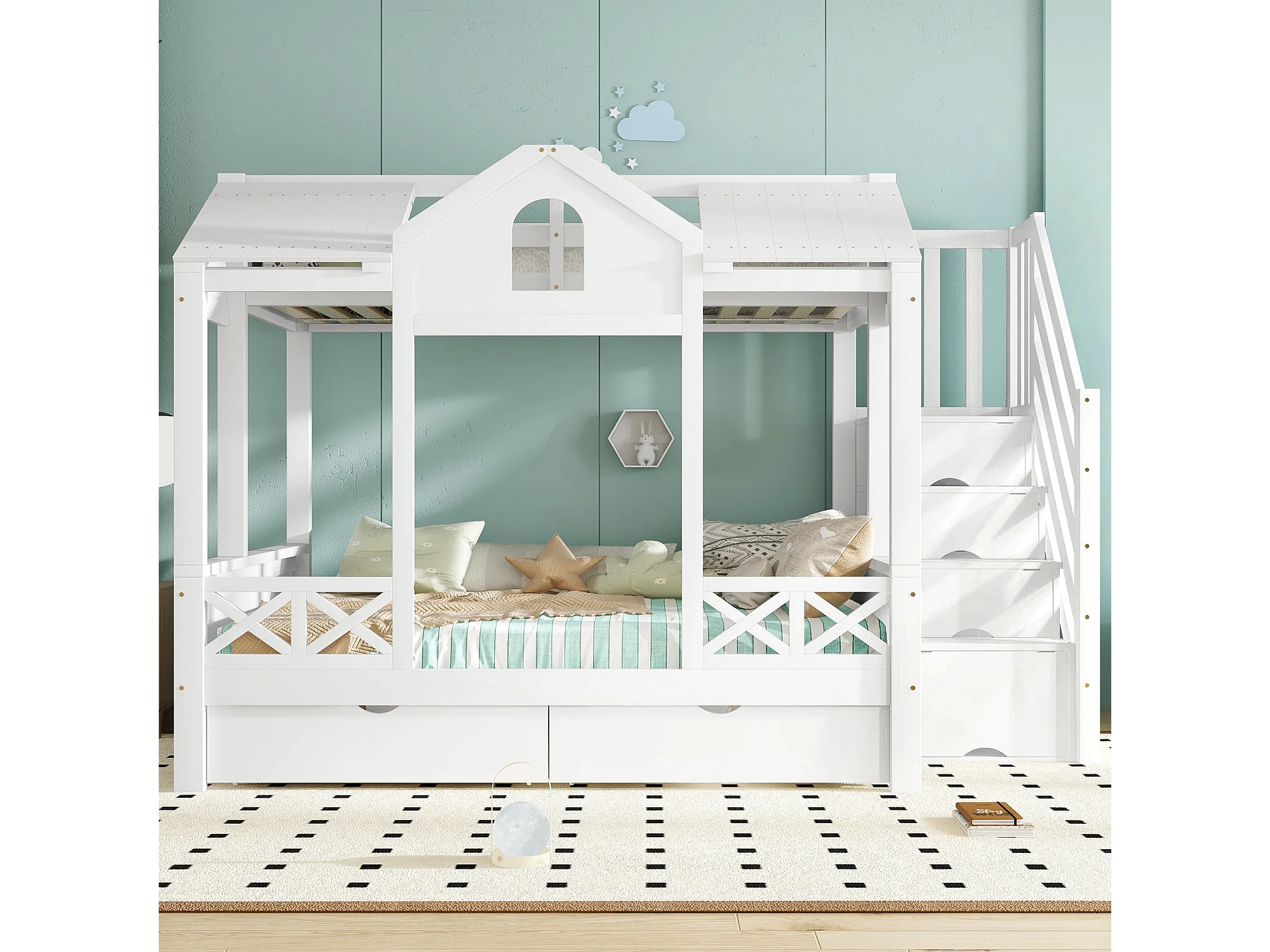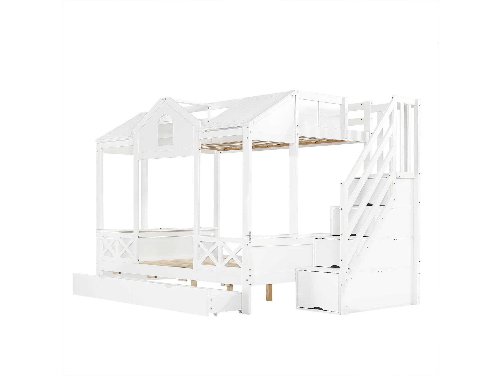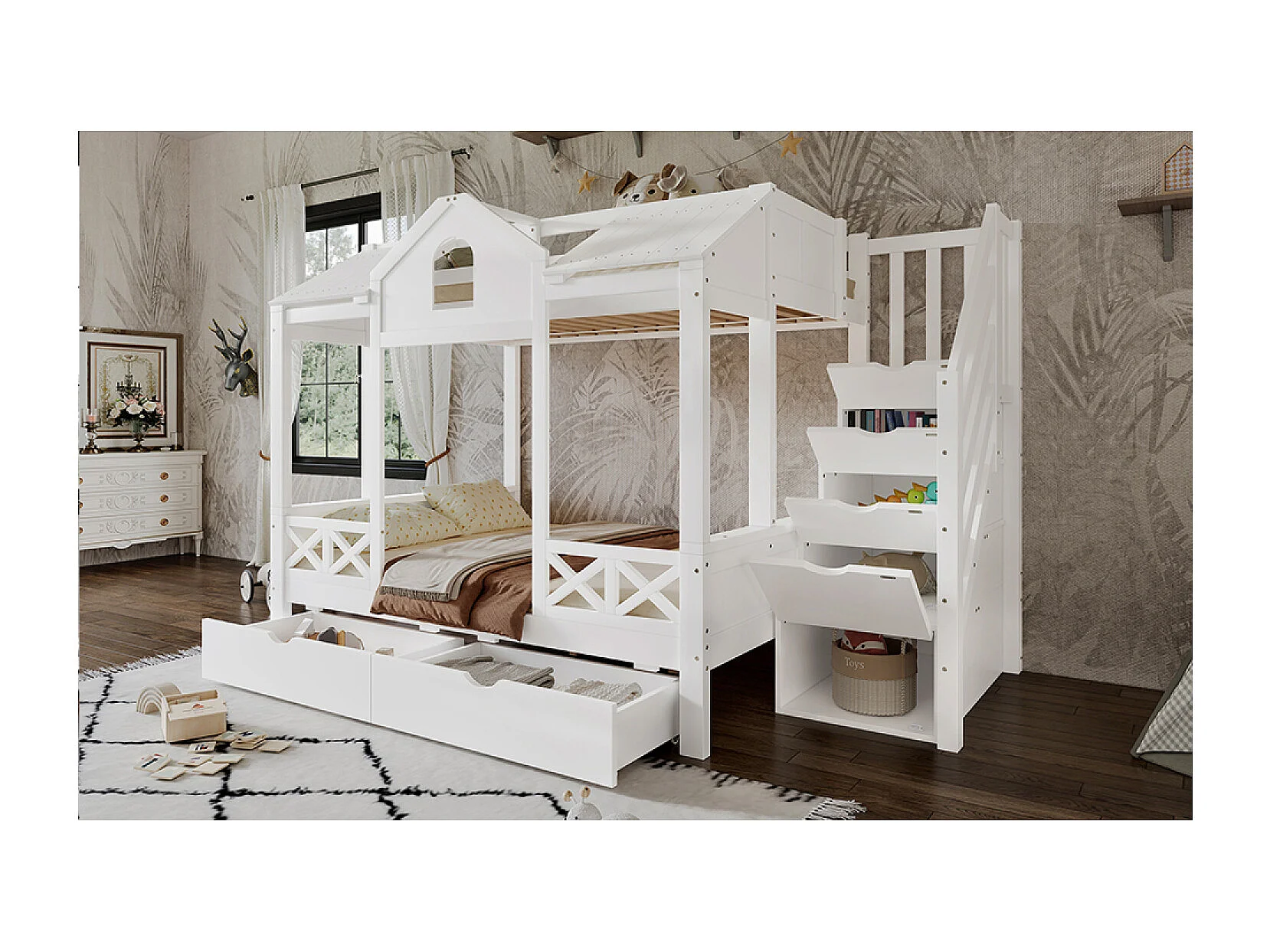 Lit superposé 90x200 cm / 140x200 cm avec 2 tiroirs et escalier à ranngement - Bois blanc
