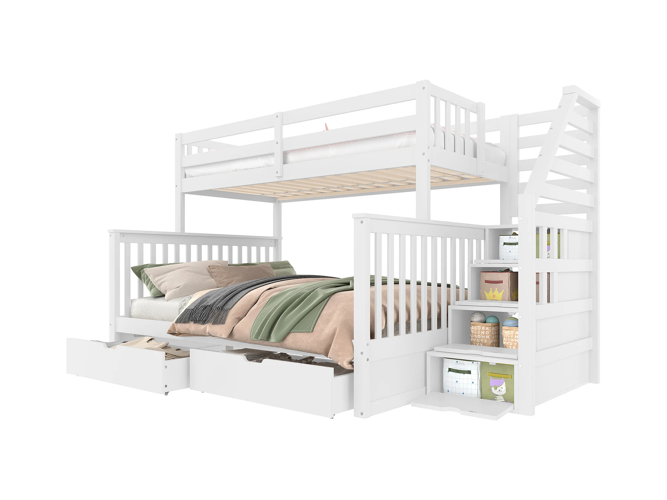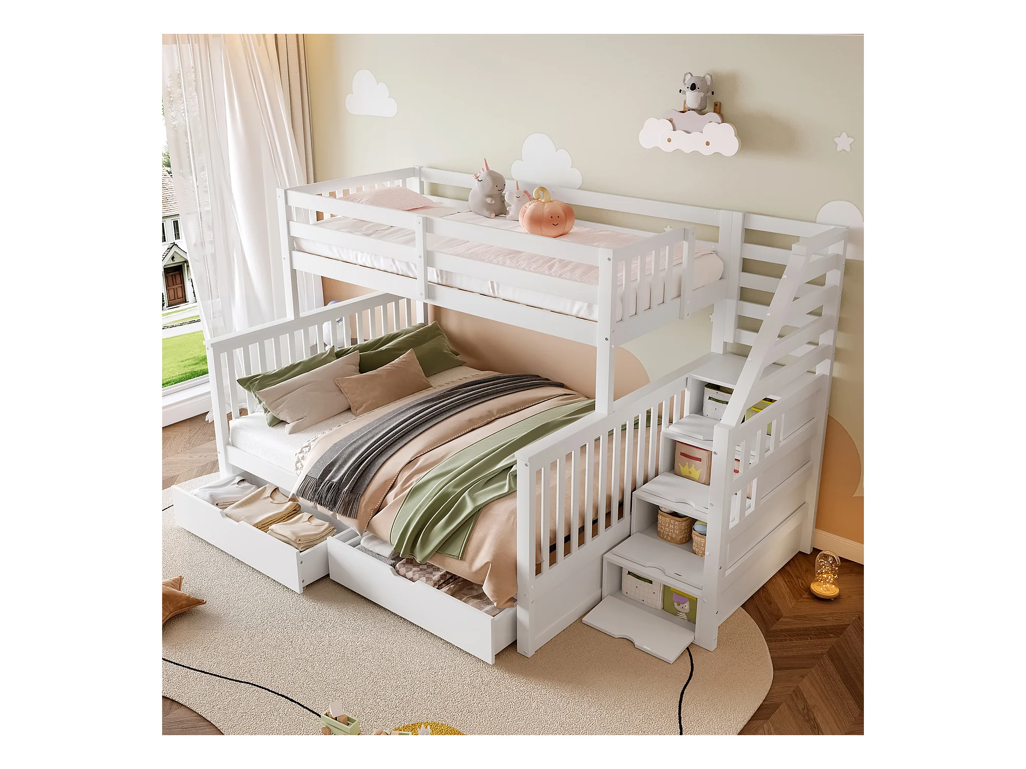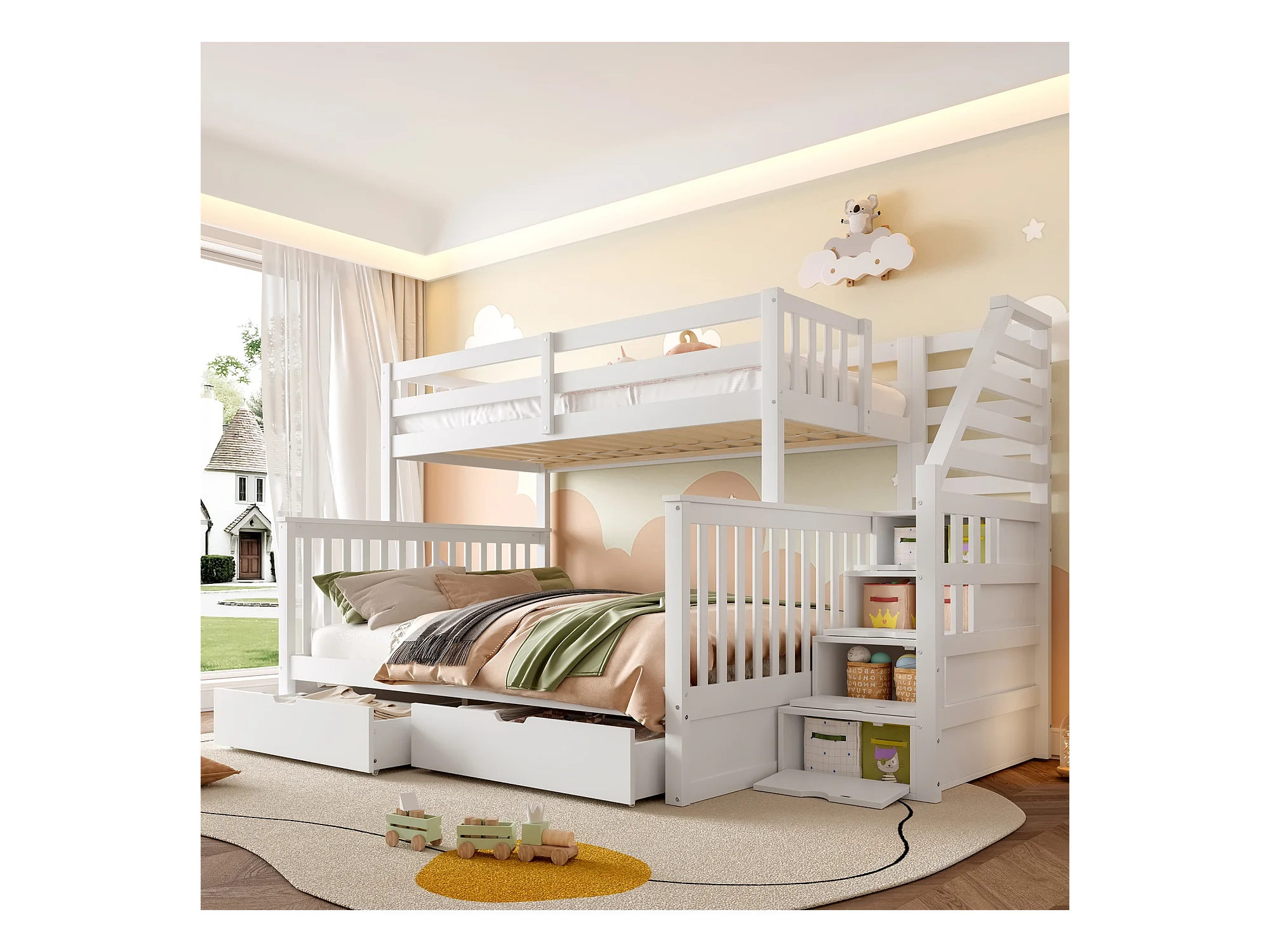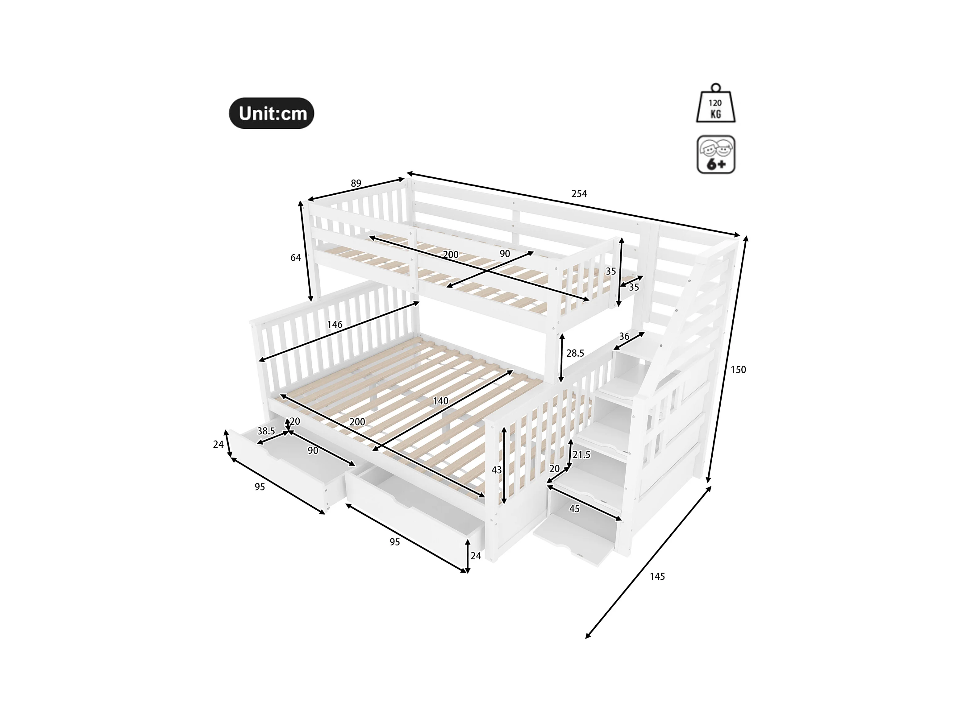 Lit superposé 90x200 cm + 140x200 cm avec tiroirs de rangement, sans matelas, multifonction, Blanc