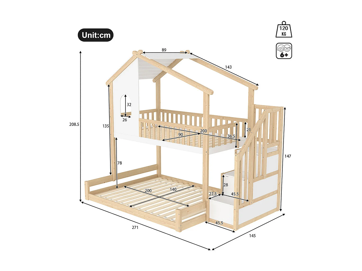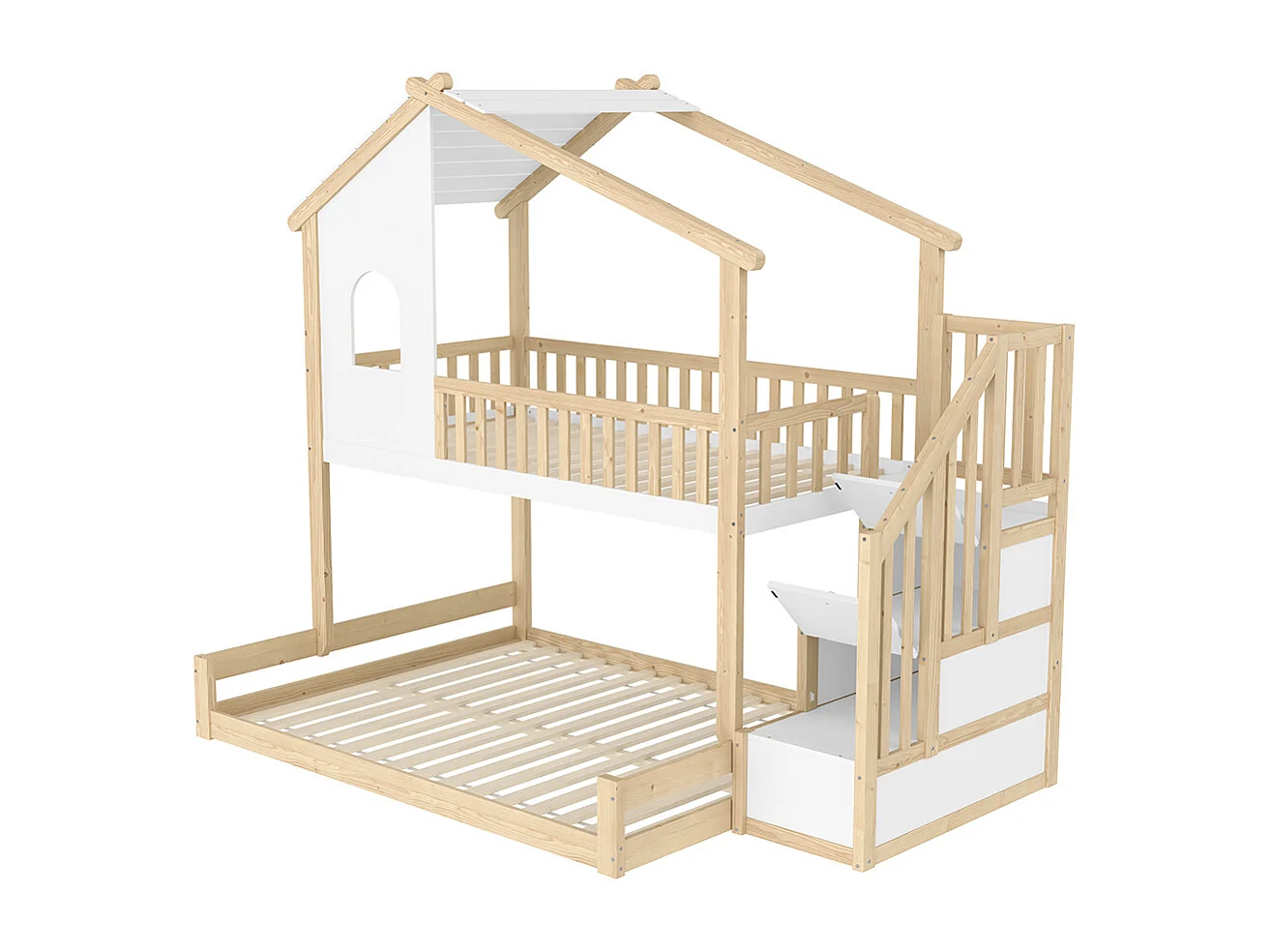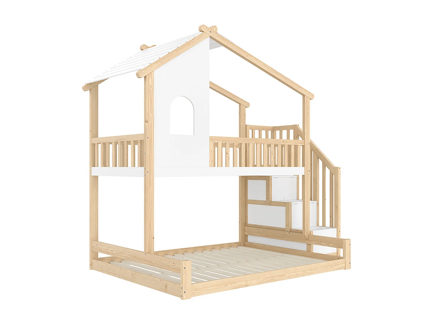 Lit superposé 90x200 cm 140x200 cm barrière échelle rangement fenêtre moulure naturel blanc