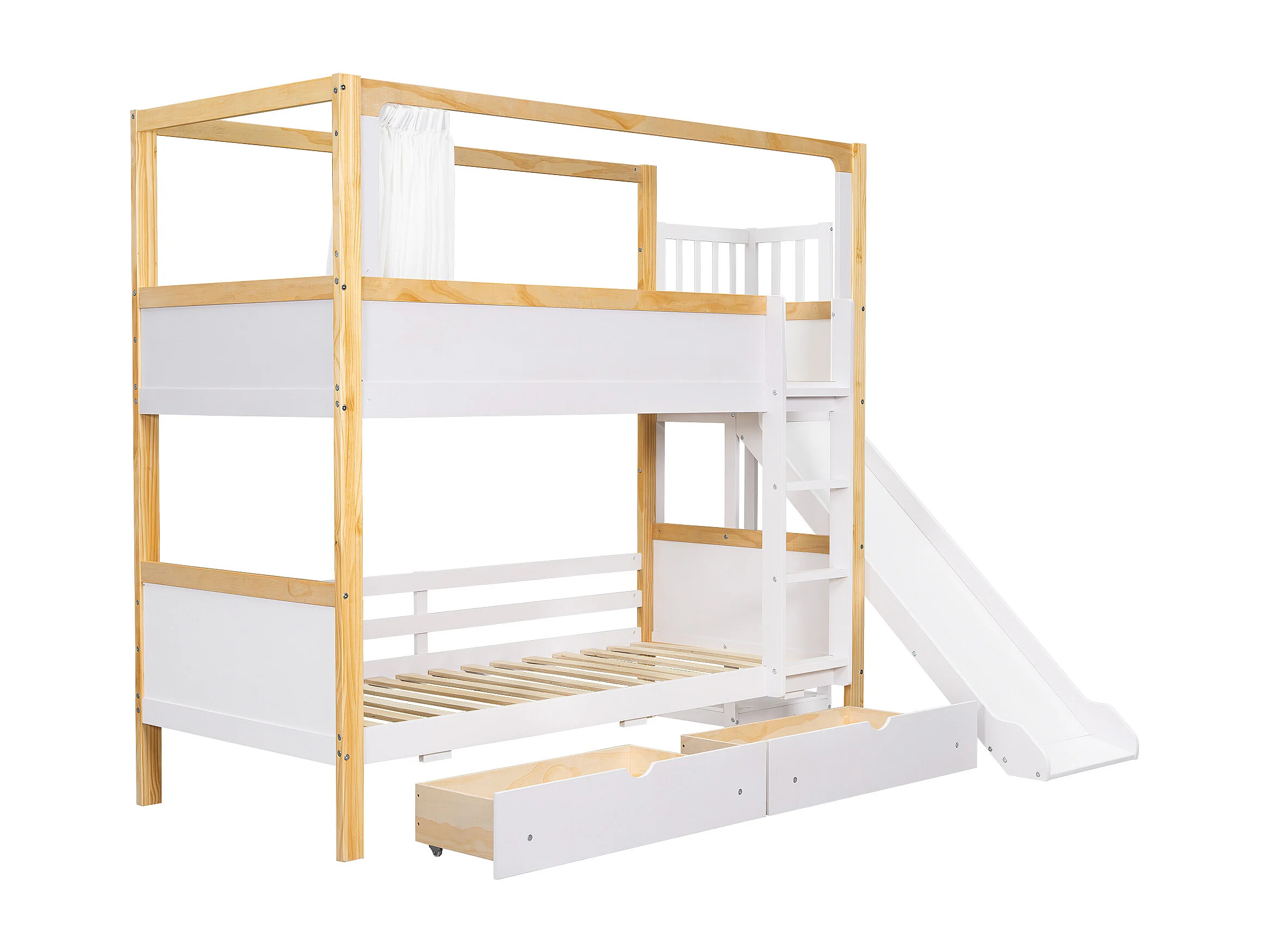 Lit superposé 90x200 cm – 2 tiroirs roulettes, toboggan et rideau tissu, pin + MDF + contreplaqué blanc/naturel