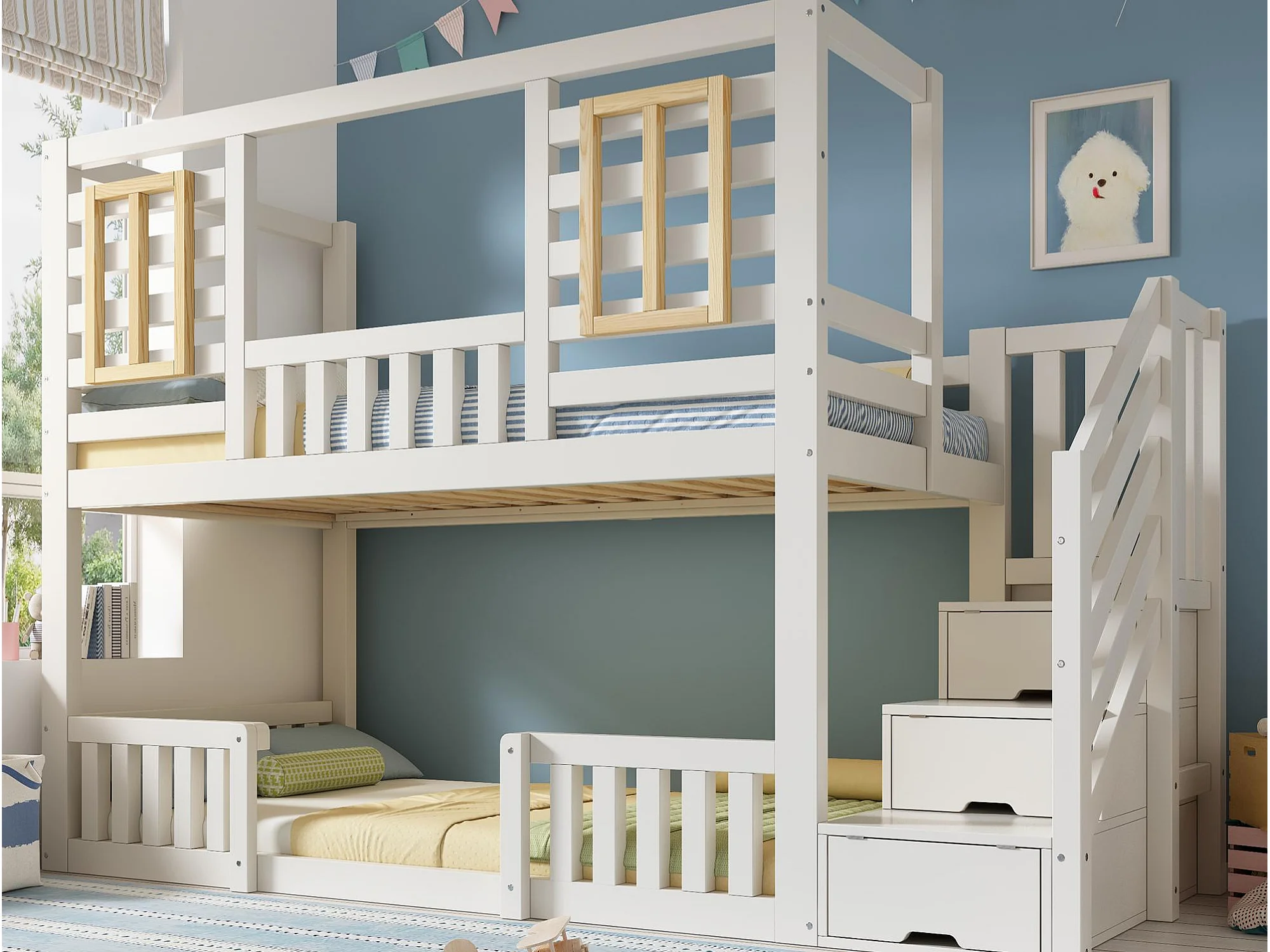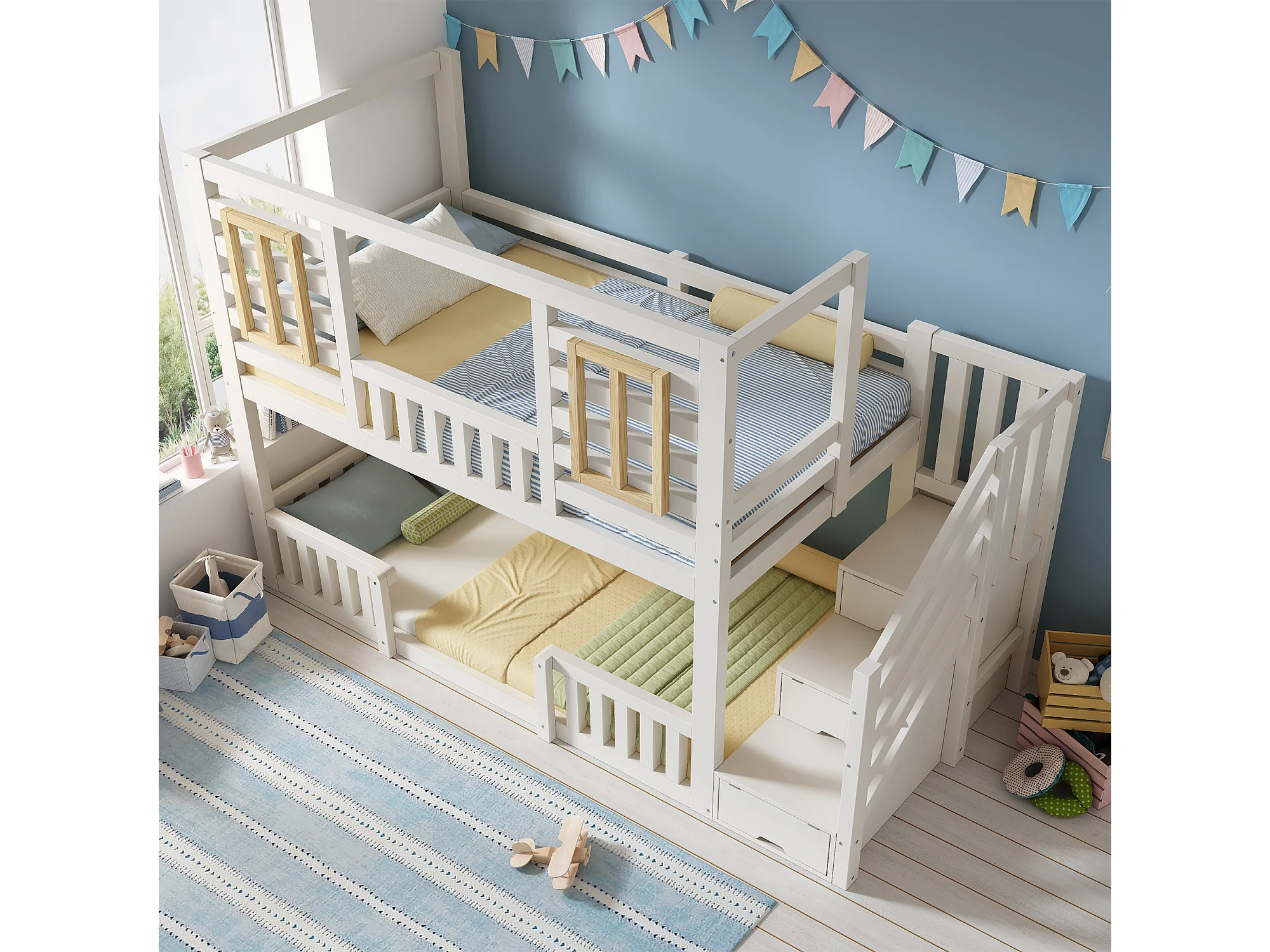 Lit superposé 90x200 cm - avec des fenêtres en bois - avec escalier de rangement - Blanc + Naturel (sans matelas)