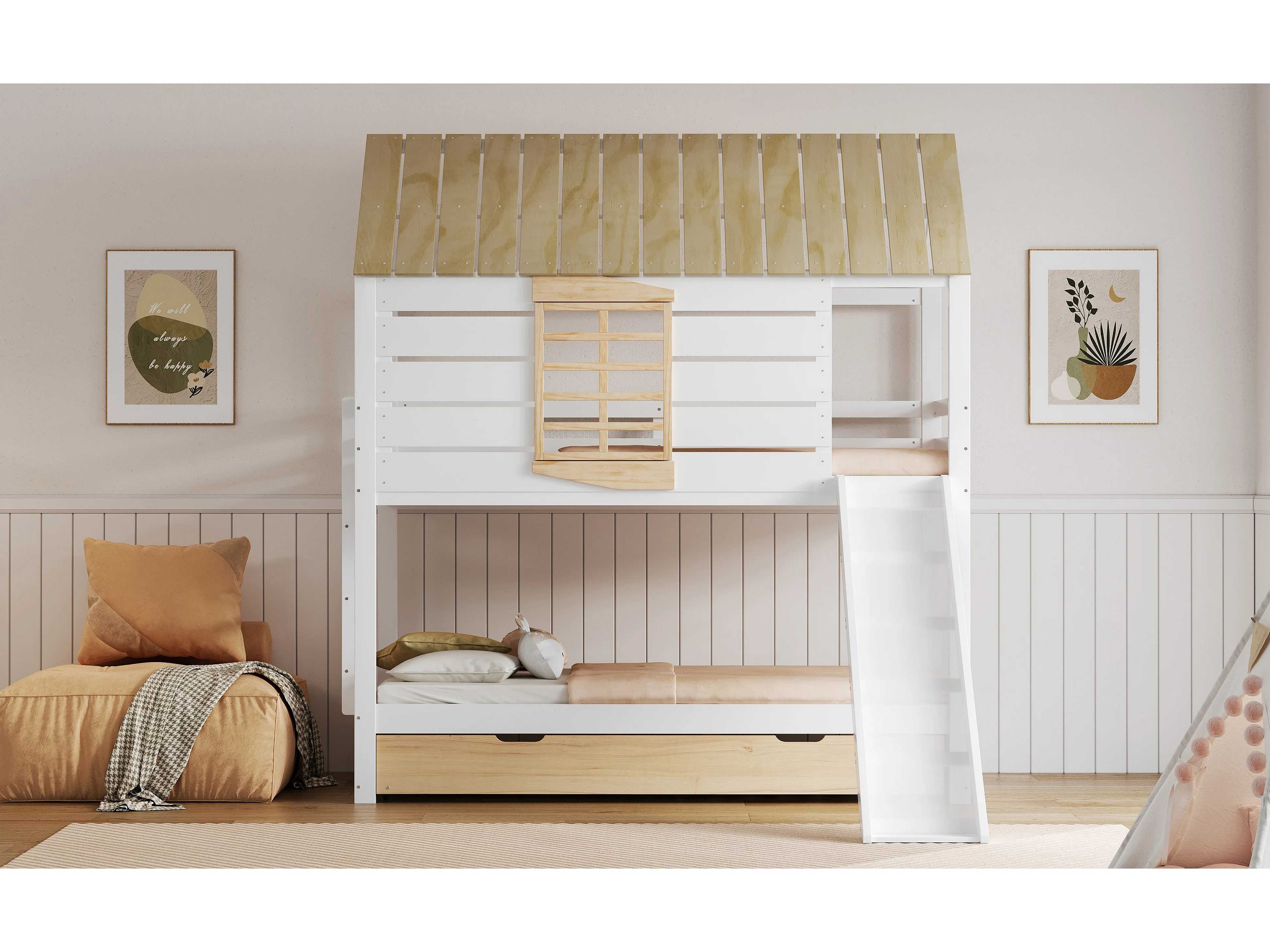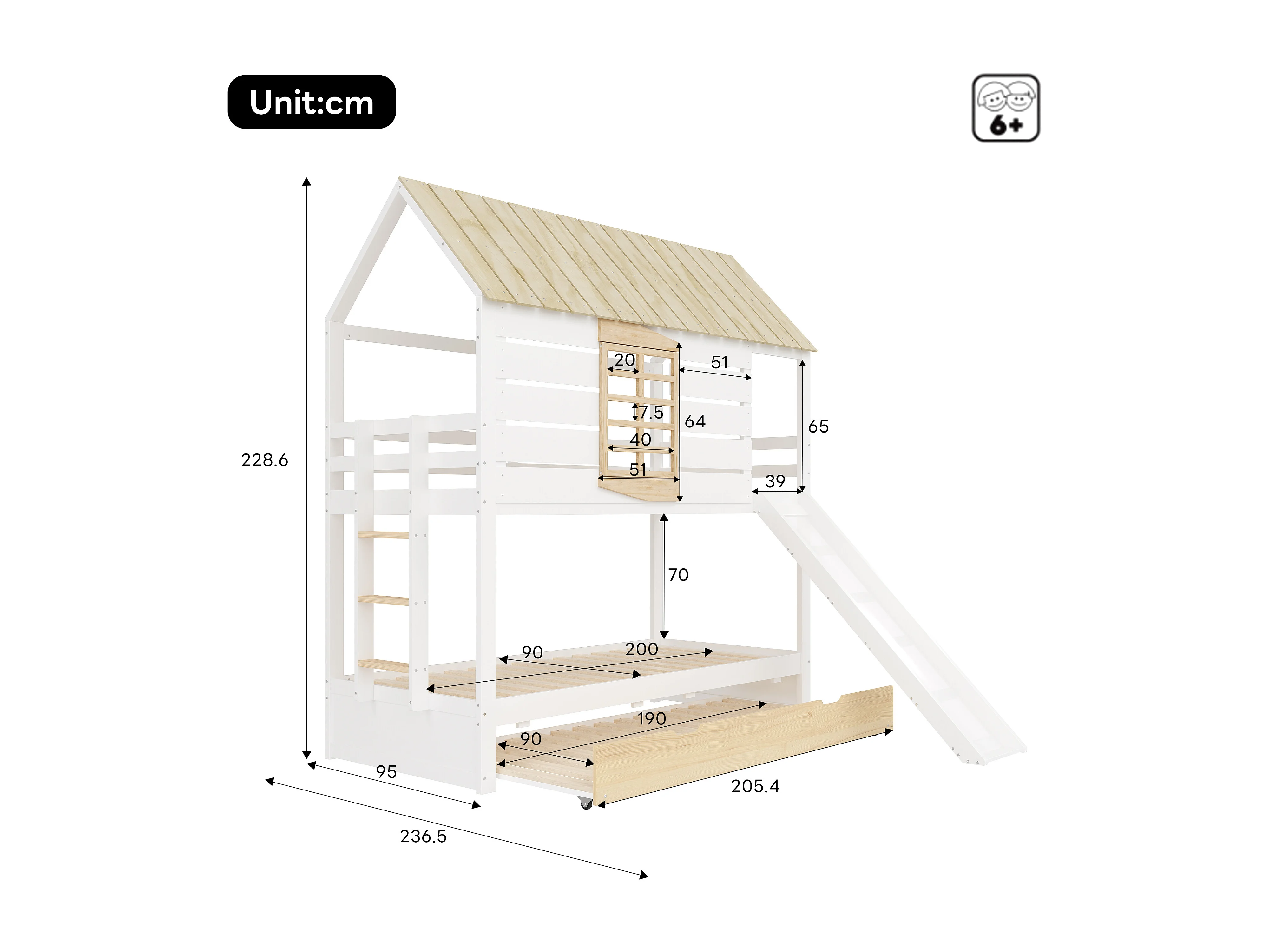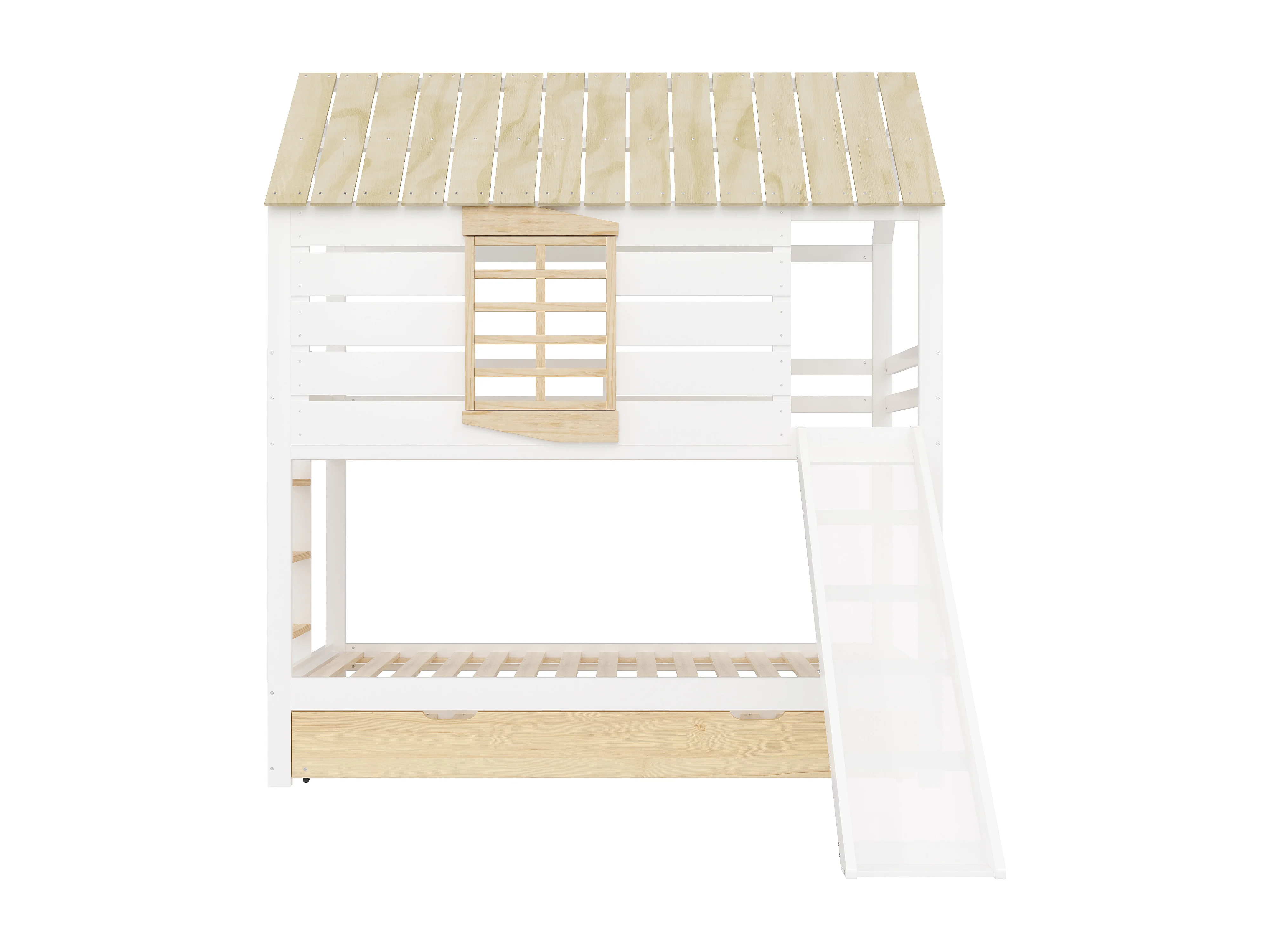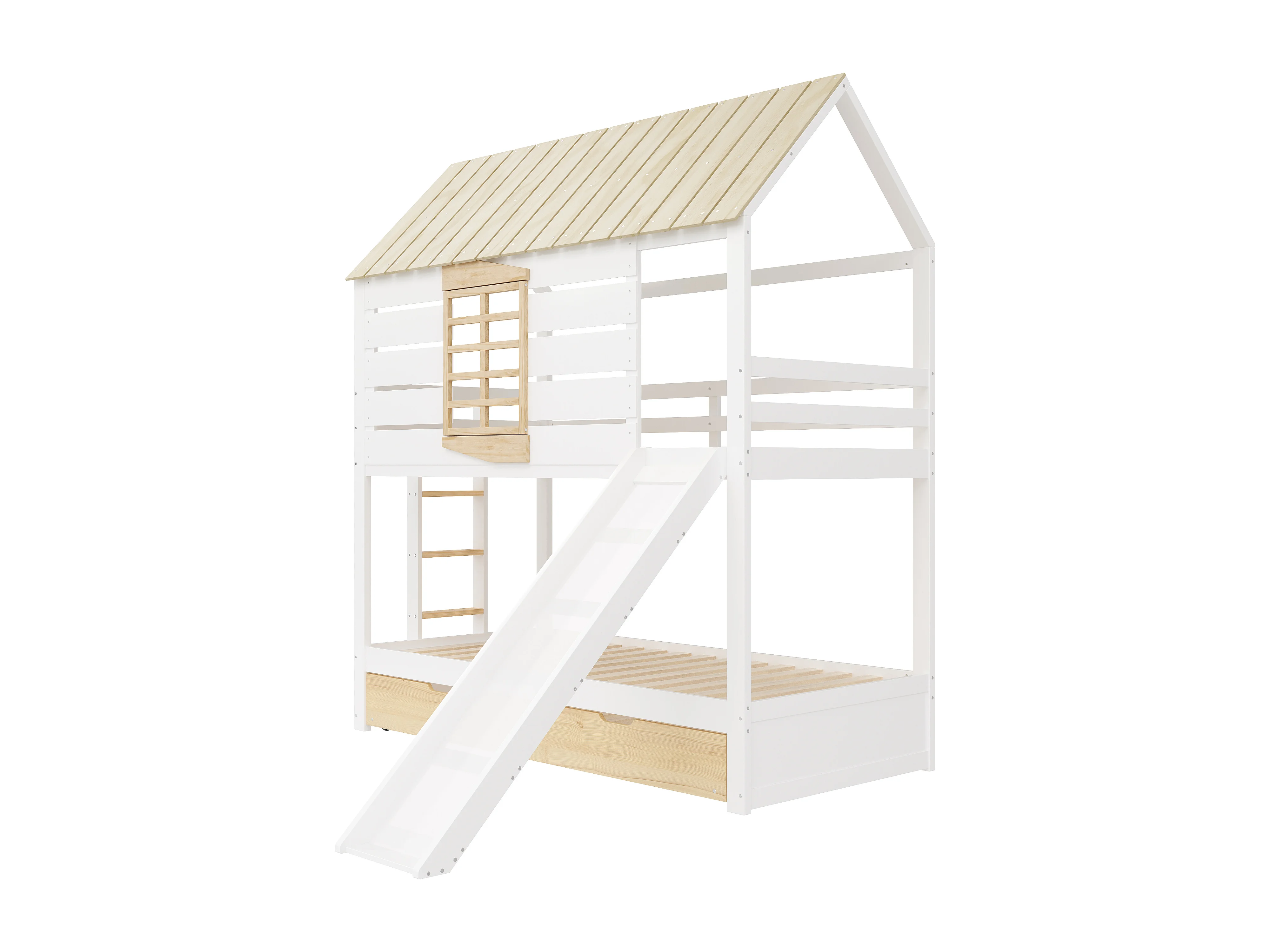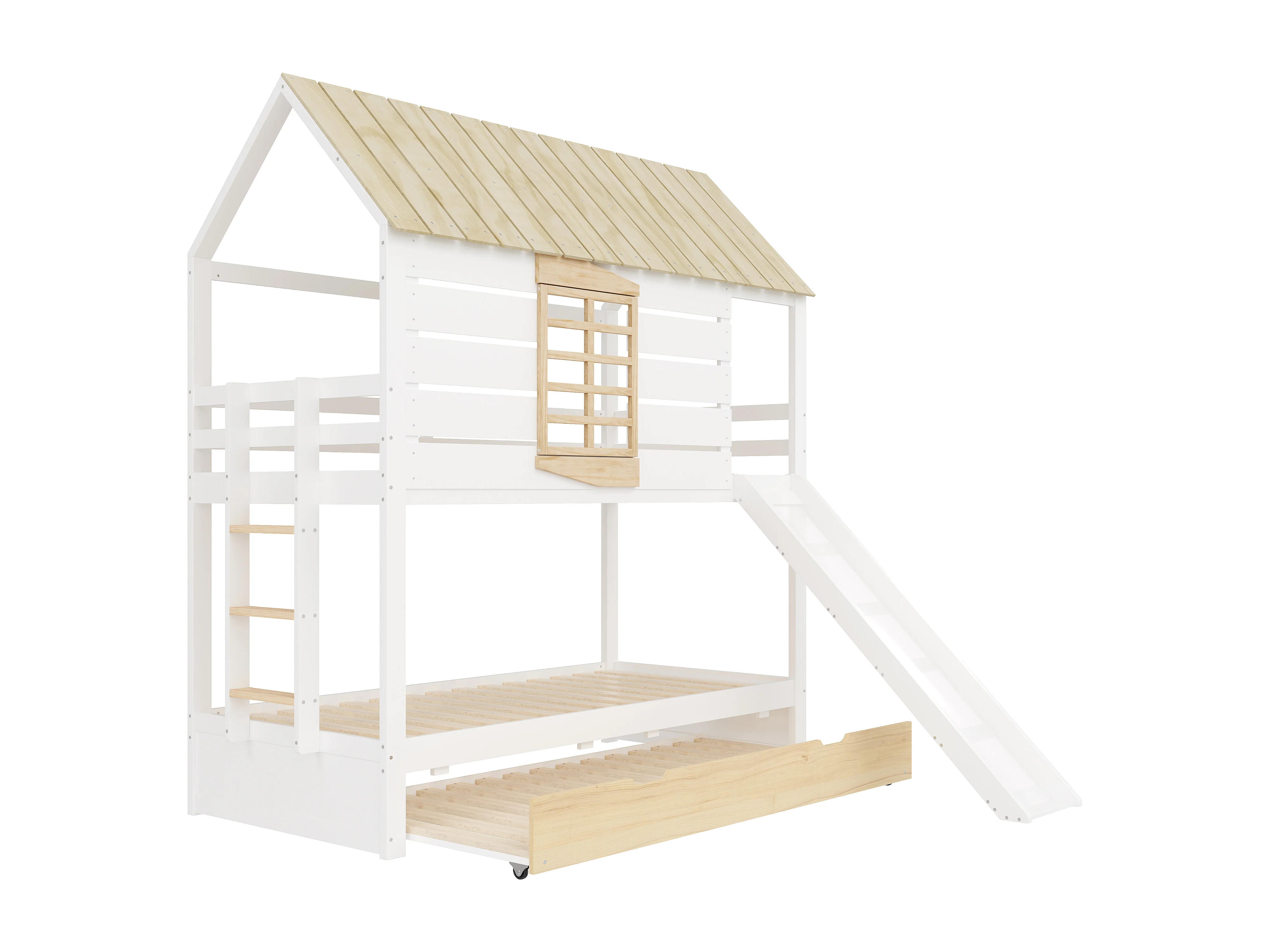 Lit superposé 90x200 cm avec lit gigogne 90x190 cm et toboggan - Lit cabane en bois pin et MDF - Blanc