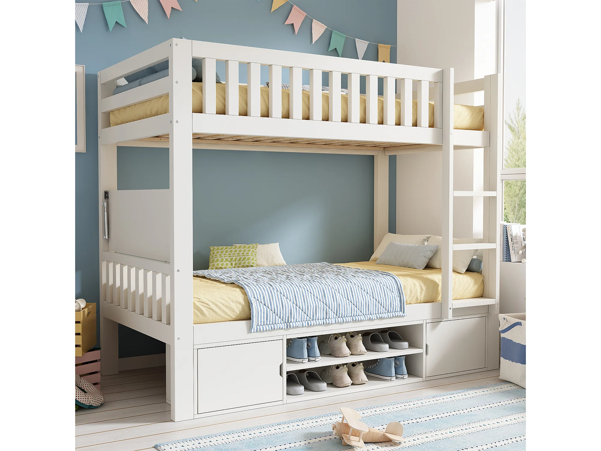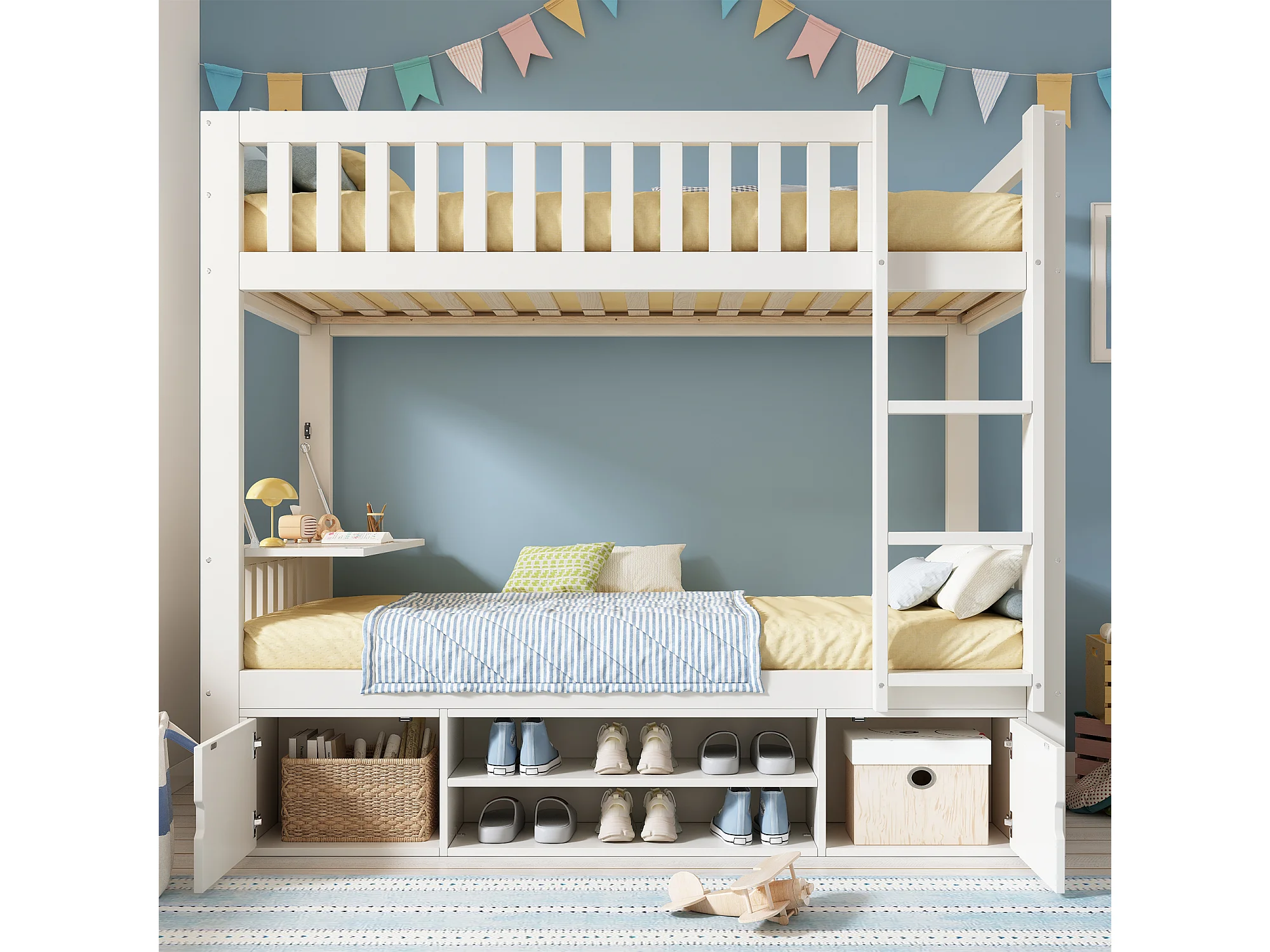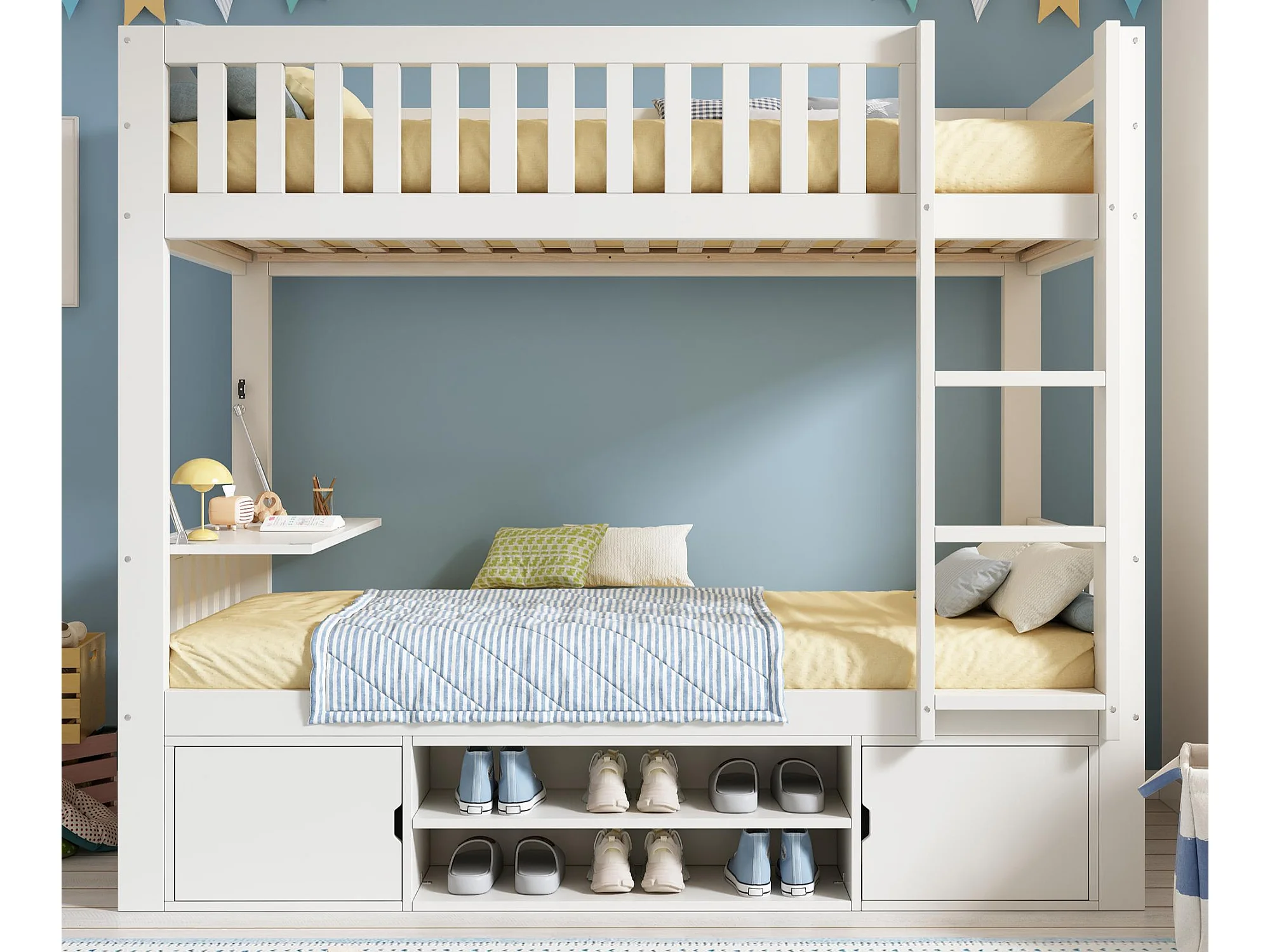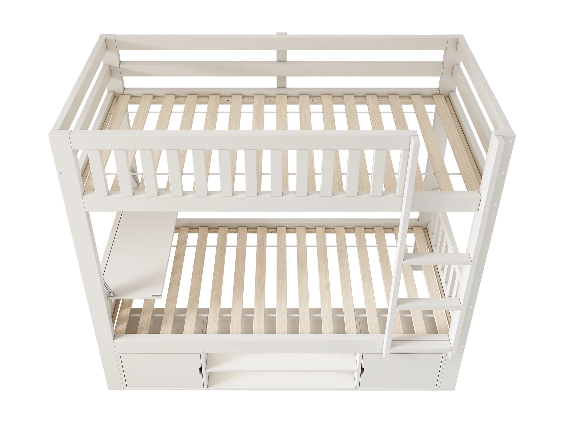 Lit superposé 90x200 cm - avec un bureau pliable - avec étagère à chaussures intégrée et échelle - Blanc (sans matelas)