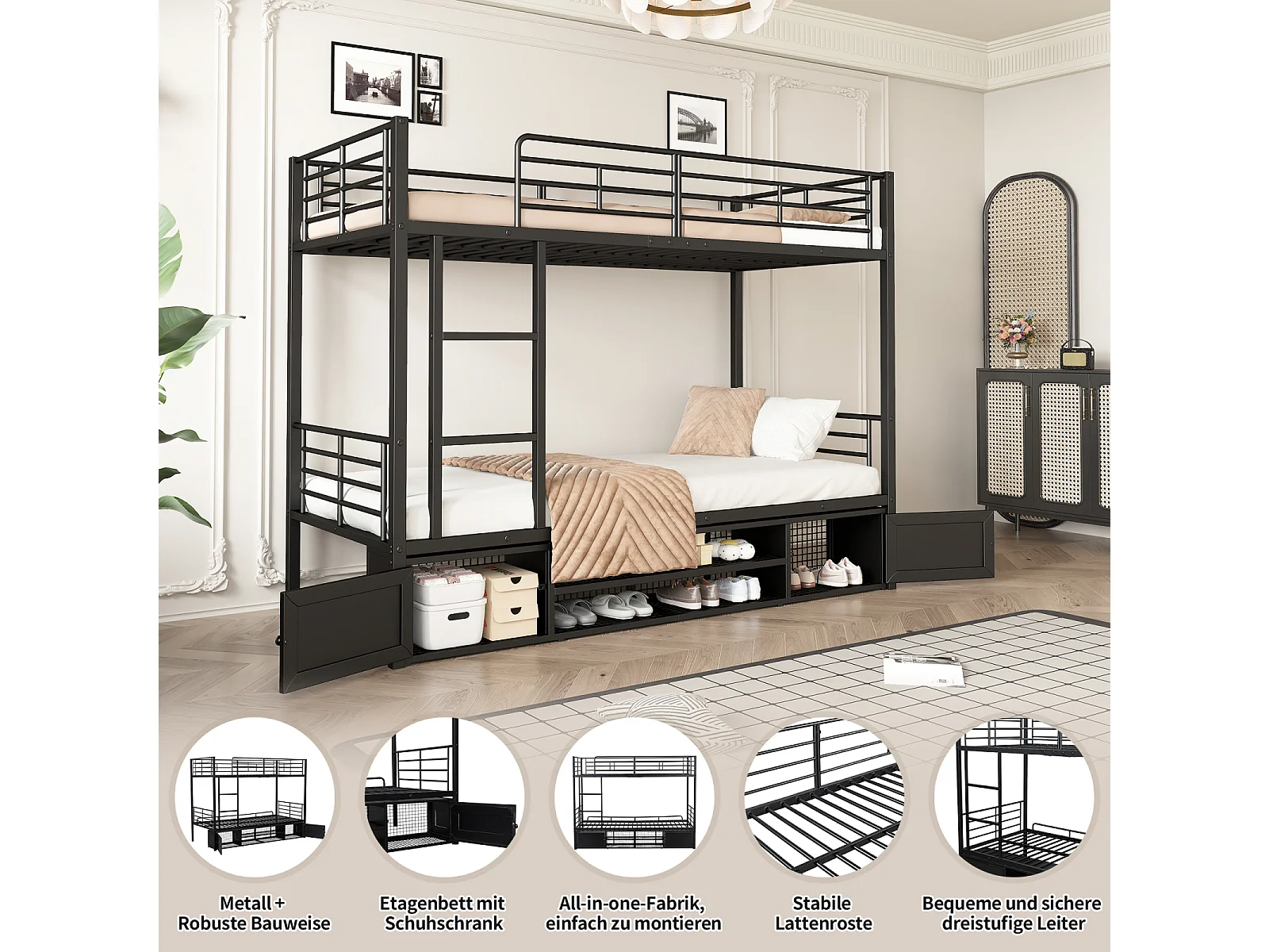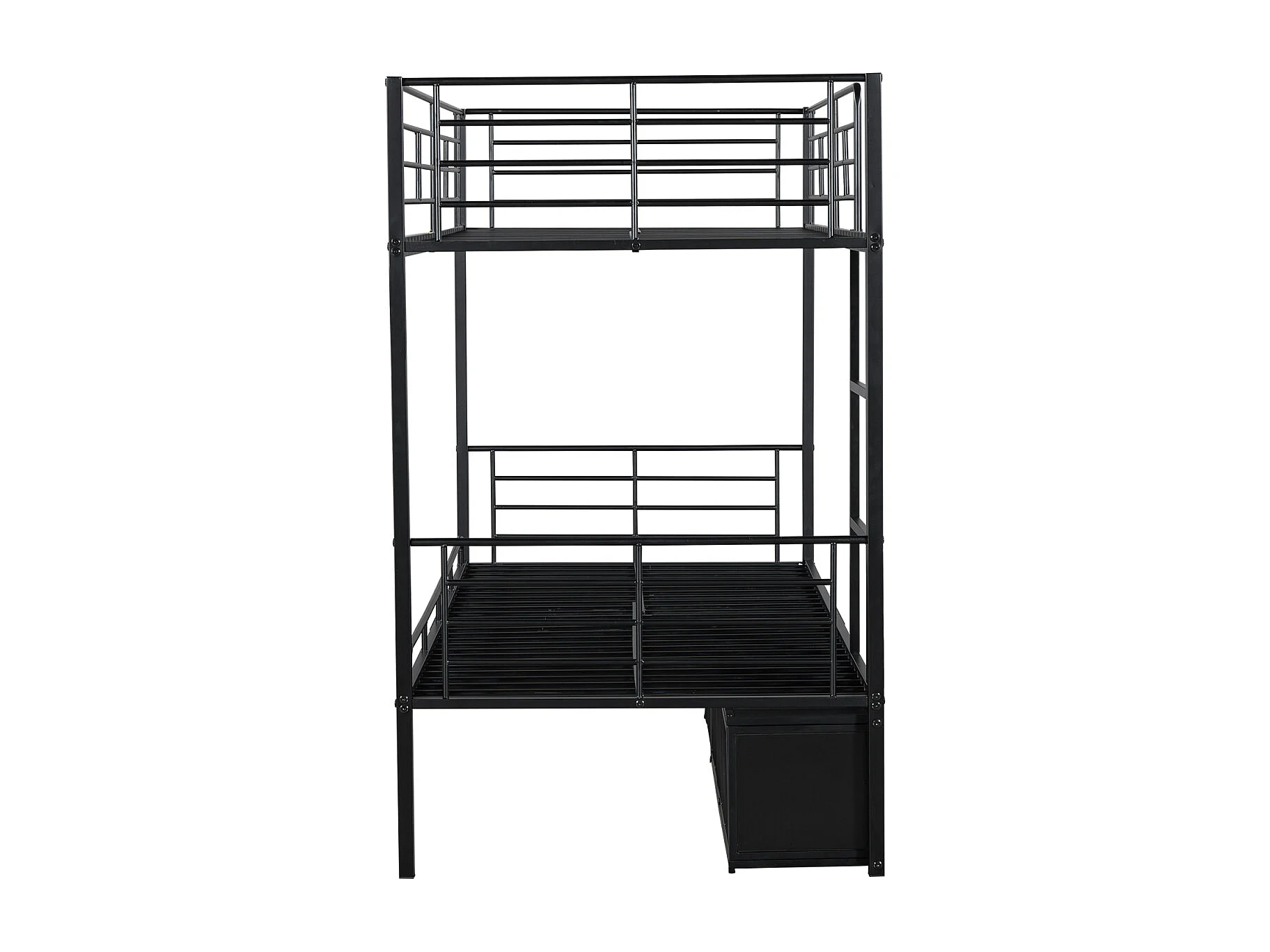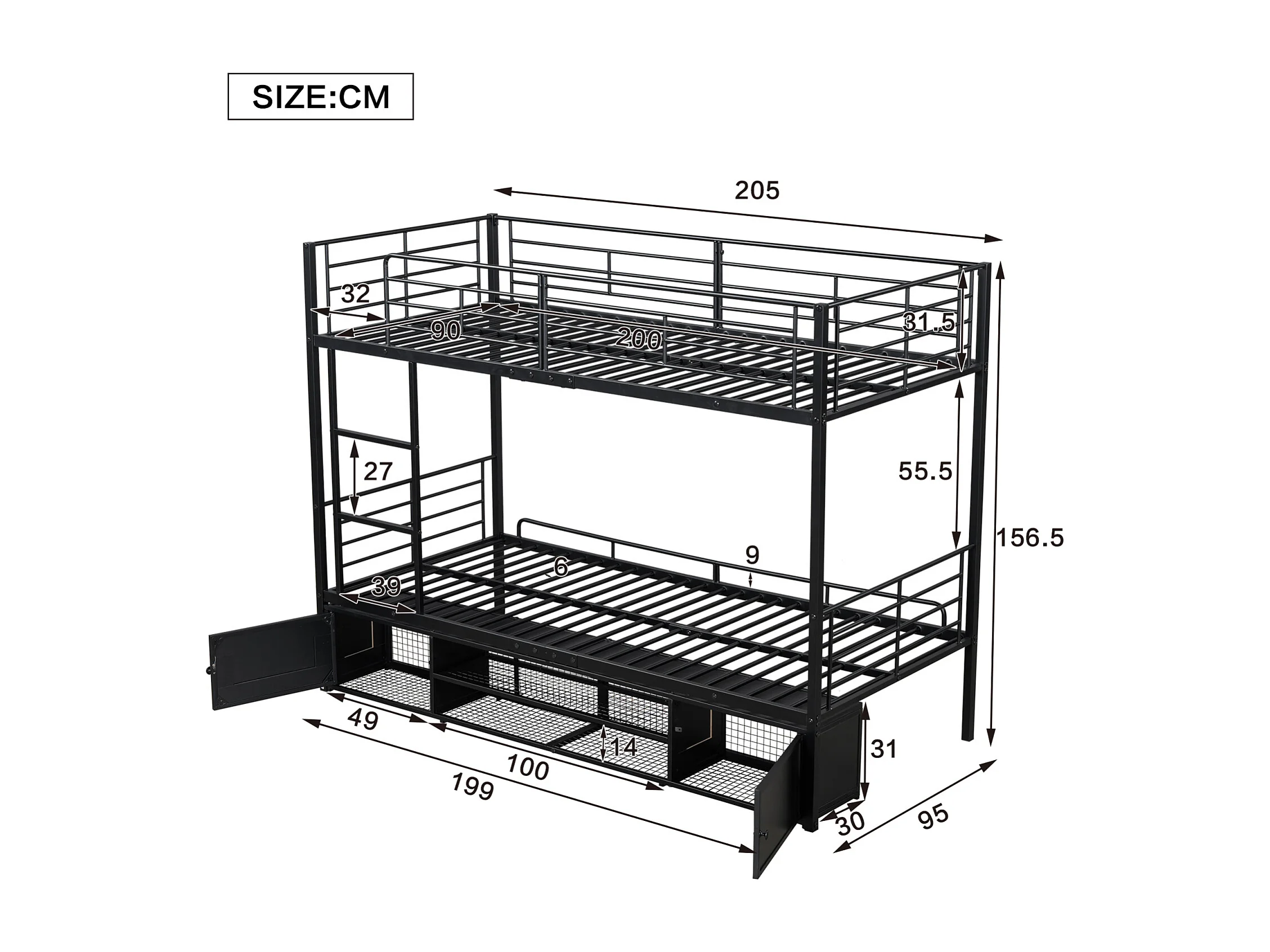 Lit superposé 90x200 cm en métal avec étagère ouverte et placard à deux portes, échelle latérale et barrière de sécurité - Noir