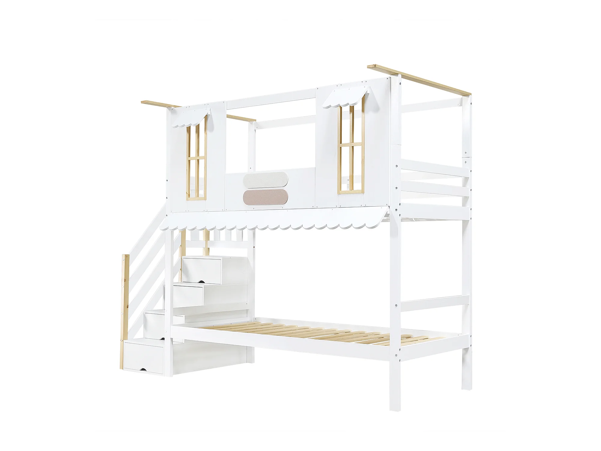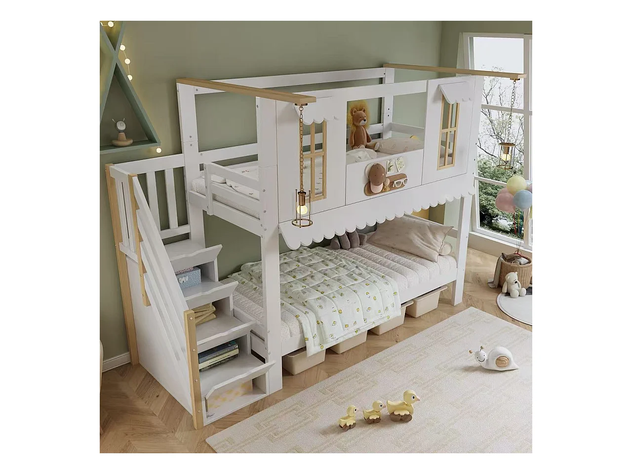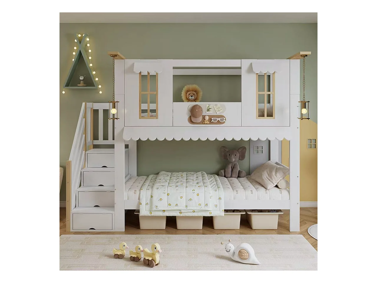 Lit superposé 90x200 cm - escalier avec rangement - avec des fenêtres exquises - avec 2 décorations en feutre - Bois massif + MDF - Blanc