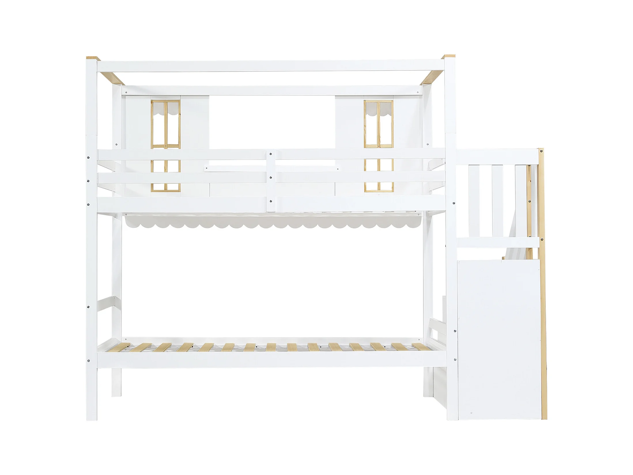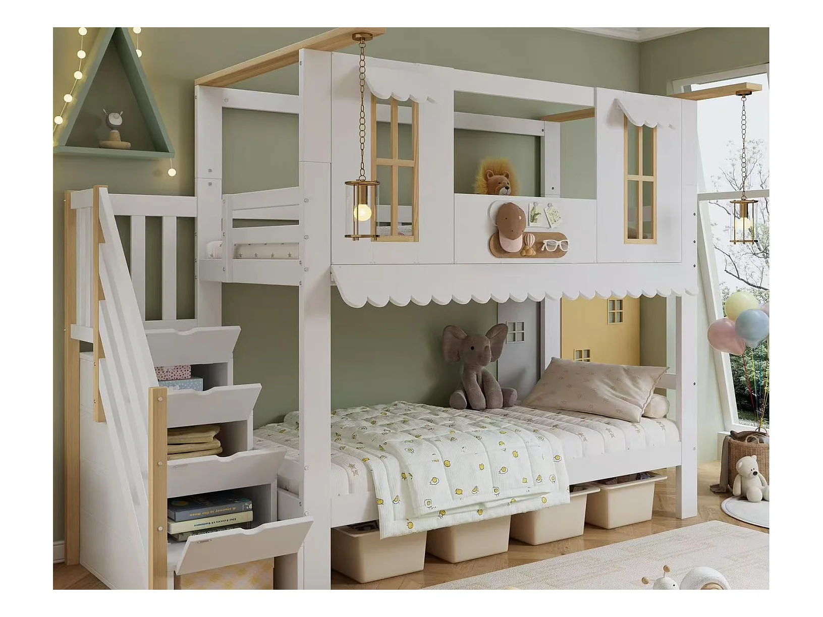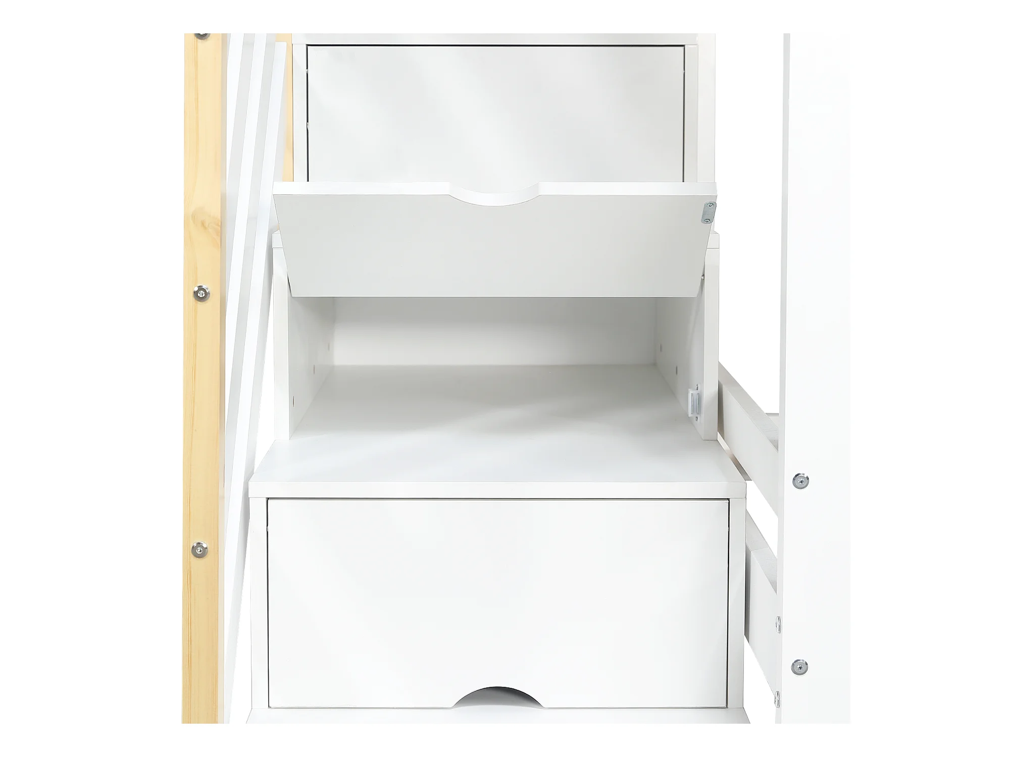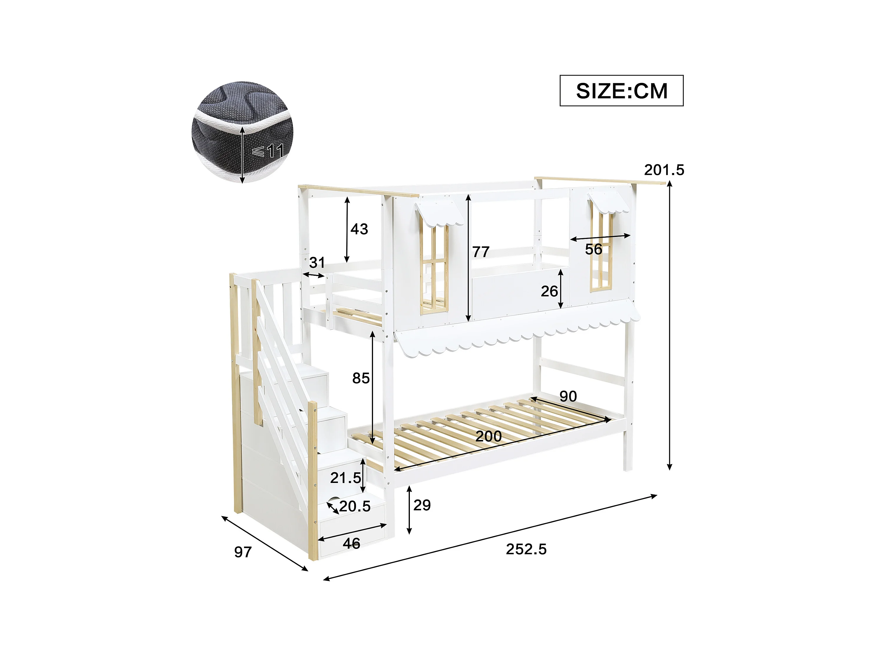 Lit superposé 90x200 cm - escalier avec rangement - avec des fenêtres exquises - avec 2 décorations en feutre - Bois massif + MDF - Blanc