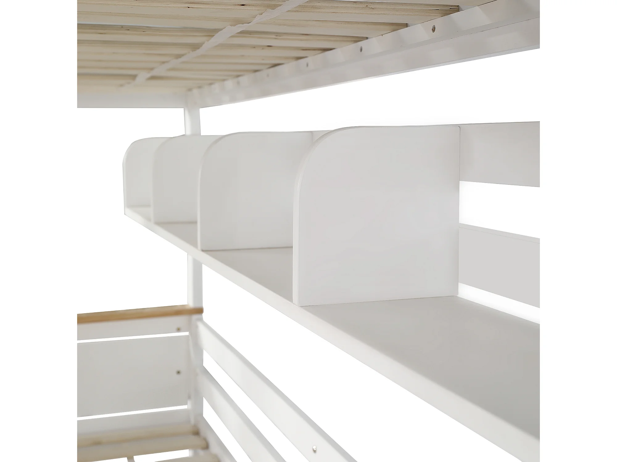 Lit superposé 90x200 cm et 140x200 cm avec étagères et 2 tiroirs - Couleur bois et blanc