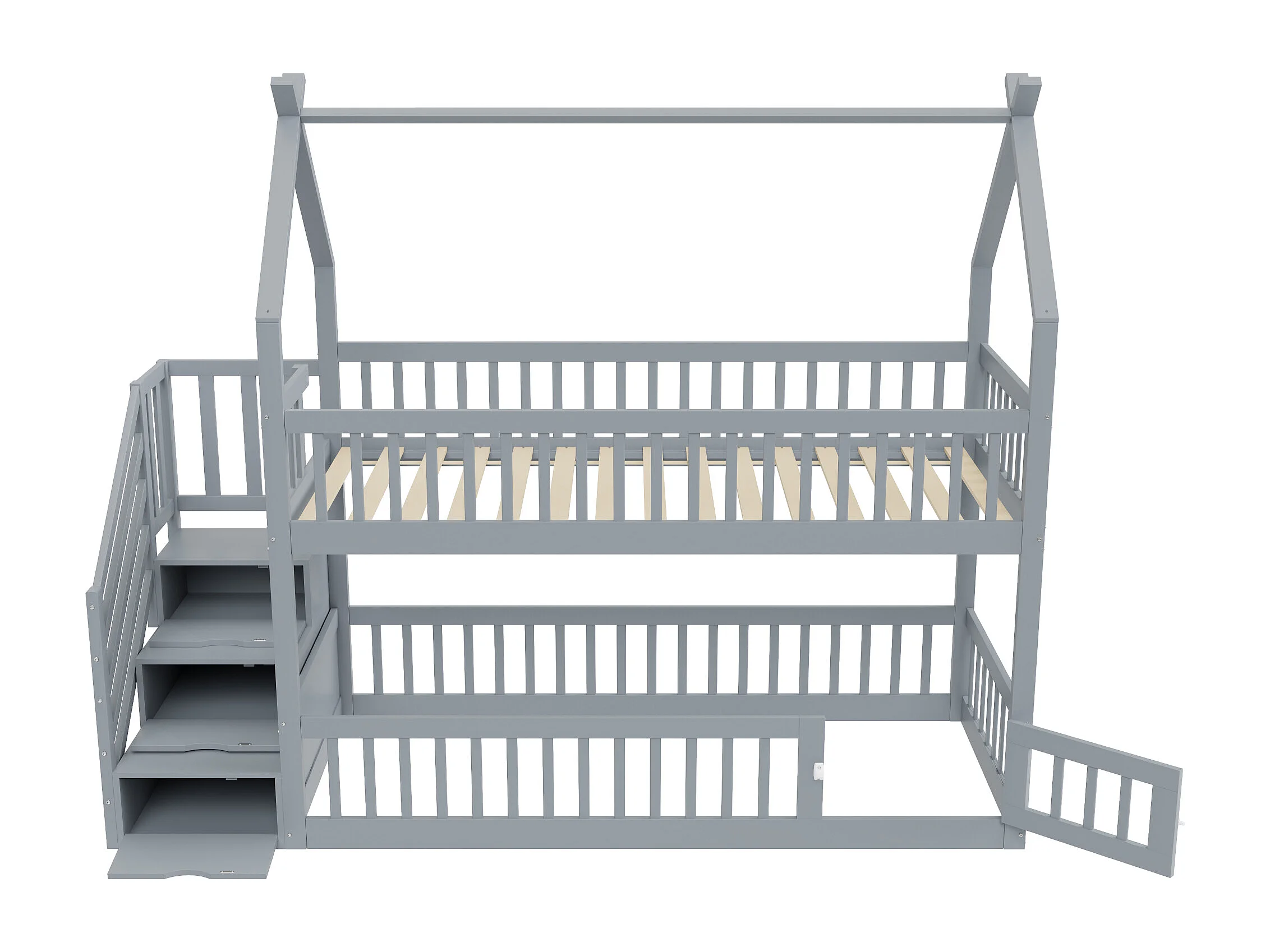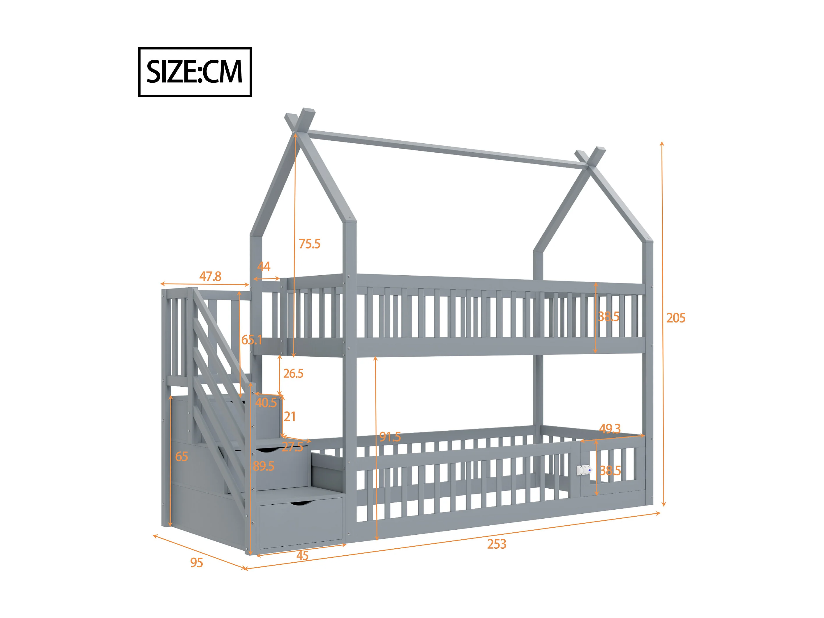 Lit superposé 90x200 cm - Lit enfant avec échelle de rangement et barrière de sécurité - gris - sans matelas