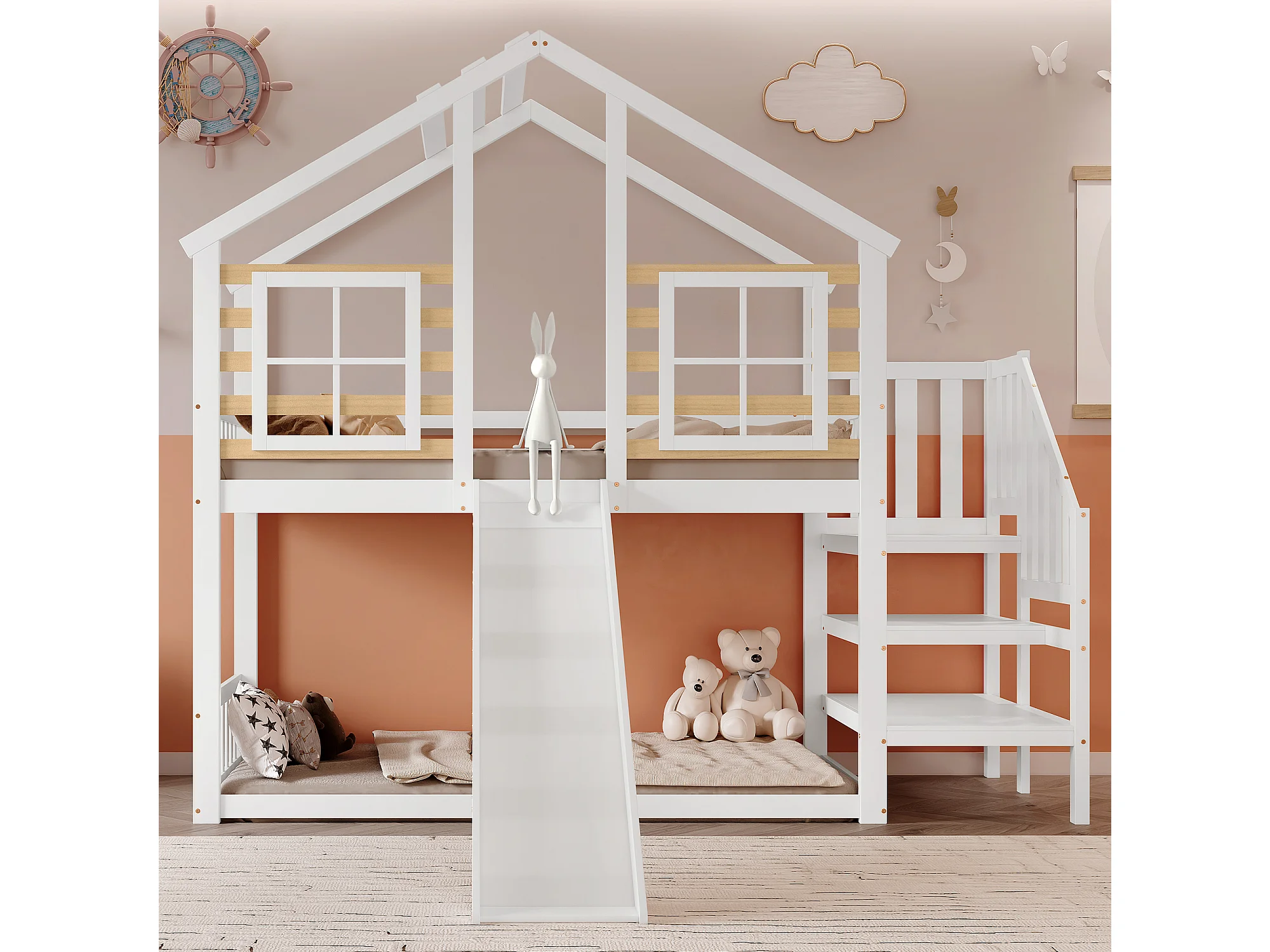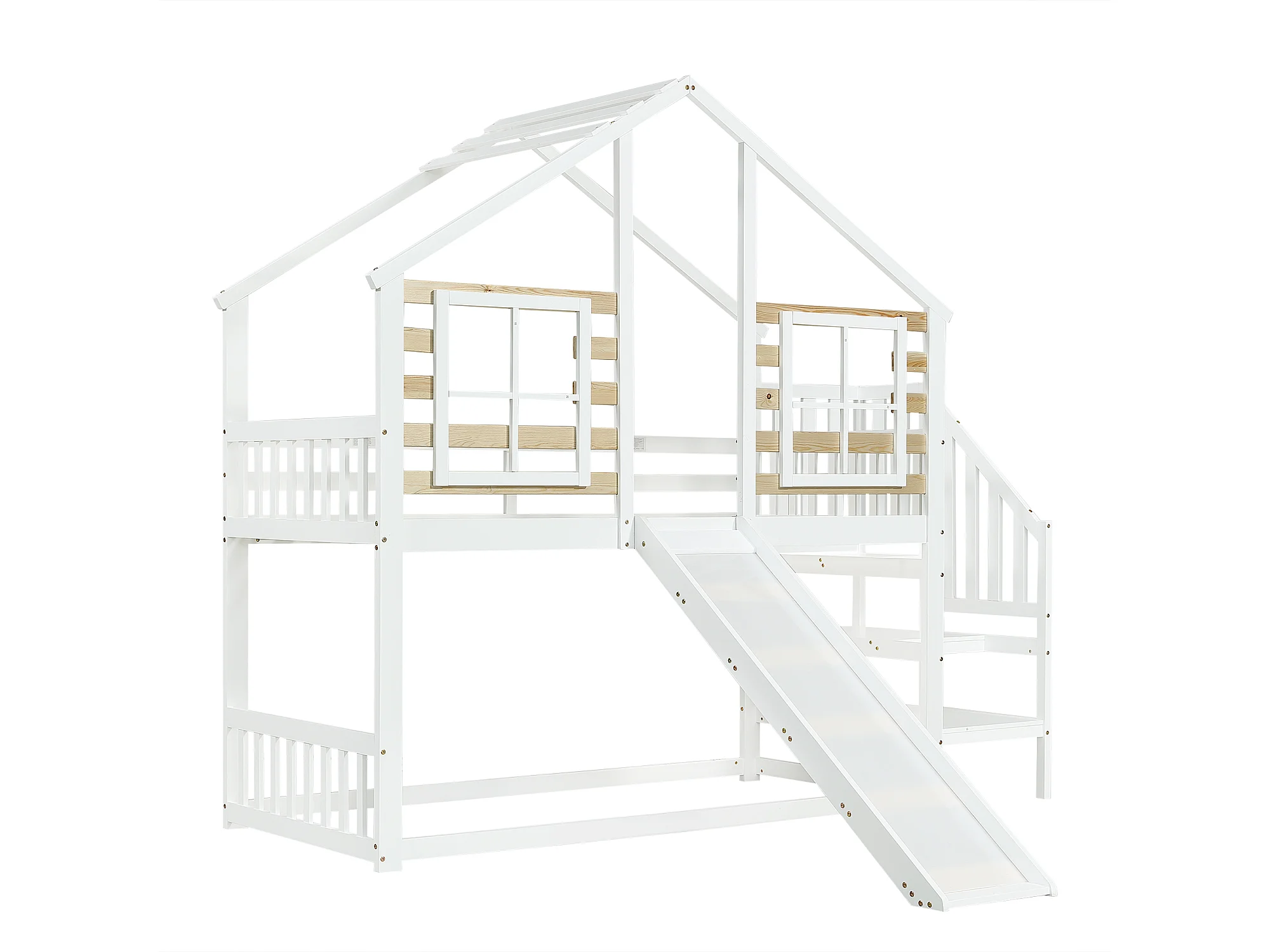 Lit superposé 90x200 cm - Lit enfant avec échelle et toboggan - blanc et naturel - sans matelas