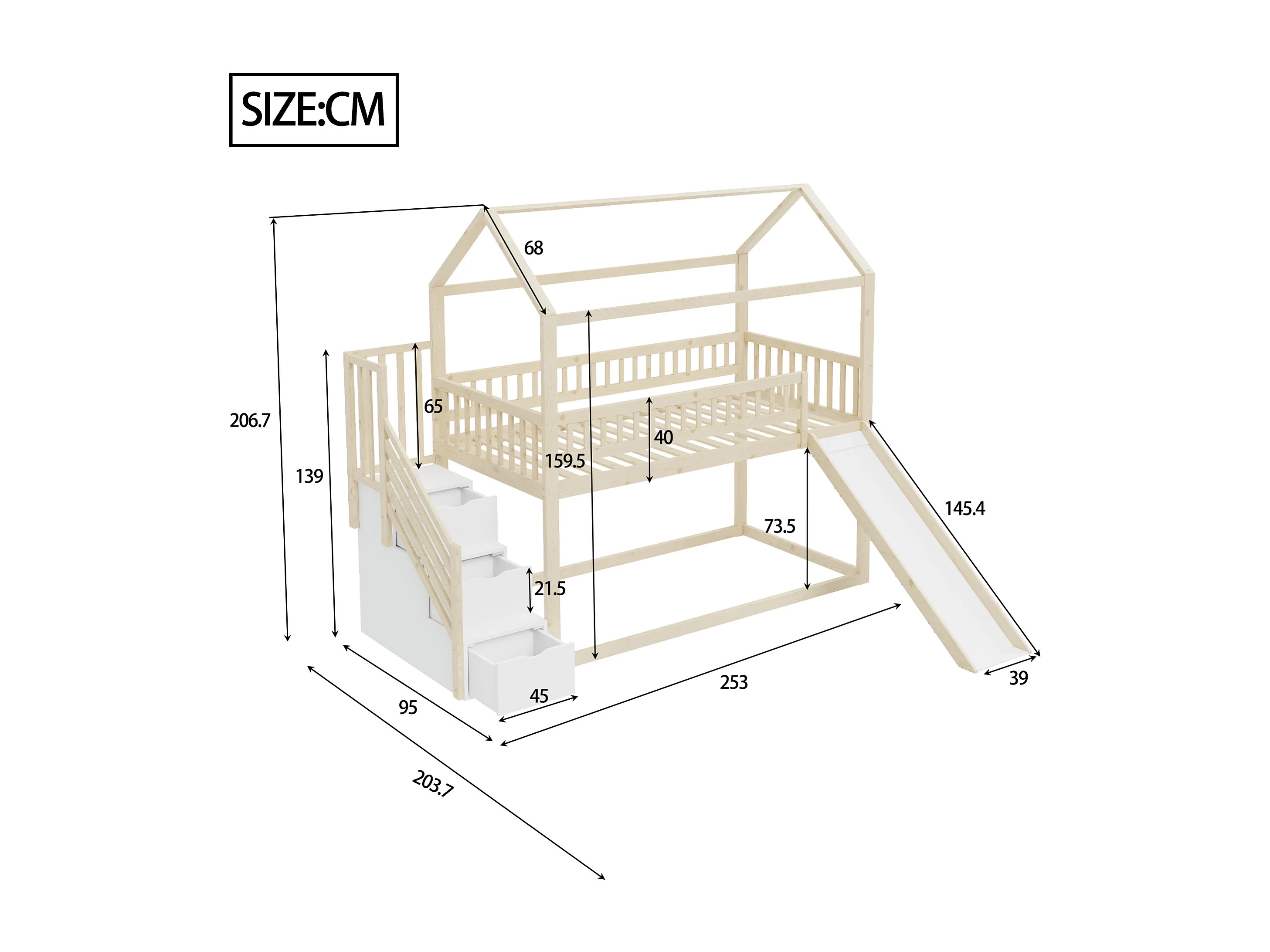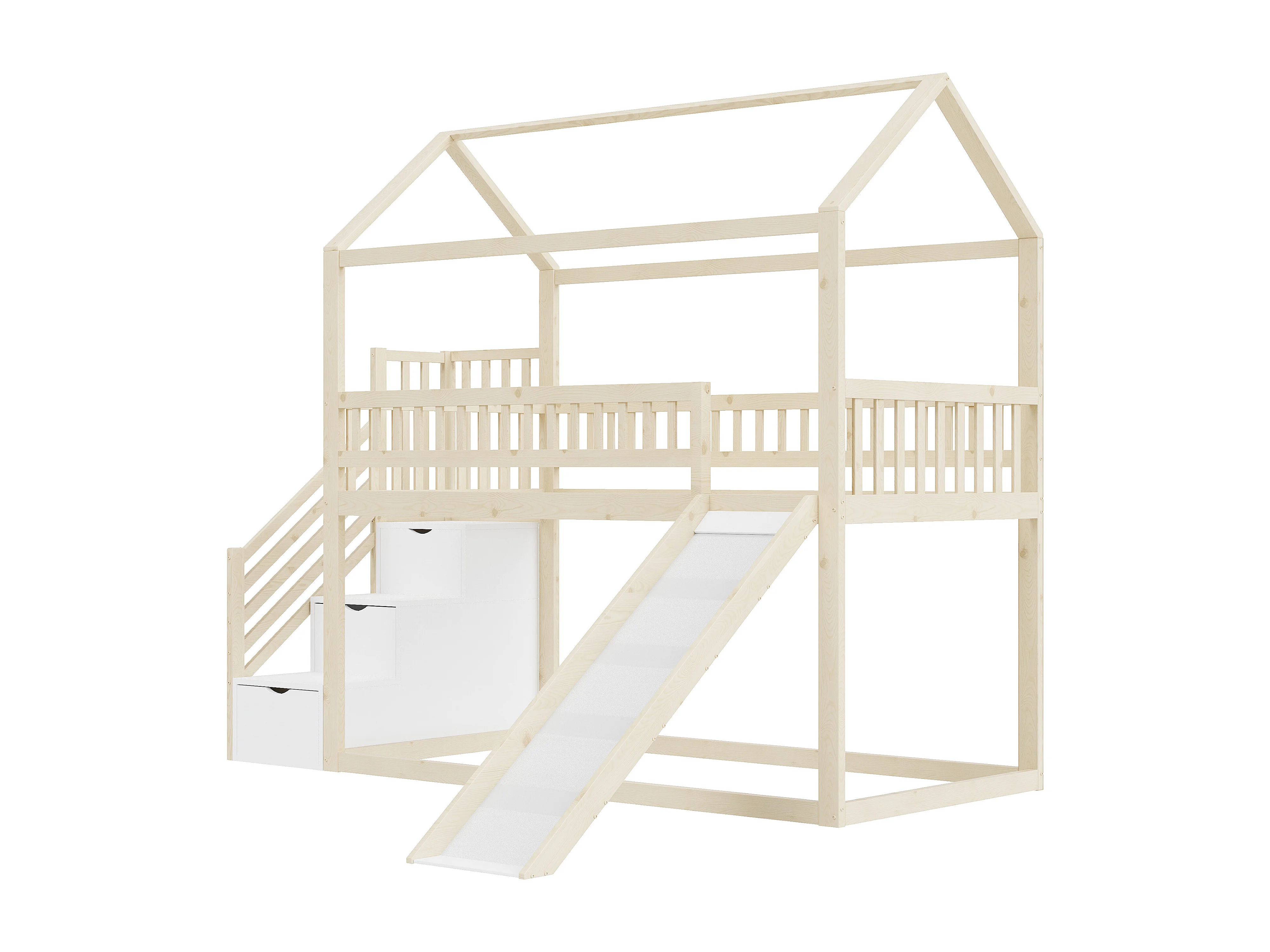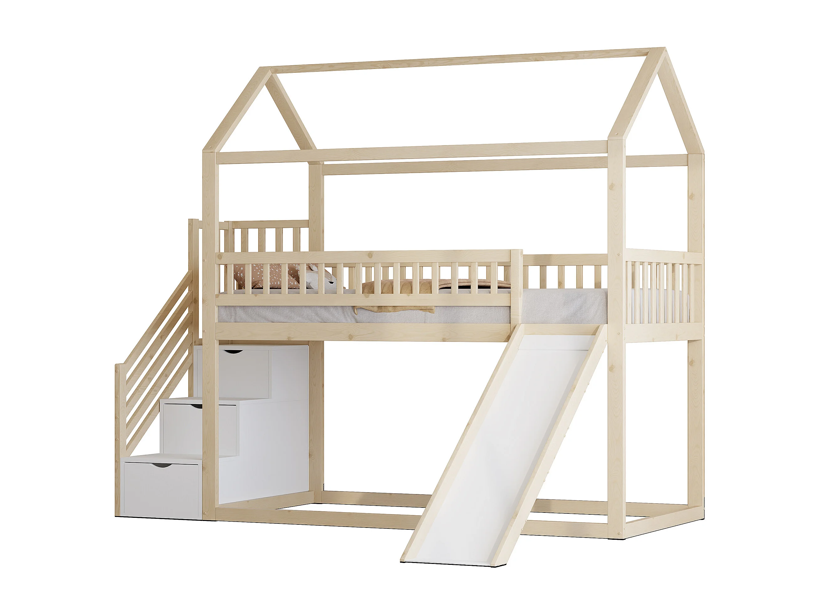 Lit superposé 90x200 cm, lit enfant avec toboggan et échelle de rangement, bois naturel, sans matelas