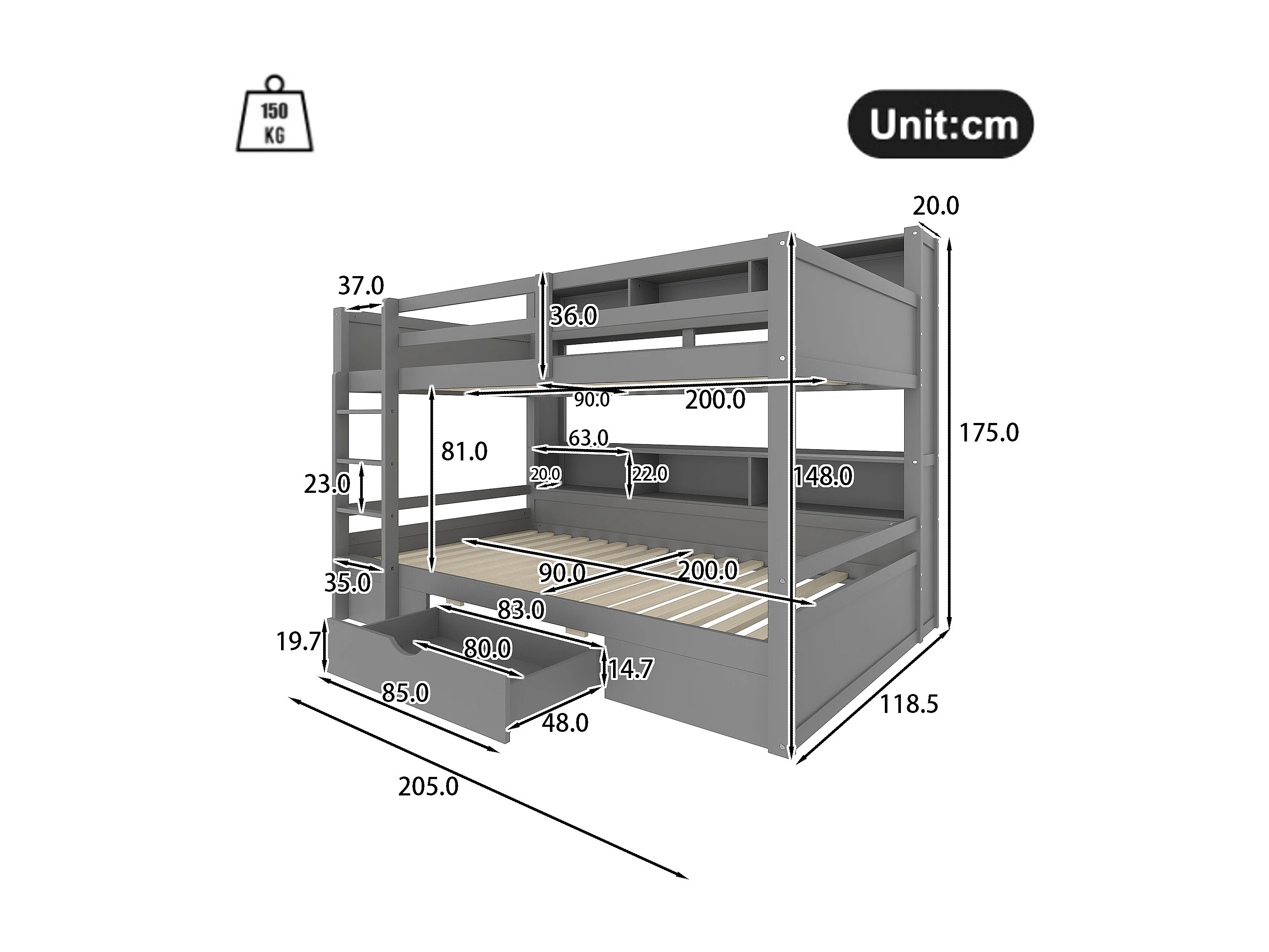 Lit superposé 90x200 cm, lit simple pour enfant avec tiroirs et compartiments de rangement, sans matelas, Gris