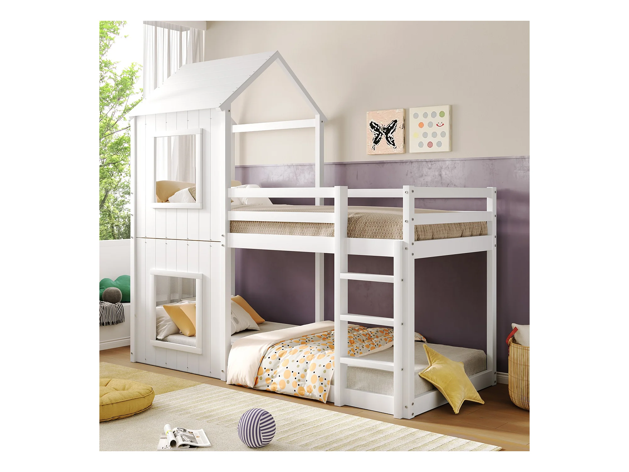 Lit superposé 90x200 cm, maison pour enfants, avec échelle et canopy, en bois massif, blanc (204x98.5x110 cm)