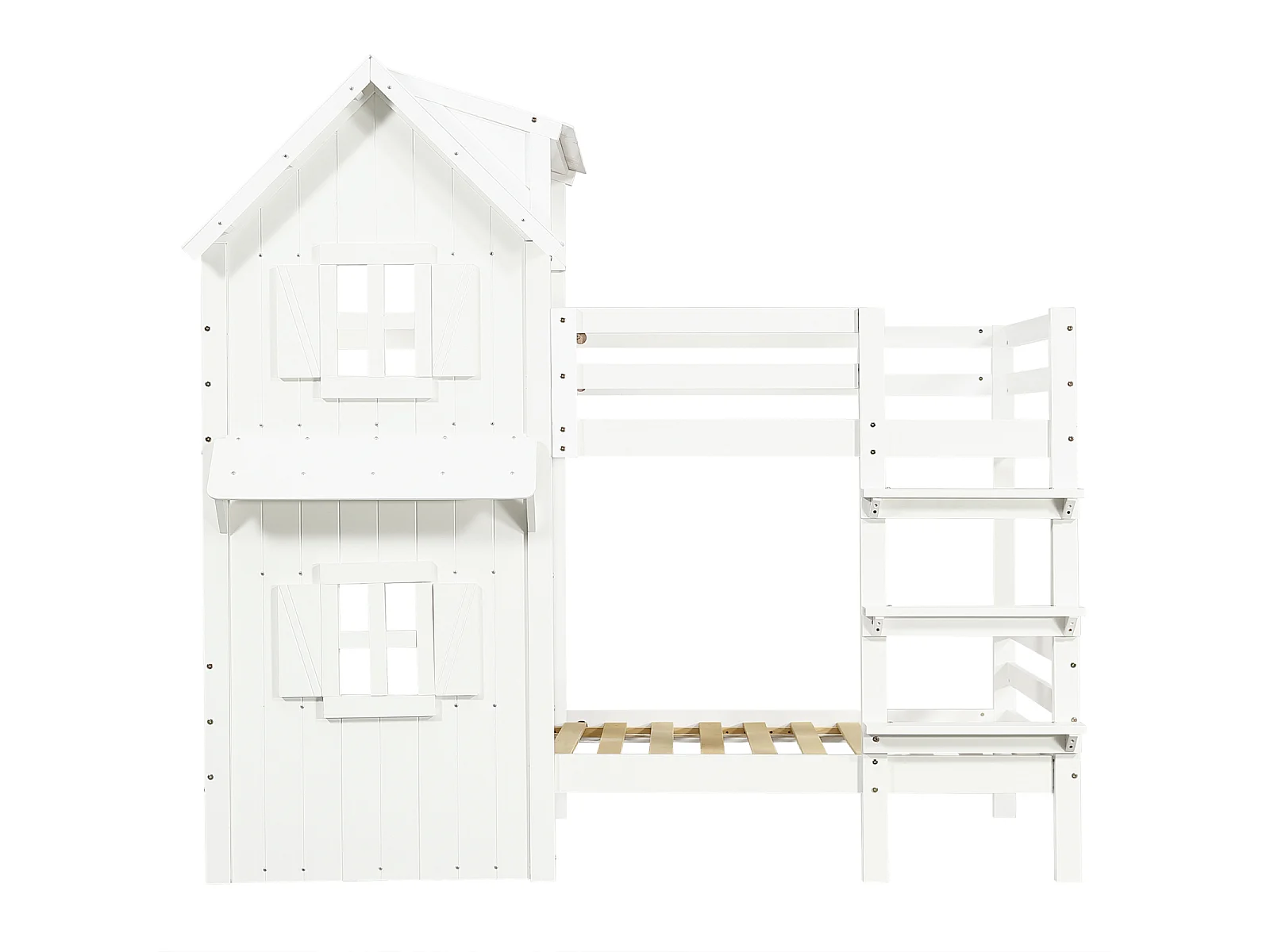 Lit superposé 90x200 cm pour enfant avec fenêtres et toit, garde-corps latéraux, échelle 3 niveaux et sommier stable – Pin + MDF, Blanc