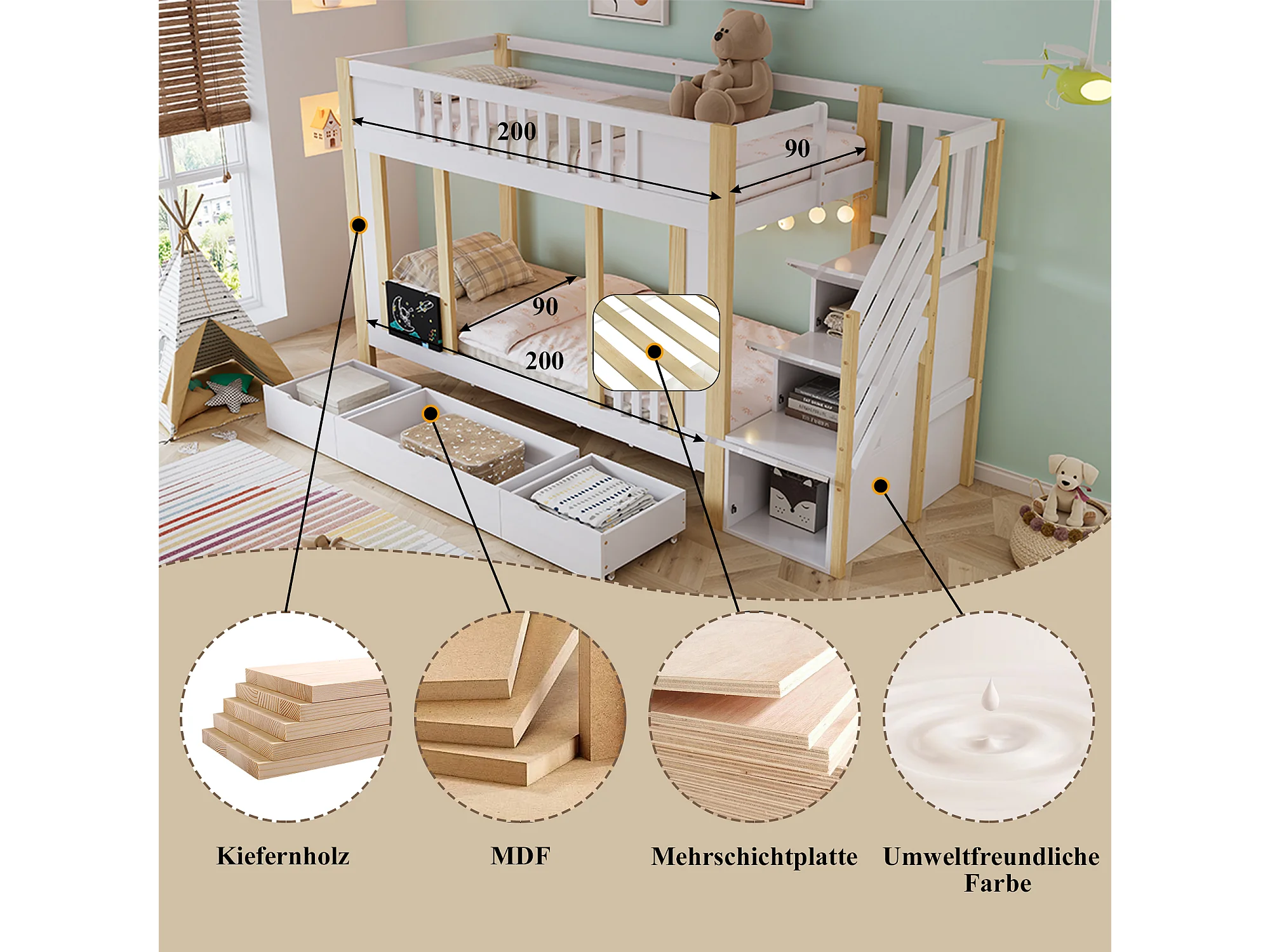 Lit superposé 90x200 cm pour enfant avec rangement sous l’escalier, 3 tiroirs sur roulettes et table de dessin – Pin + MDF + PB, Blanc et Naturel