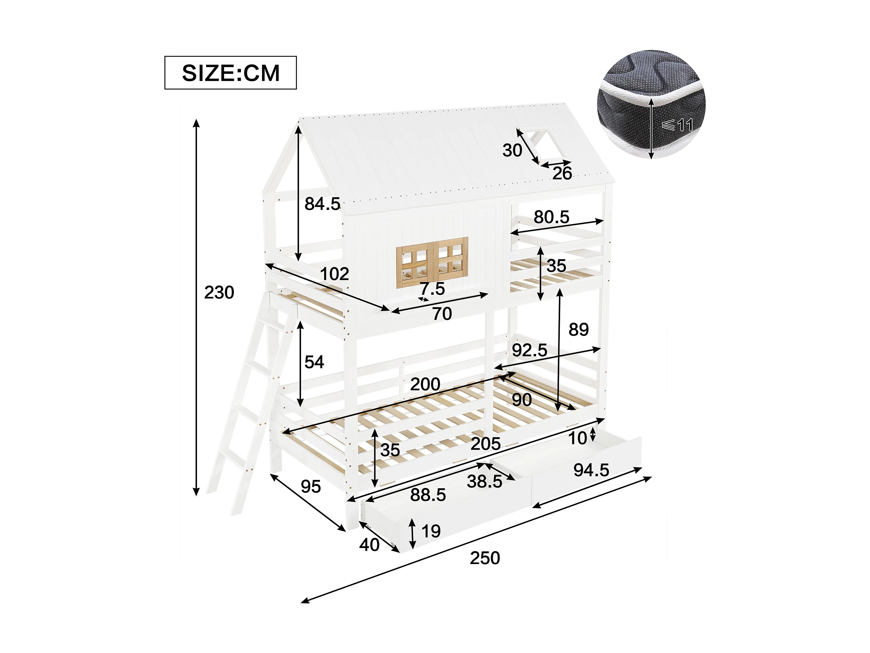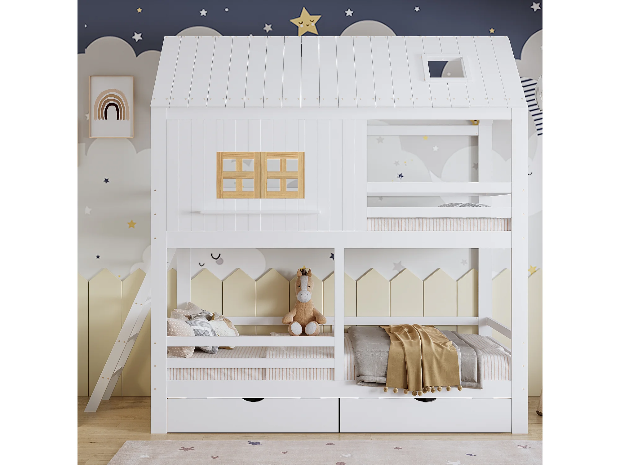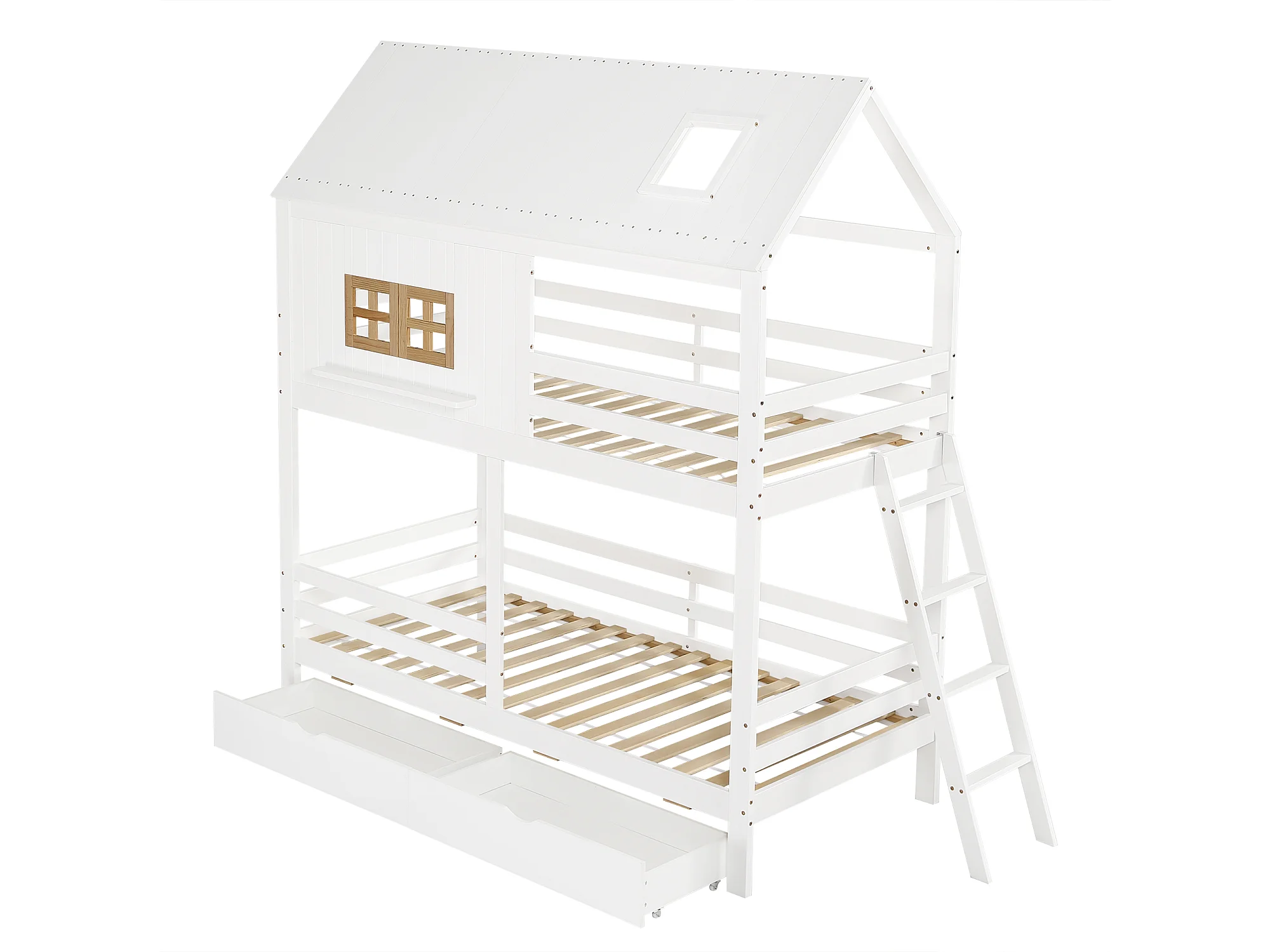 Lit superposé 90x200cm avec deux tiroirs sommier à lattes et échelle en blanc et couleurs naturelles pour enfants (sans matelas)