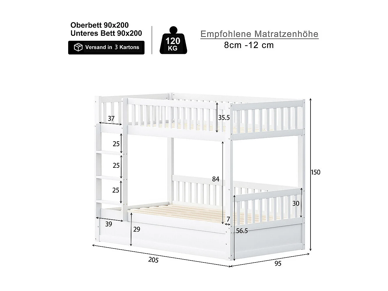 Lit superposé 90x200cm, avec système de rangement hydraulique en bois massif, lit d'enfant, bois de pin, blanc
