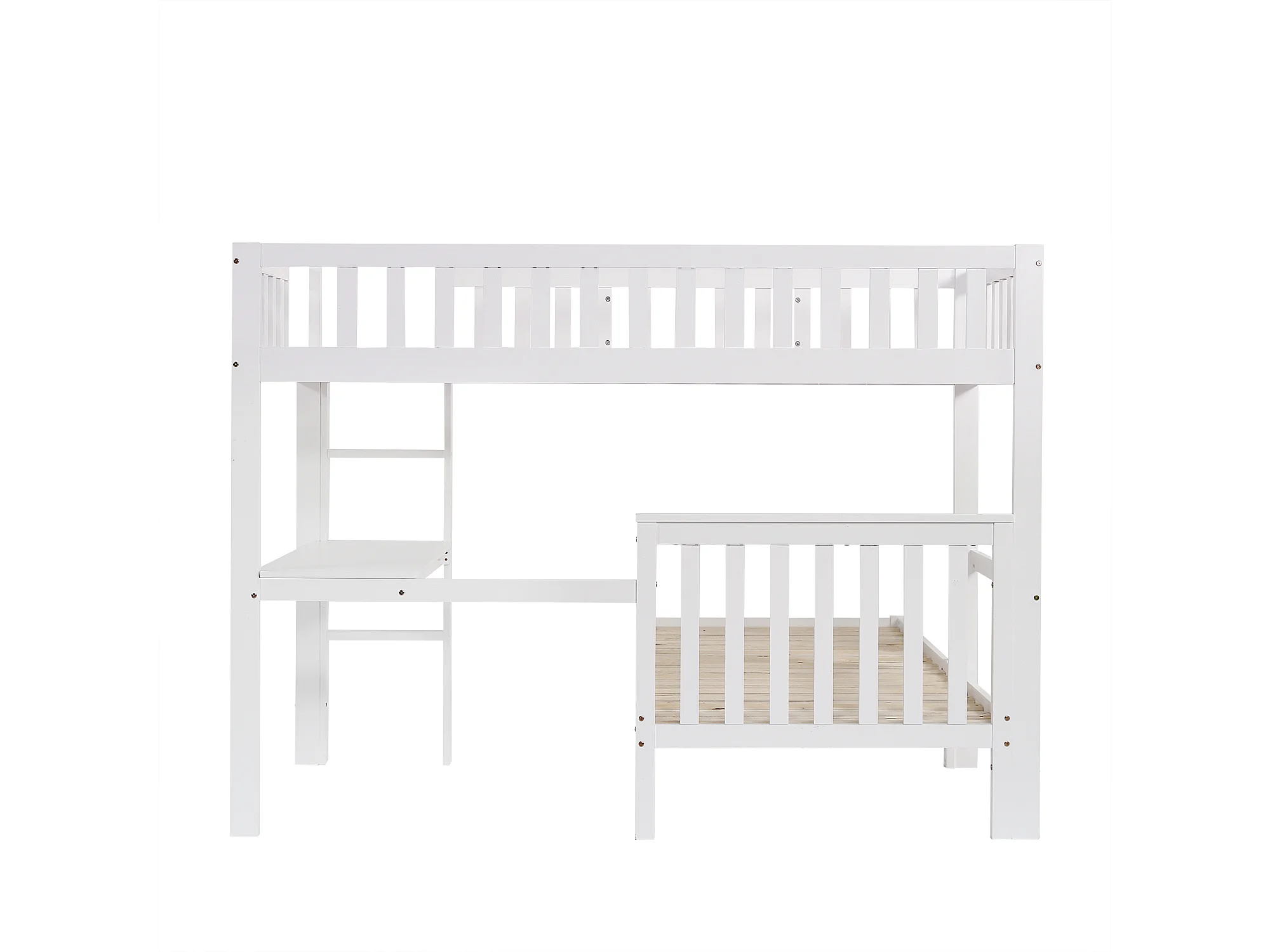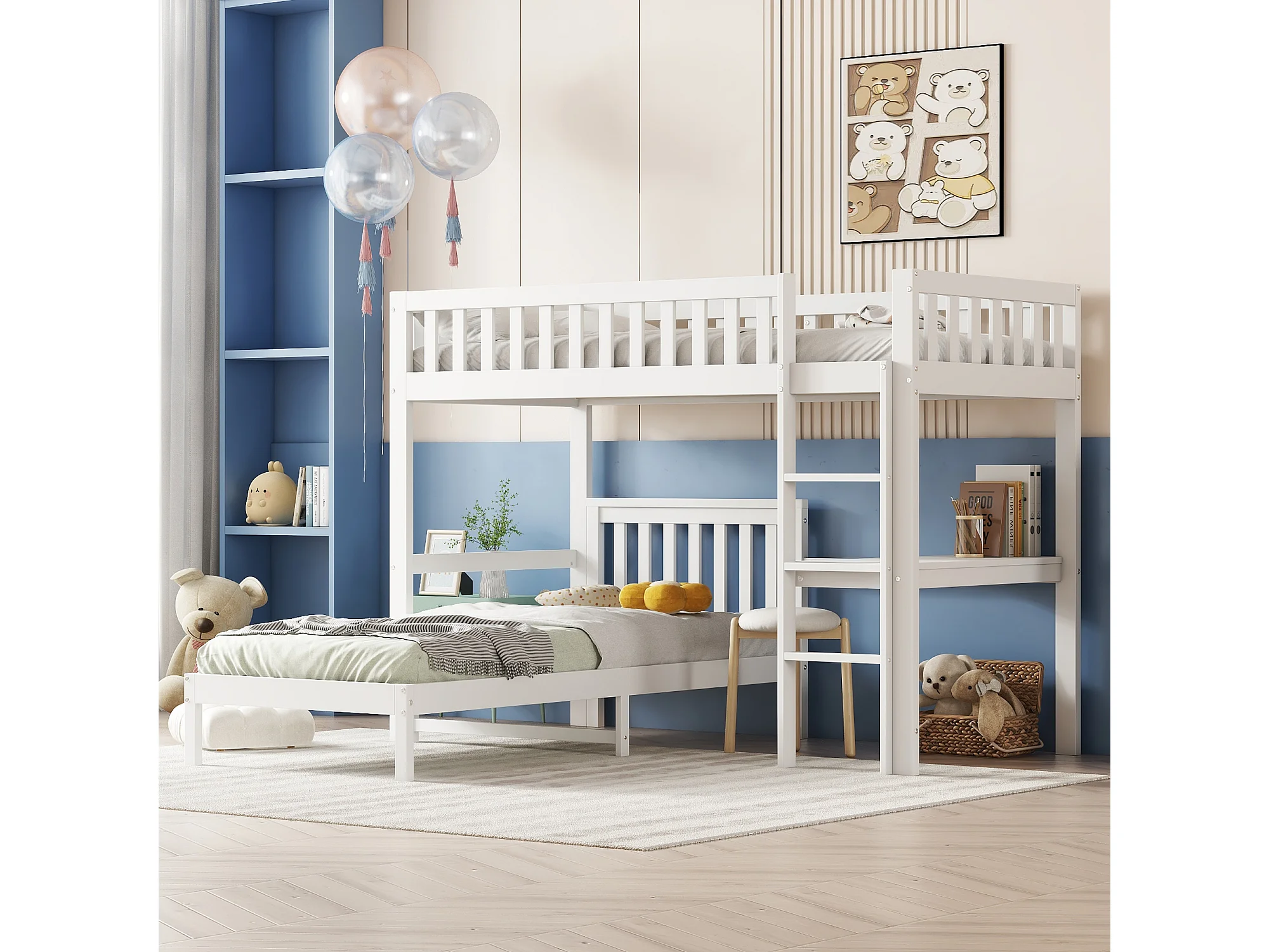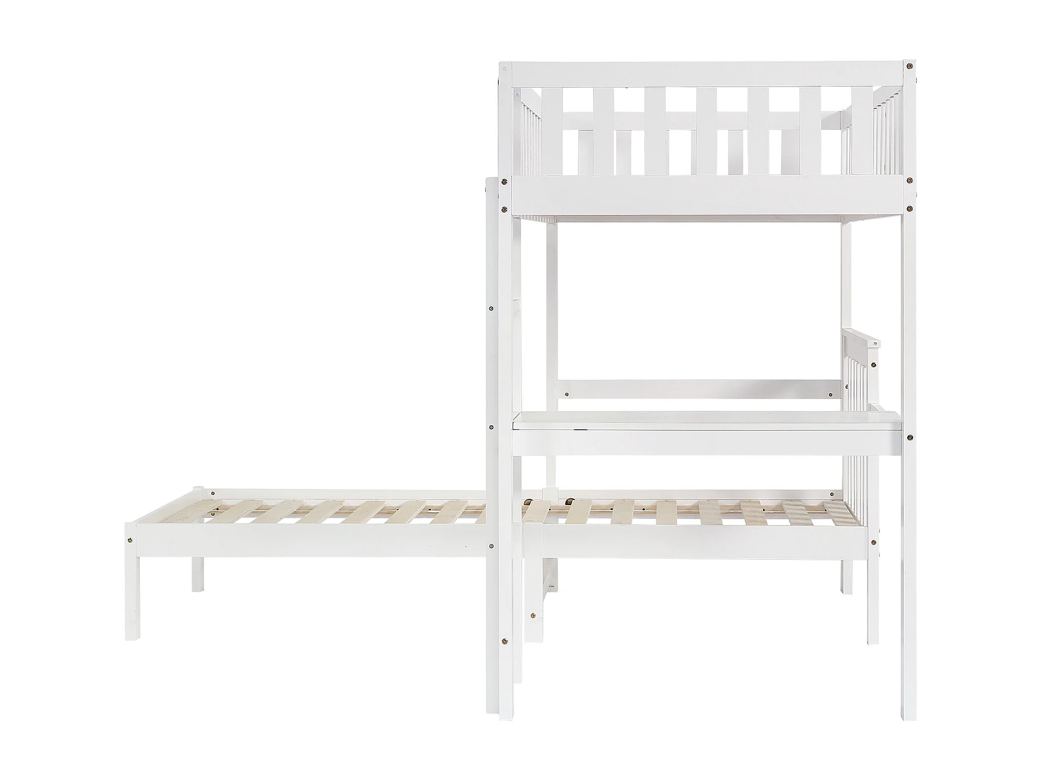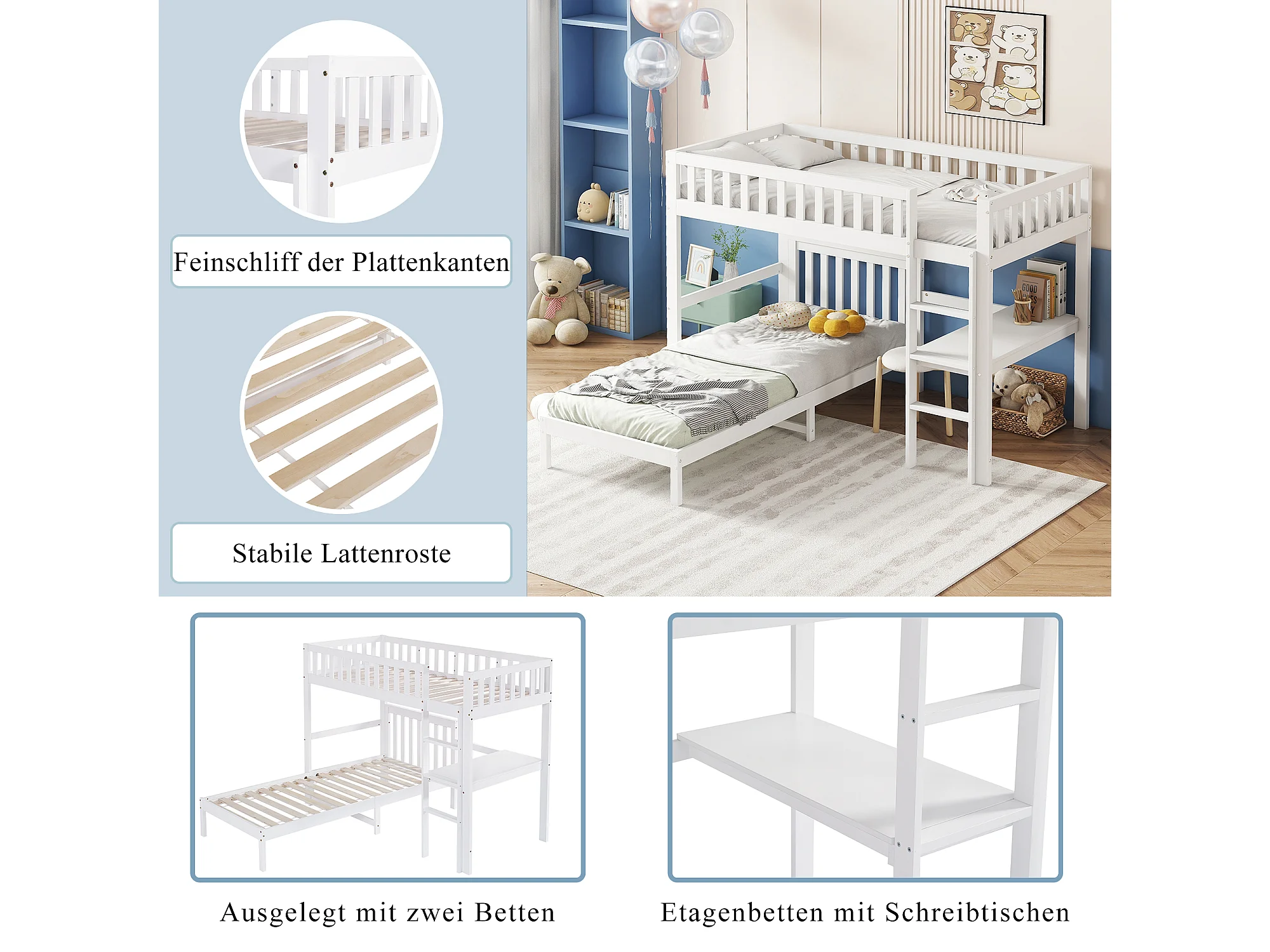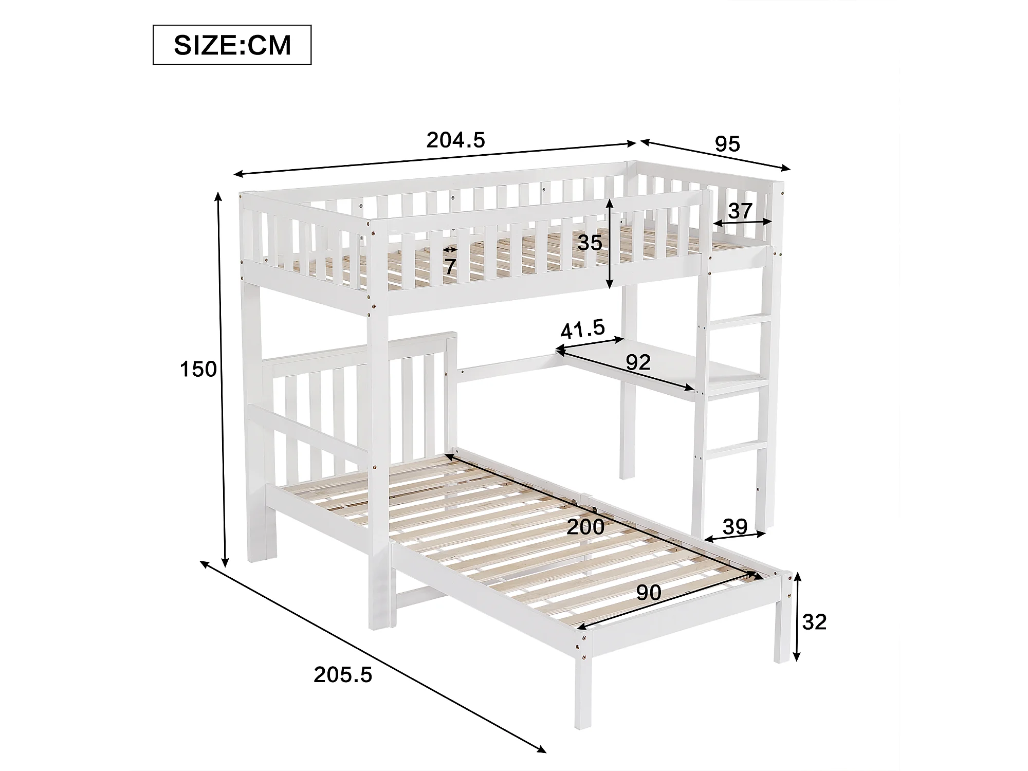 Lit Superposé 90x200cm avec un bureau,échelle à trois niveaux et sommiers stables,cadre en pin,Blanc
