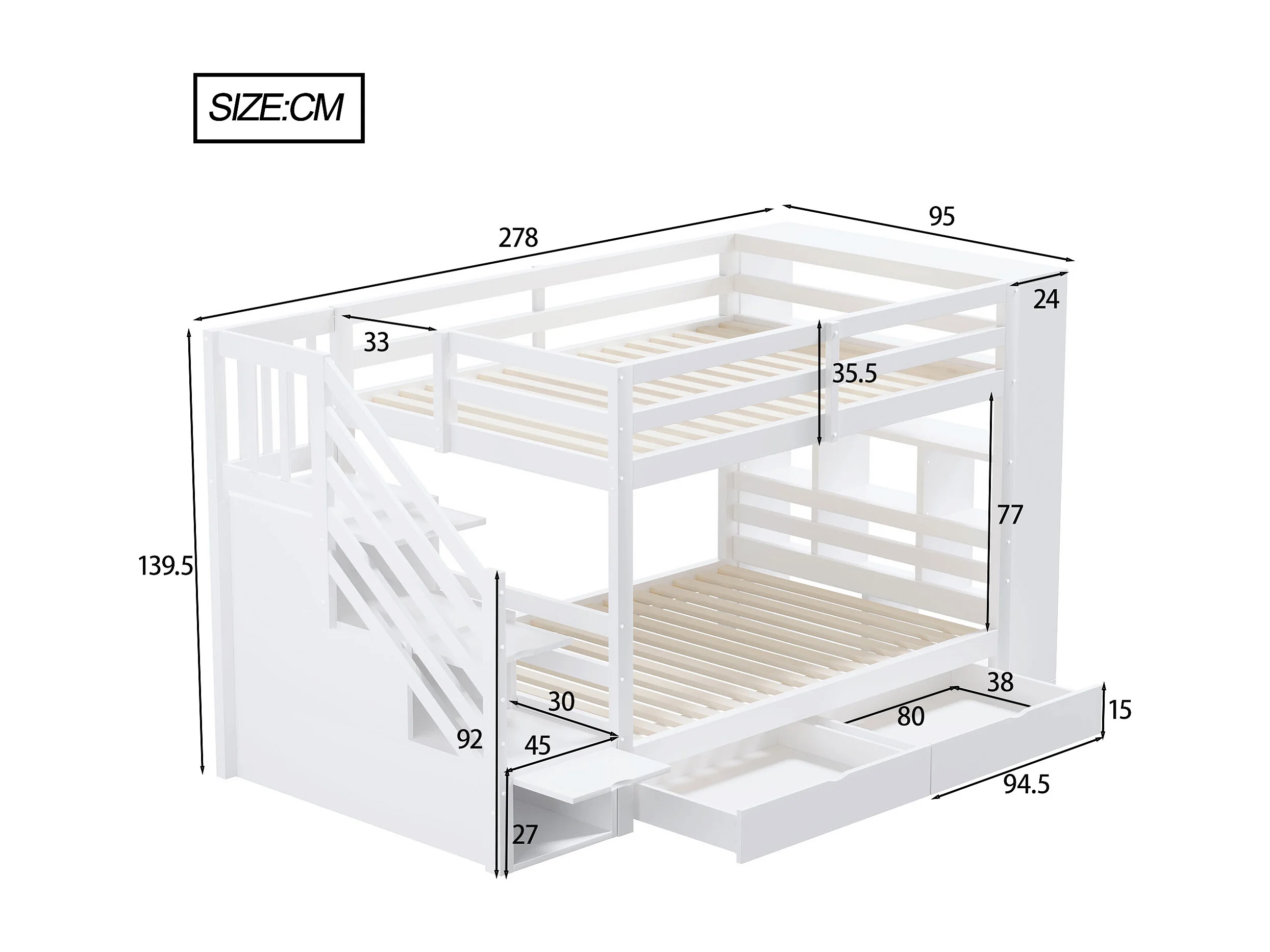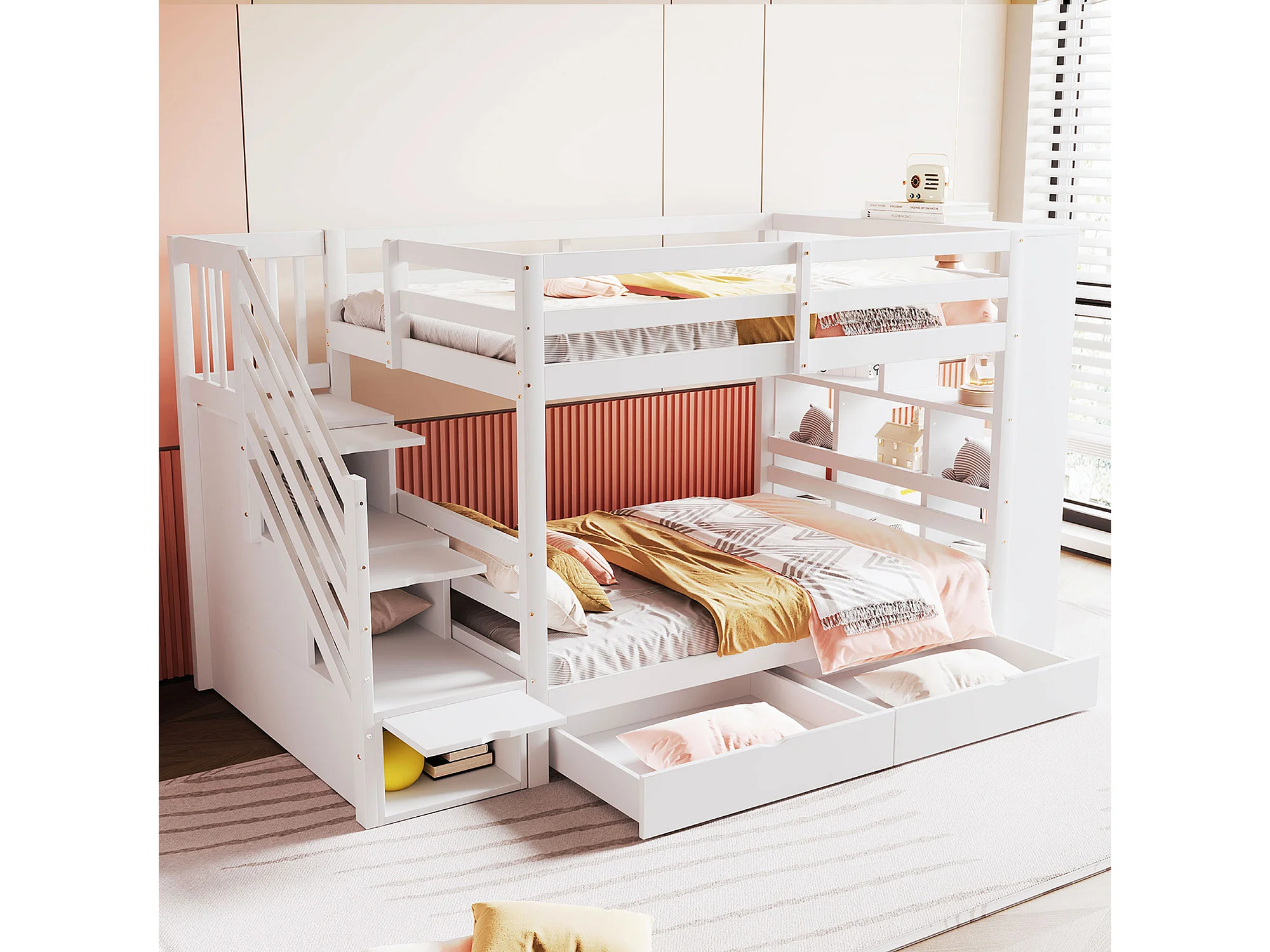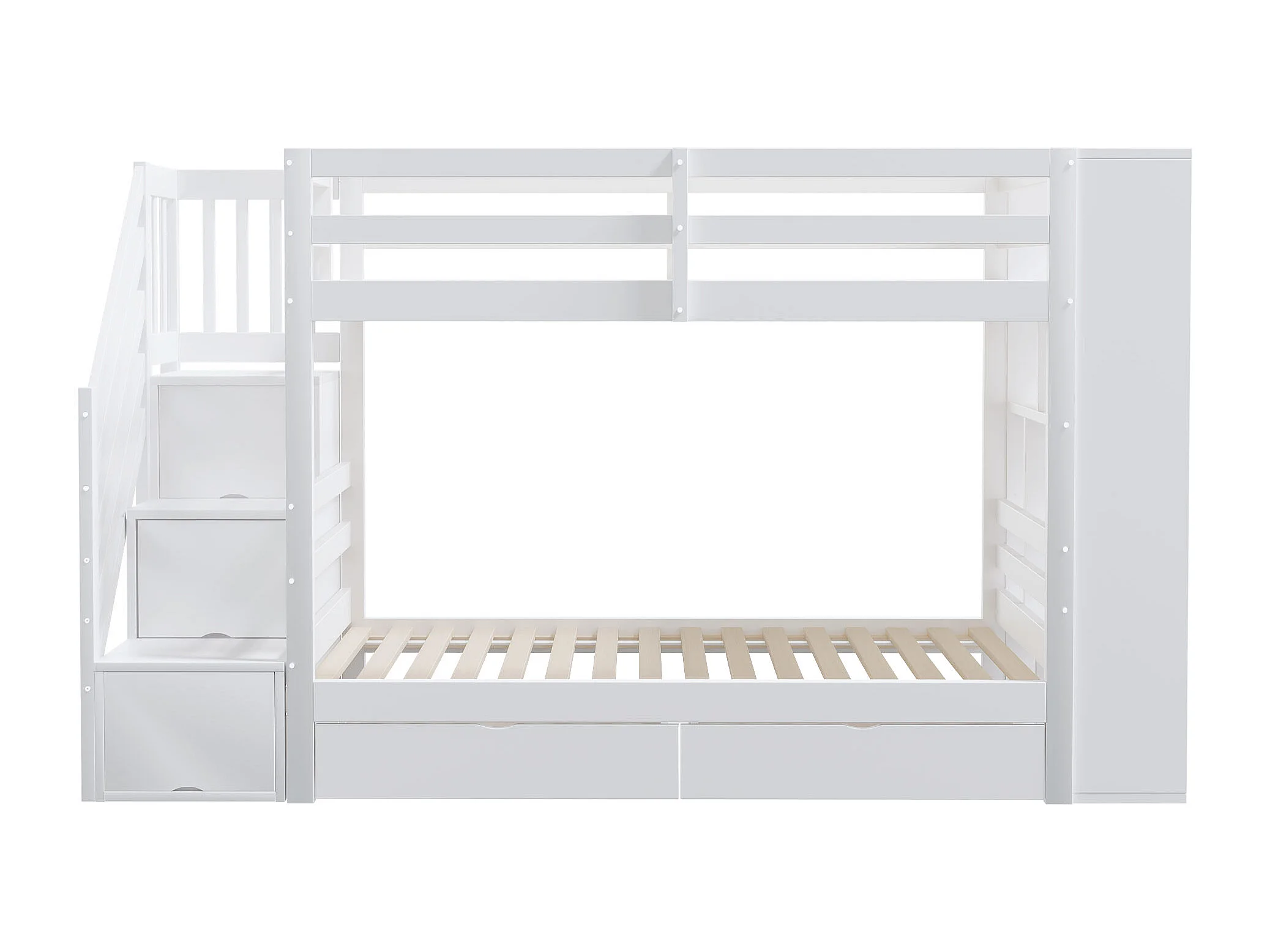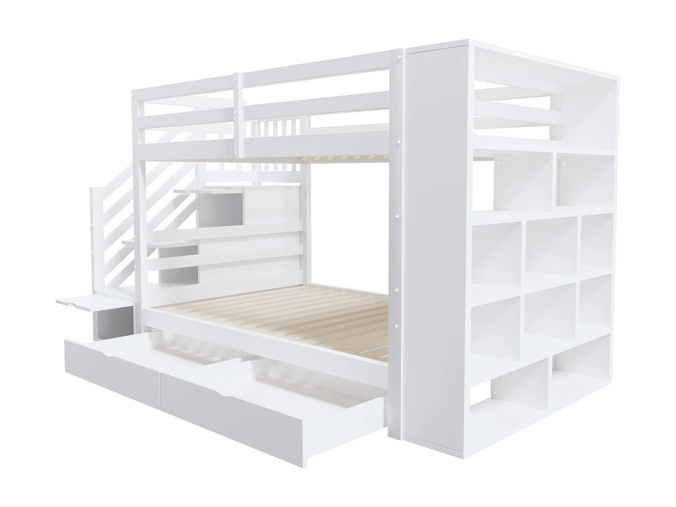 Lit superposé 90x200cm design gain de place escalier coffre de rangement bois blanc pour chambre enfant (Sans matelas)
