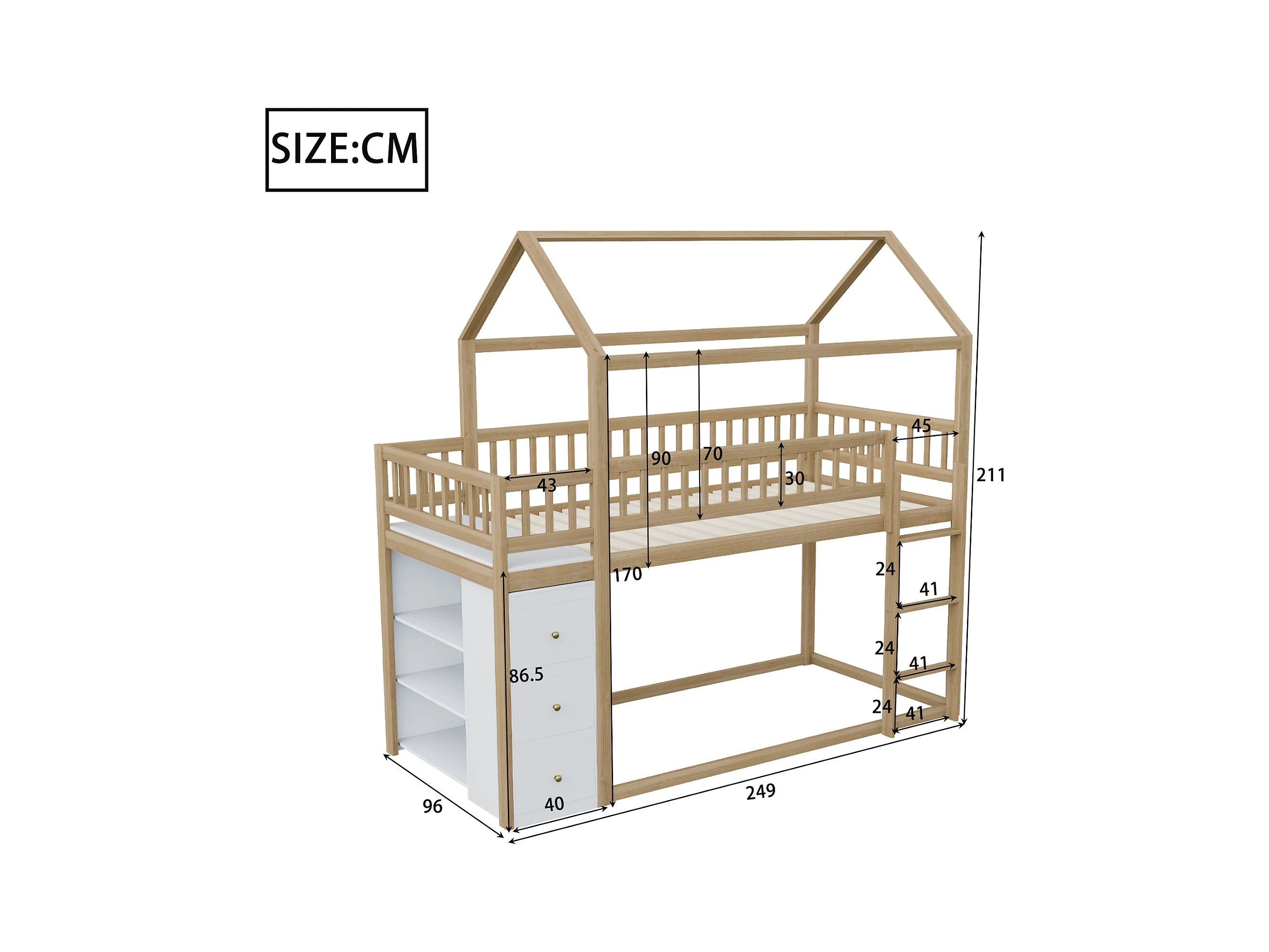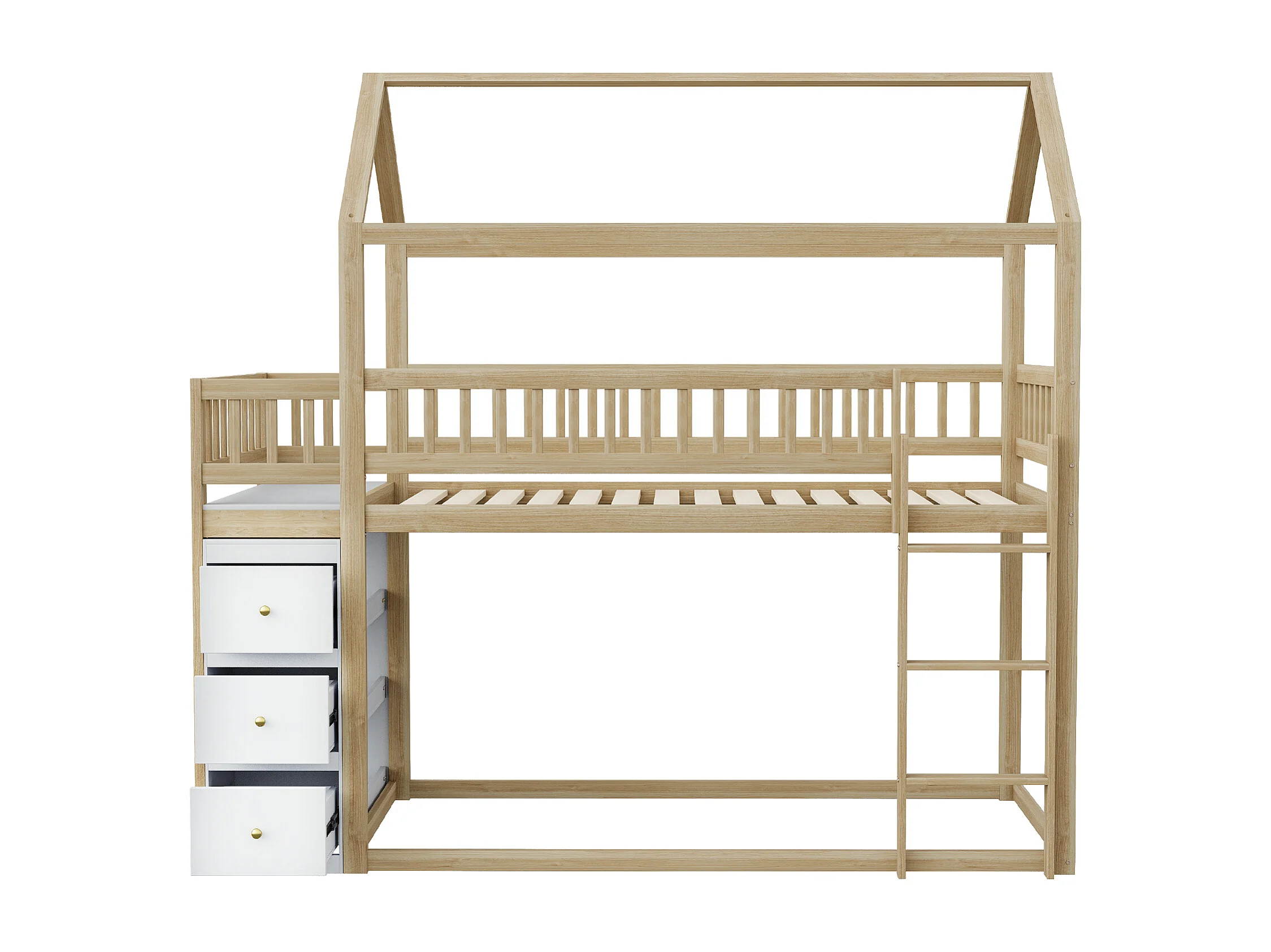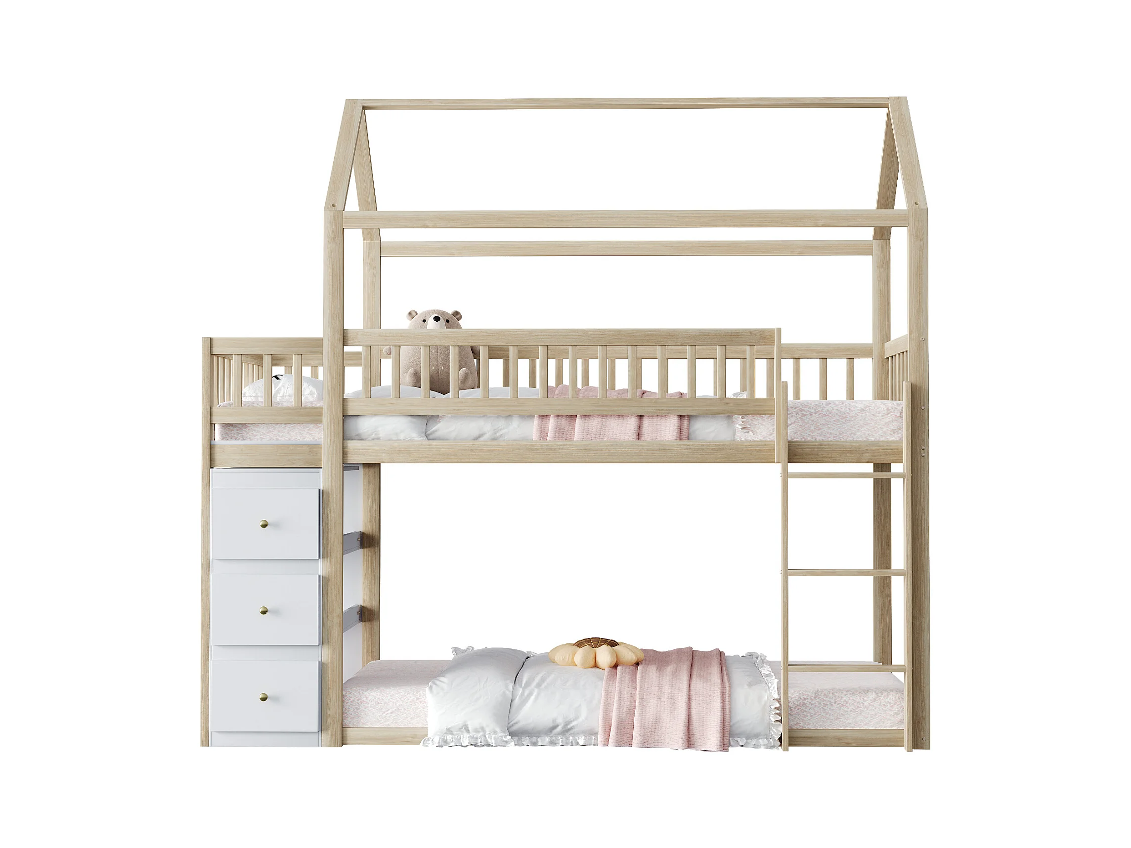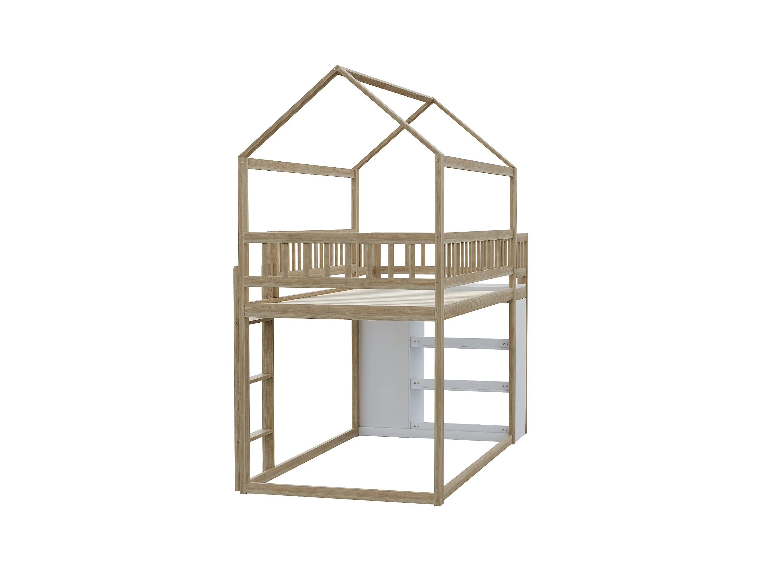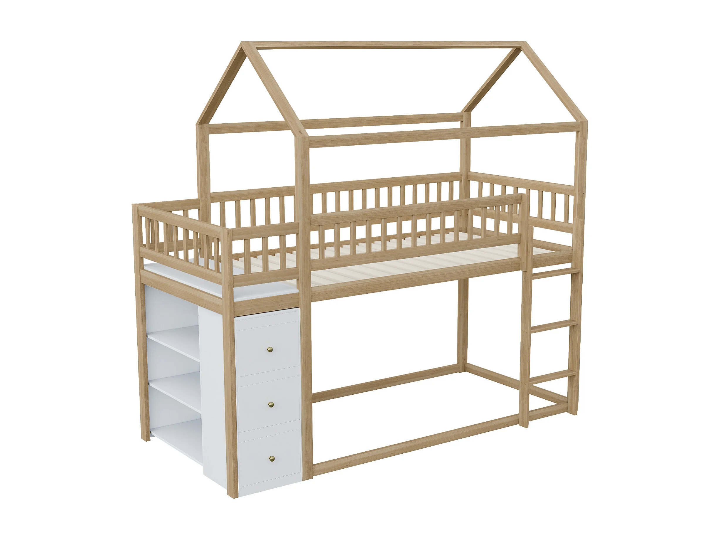 Lit superposé 90x200cm en bois massif - avec tiroirs + étagères - Naturel