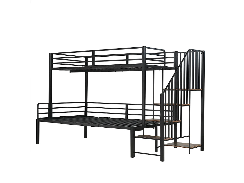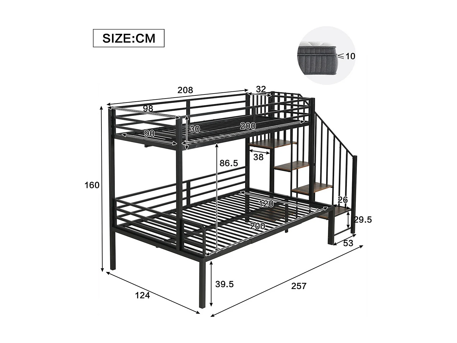 Lit superposé 90x200cm et 120x200cm, lit en fer avec armoire d'angle de rangement, fer + MDF, couleur noir + bois vintage