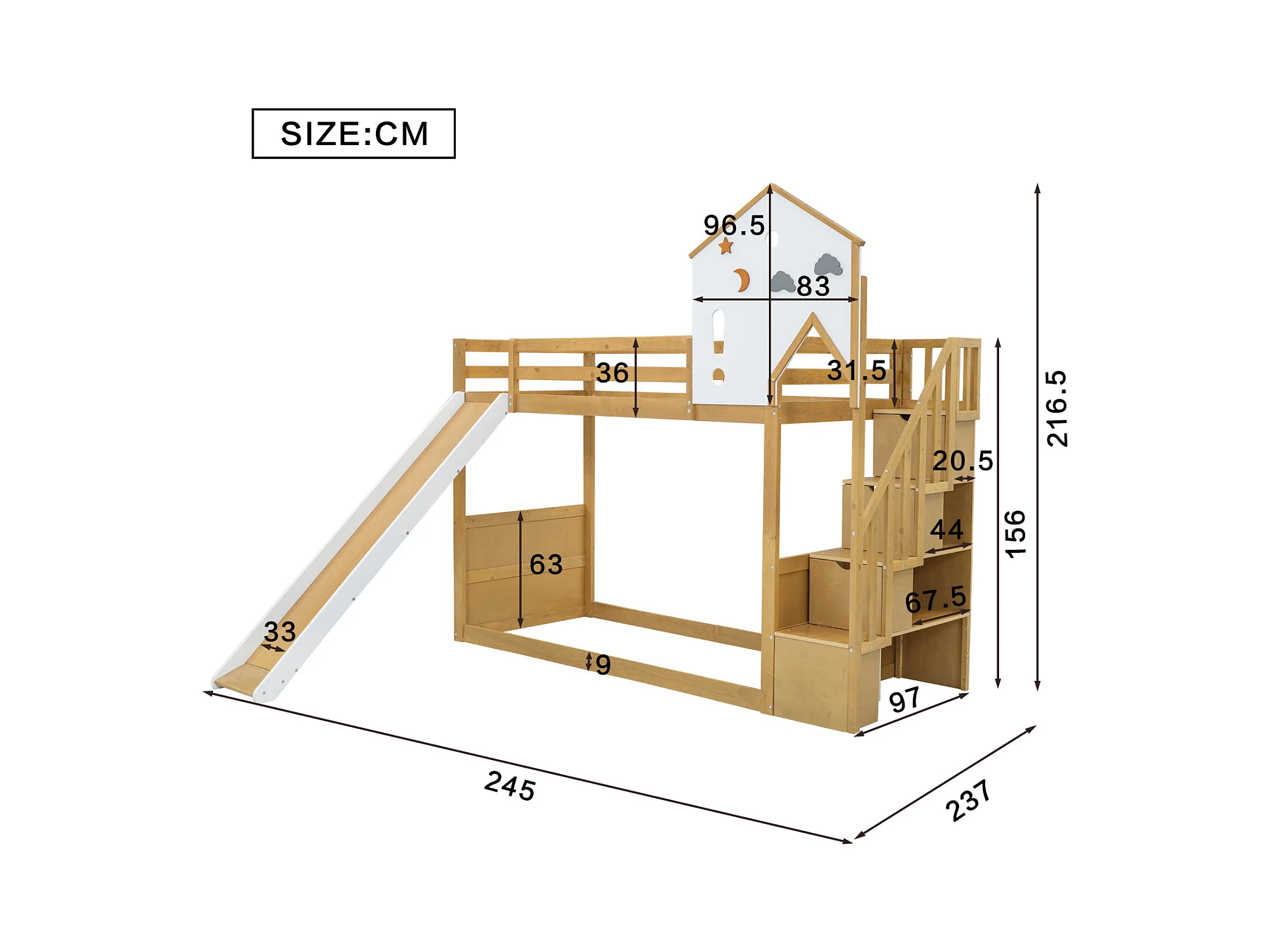 Lit superposé 90x200cm - lit cabane enfant avec toit, fenêtre, 3 casiers dans l'escalier, toboggan, pin+MDF, blanc+naturel