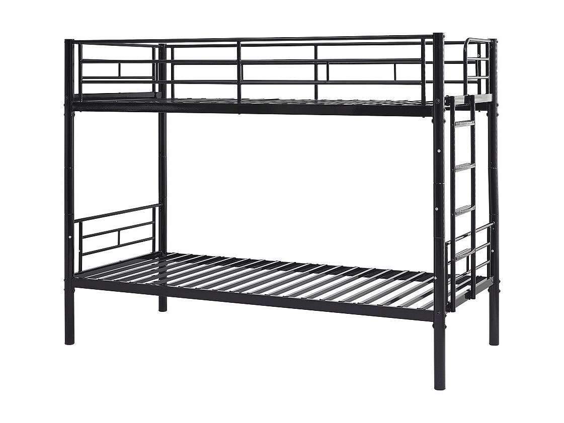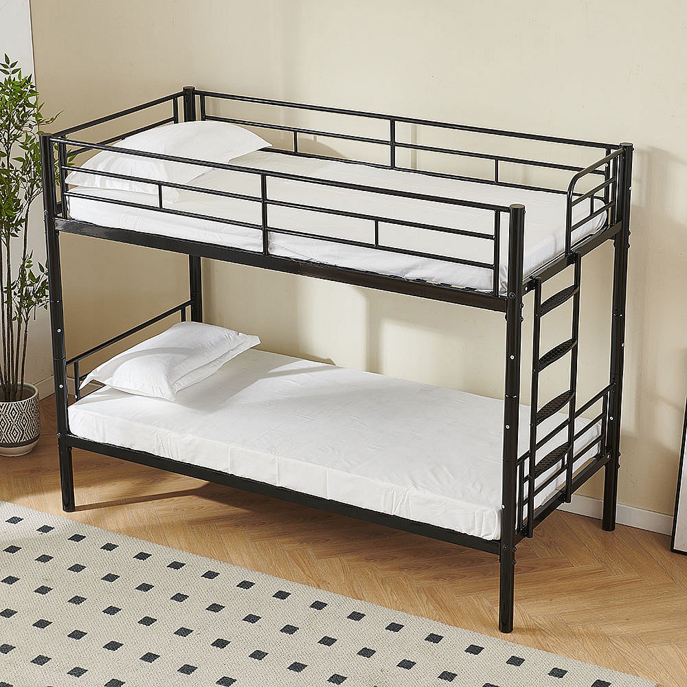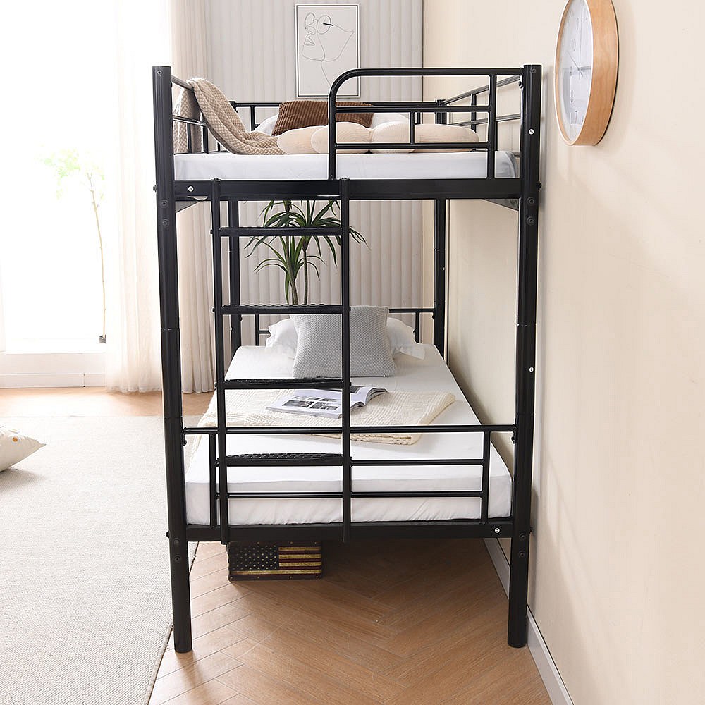 Lit superposé 90x200cm, lit d'enfant avec barrière de sécurité, sommier à lattes et escalier antidérapant, convertible en 2 lits simples, métal, noir